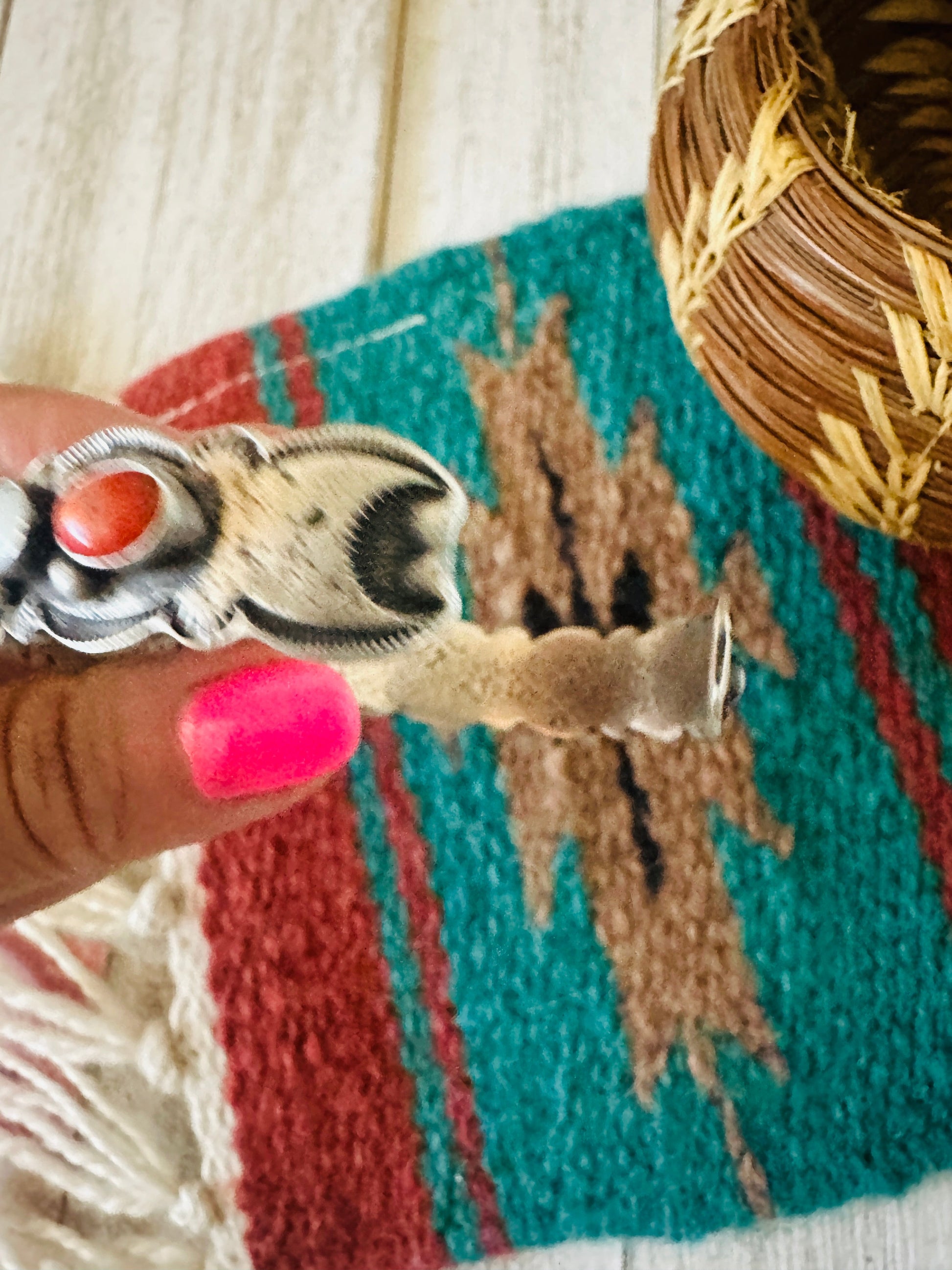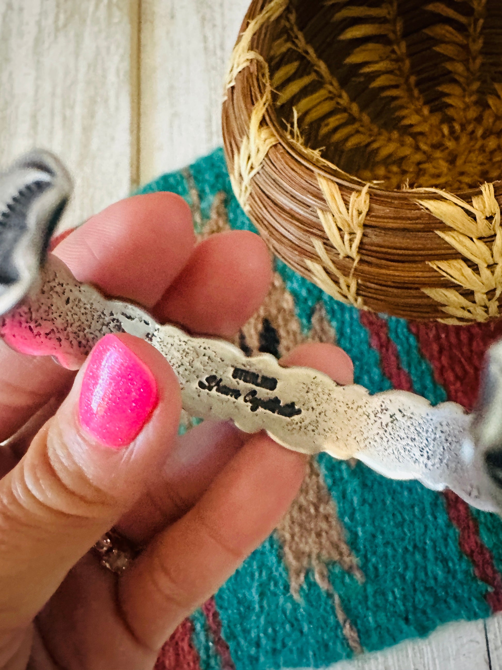 Gorgeous Navajo Lapis, Coral, and Mother of Pearl Sterling Silver Cuff Bracelet. Gorgeous hand crafted Sterling Silver. Cuff has an inside circumference of 5 1/2 inches with a gap of 1 1/8 inches. Width is 1/2 of an inch. Signed by the artist Shawn Cayatineto and stamped Sterling. Such a pretty piece!