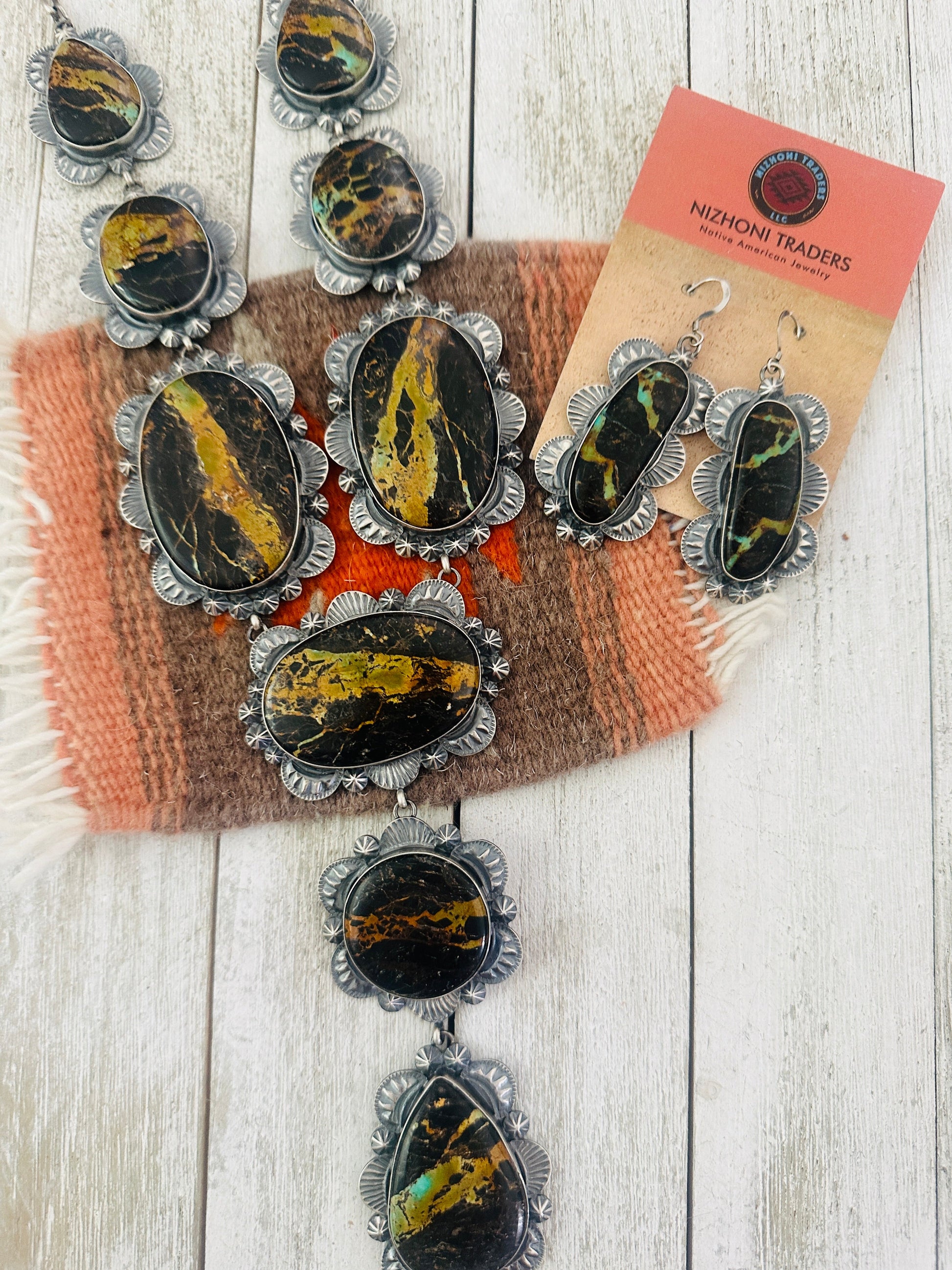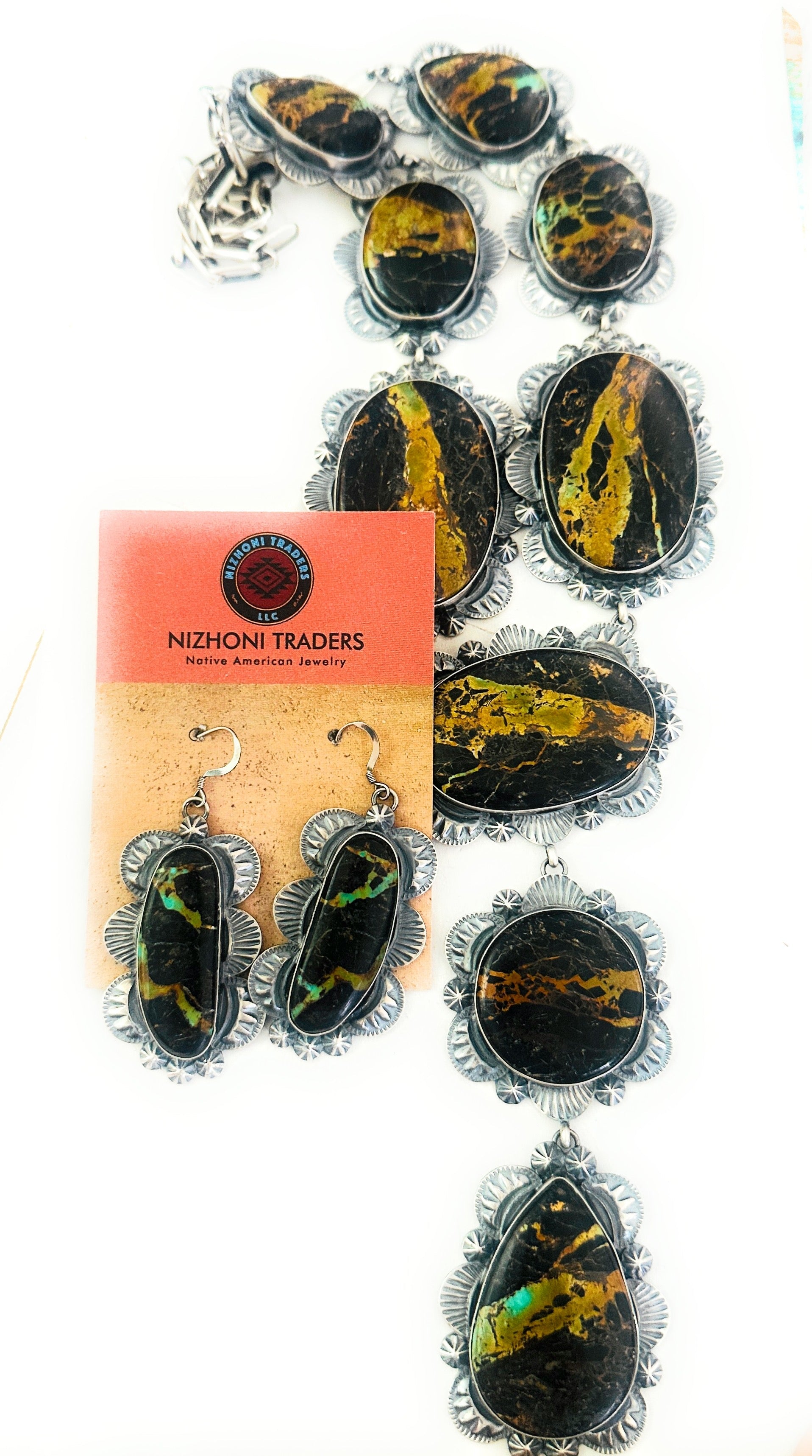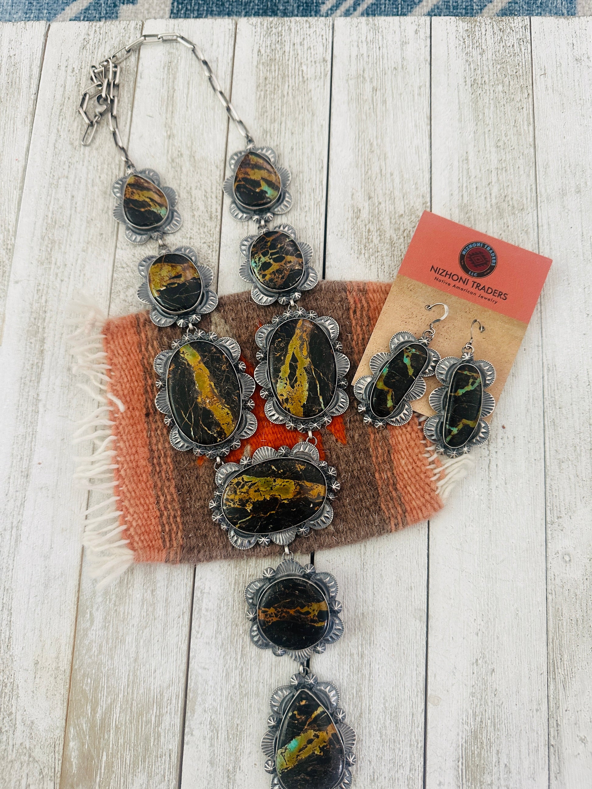 Absolutely stunning! Navajo Black Jack Turquoise & Sterling Silver Necklace Set. This set is incredibly gorgeous! Necklace measures 24 inches long. Center pendant measures 6 1/4 inches long. Matching earrings measure 2 3/4 inches long and 1 3/8 inches wide. Signed by the artist and stamped Sterling. So stunning!