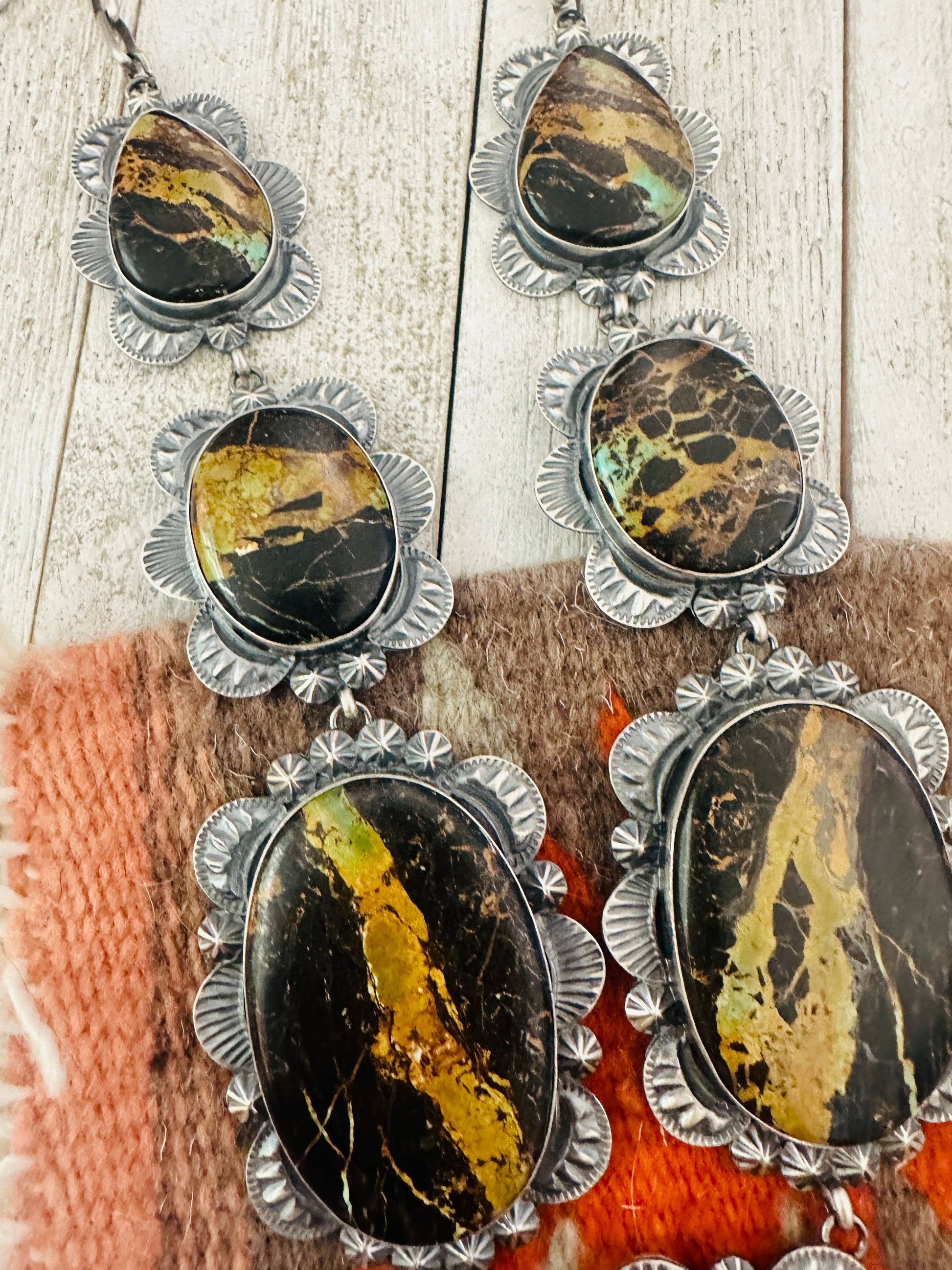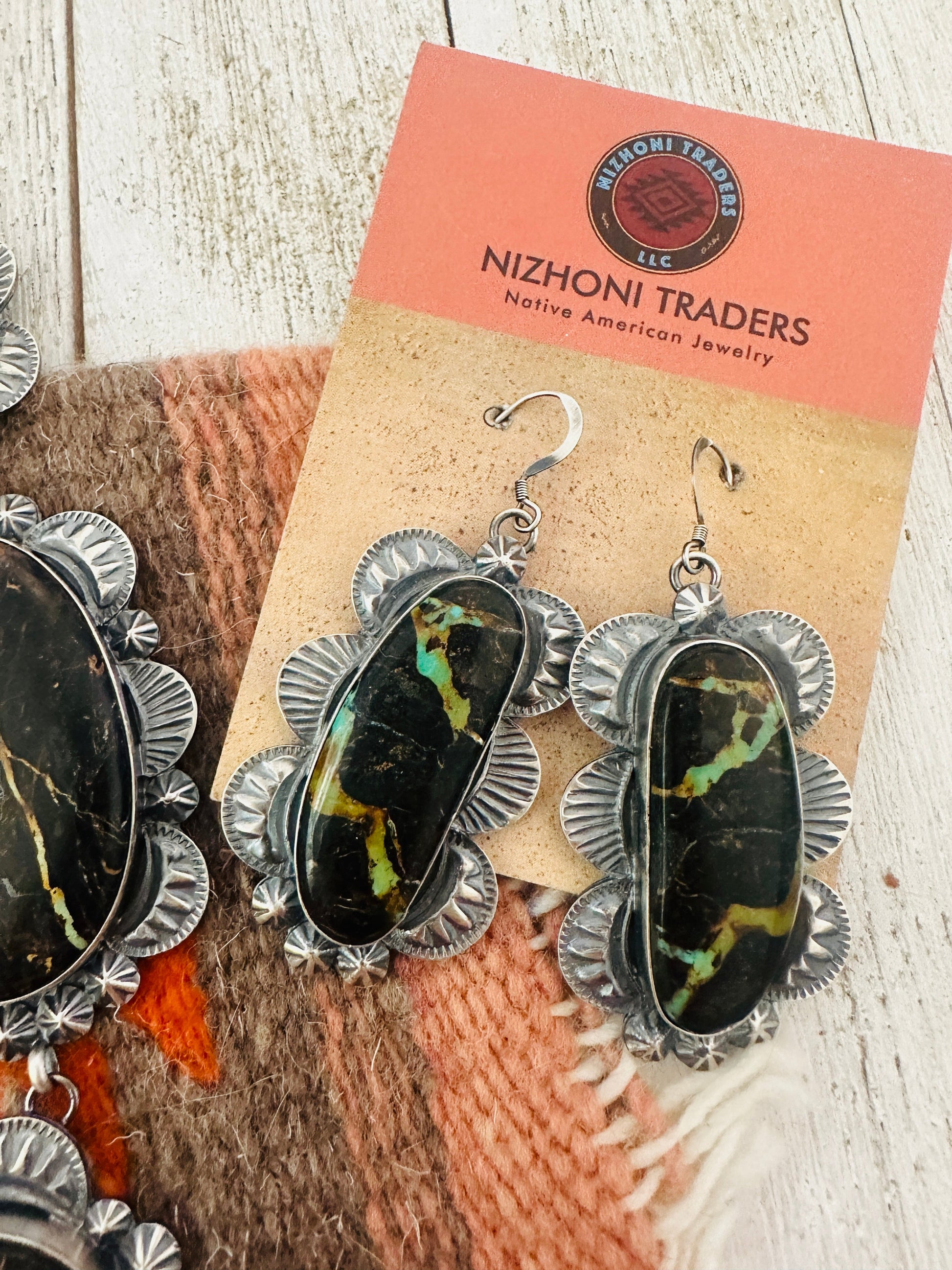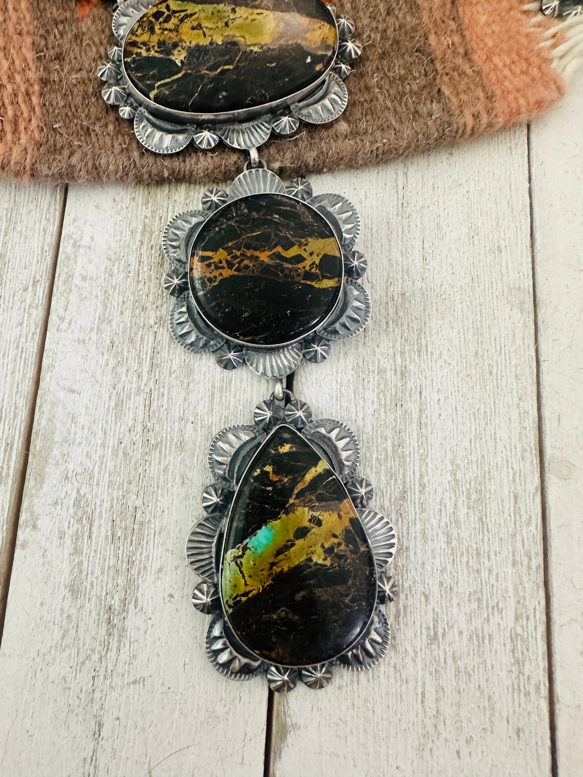 Absolutely stunning! Navajo Black Jack Turquoise & Sterling Silver Necklace Set. This set is incredibly gorgeous! Necklace measures 24 inches long. Center pendant measures 6 1/4 inches long. Matching earrings measure 2 3/4 inches long and 1 3/8 inches wide. Signed by the artist and stamped Sterling. So stunning!