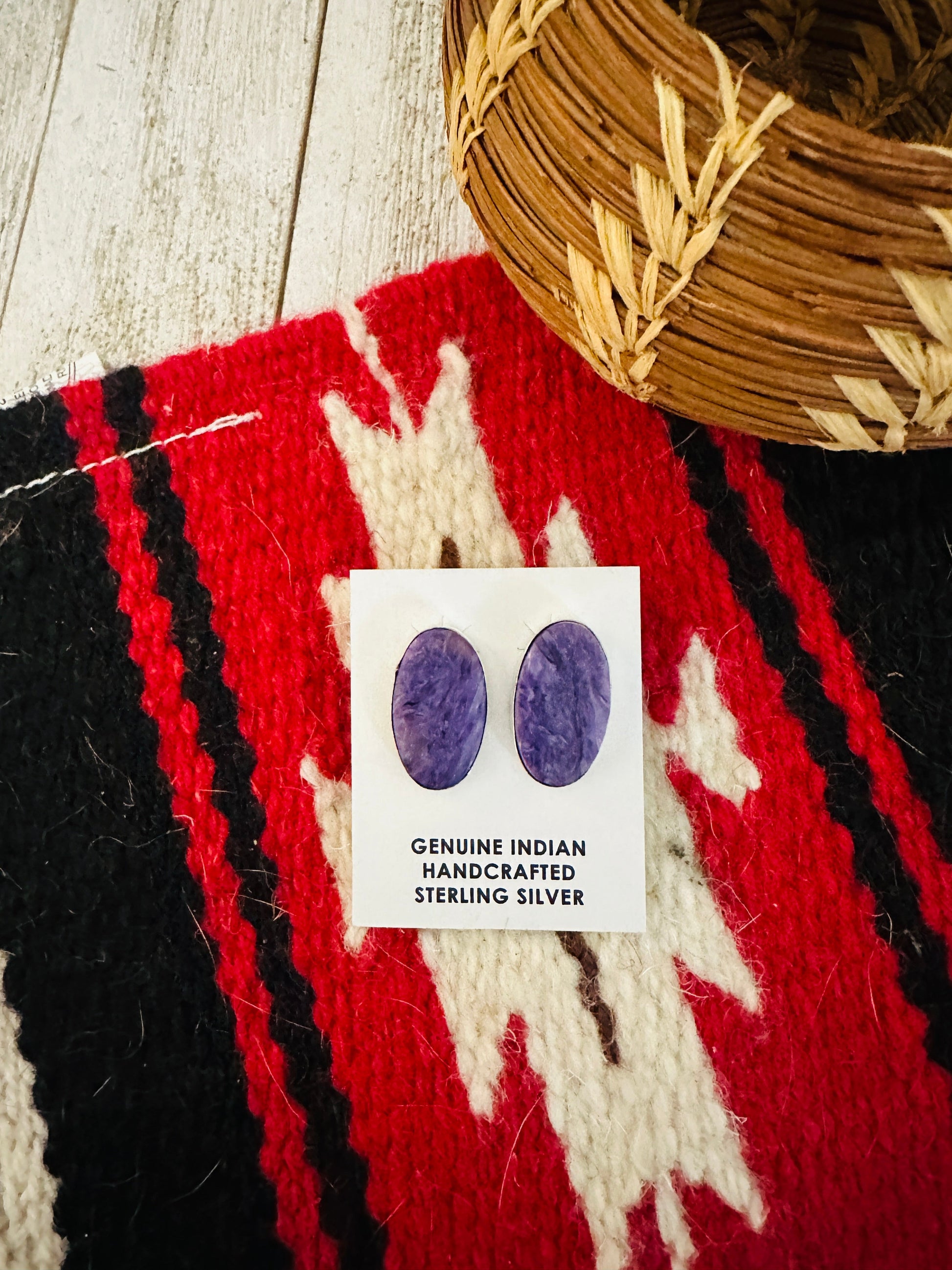 Gorgeous Navajo handmade Charoite and Sterling Silver stud earrings. Stamped Sterling. Beautiful colors in these studs! These beauties measure 7/8 of an inch long and 1/2 of an inch wide.