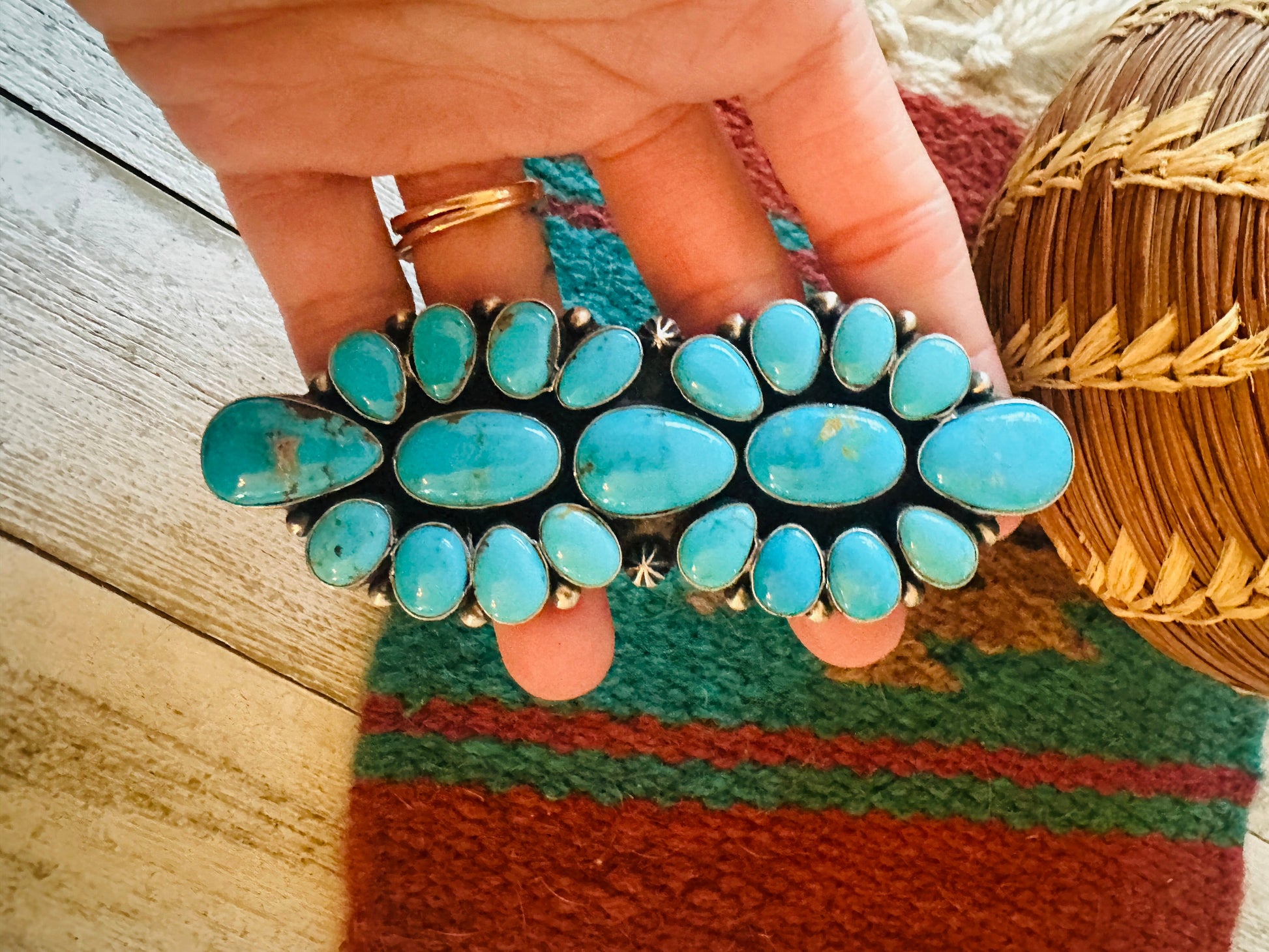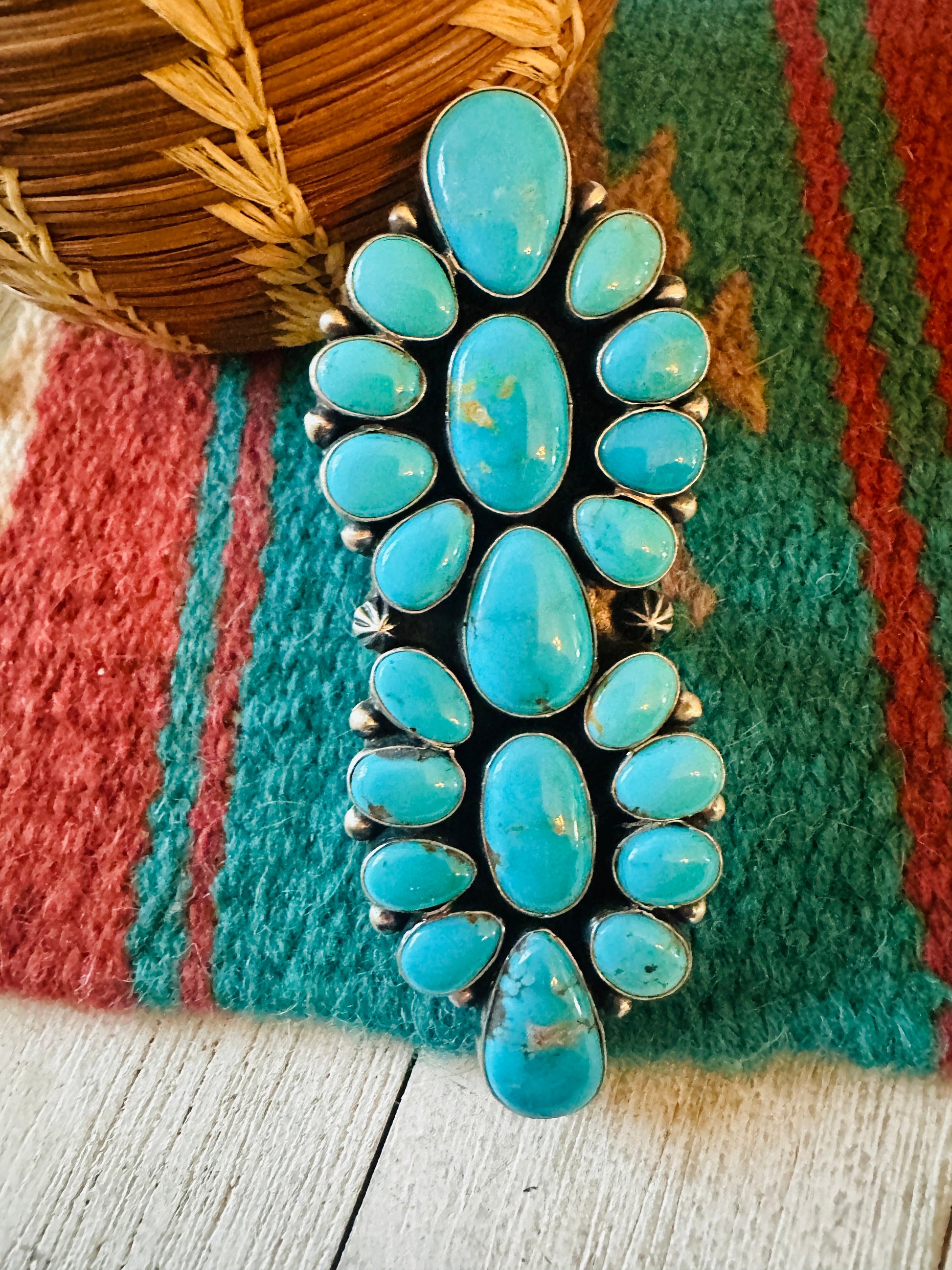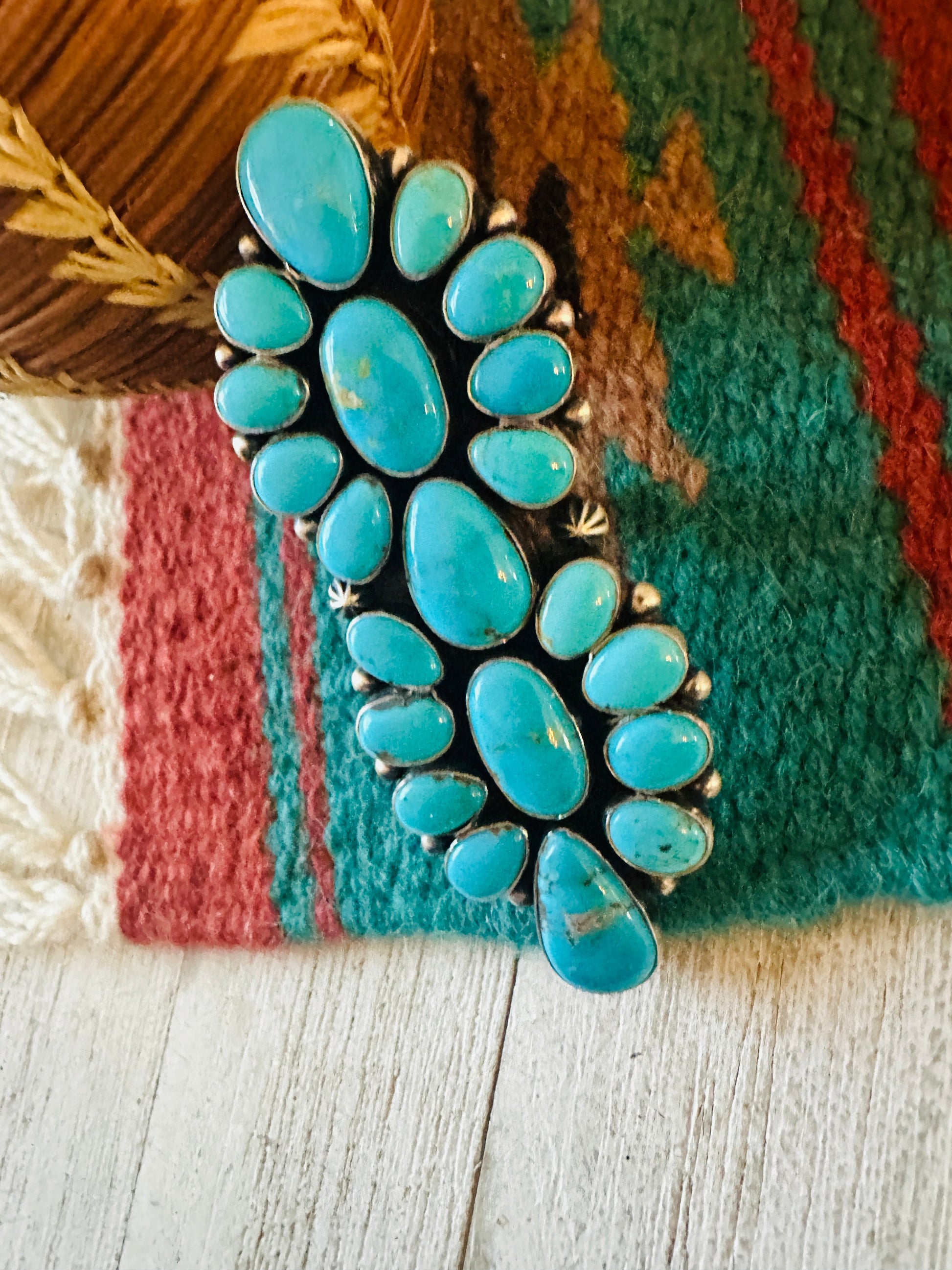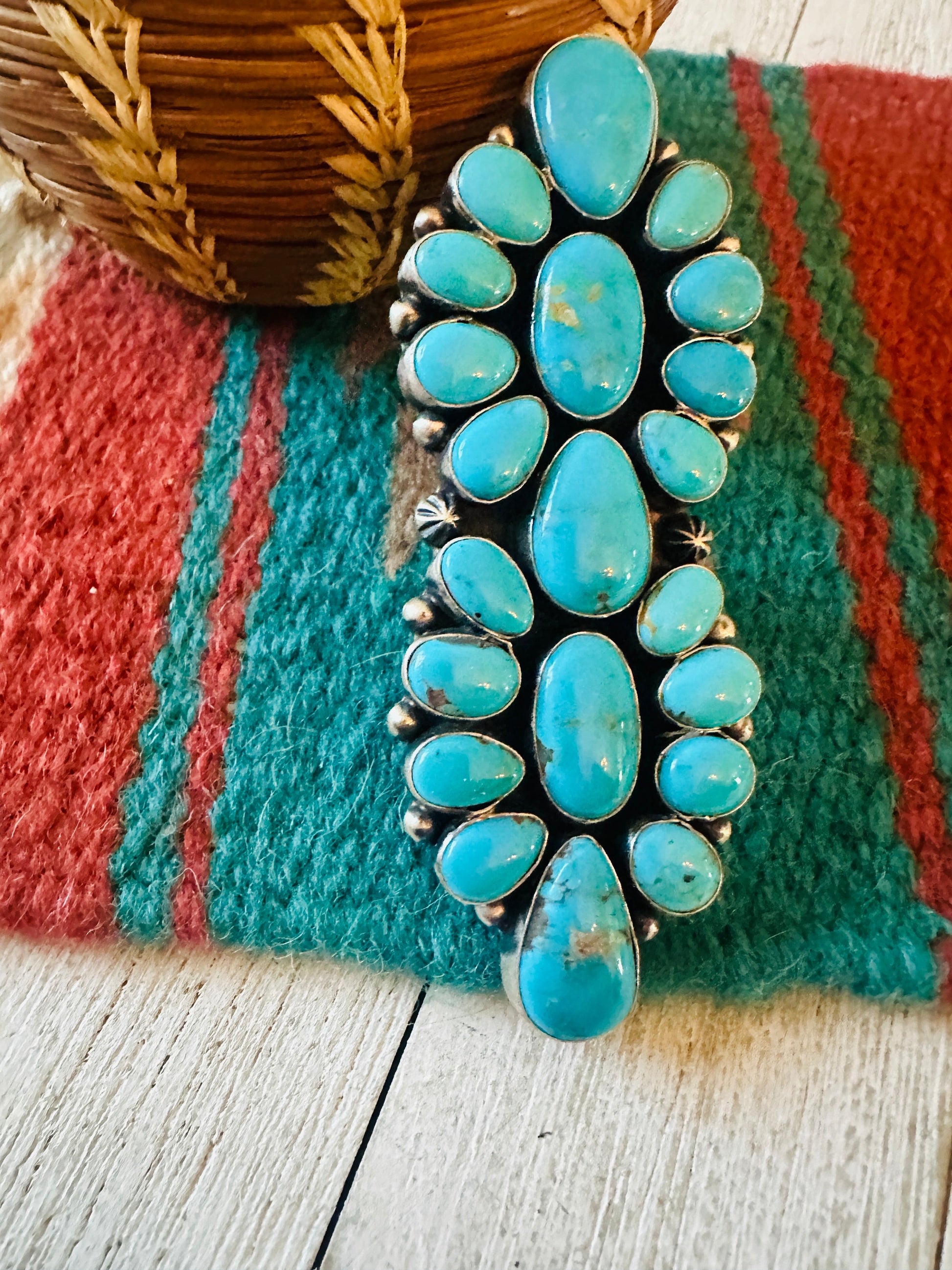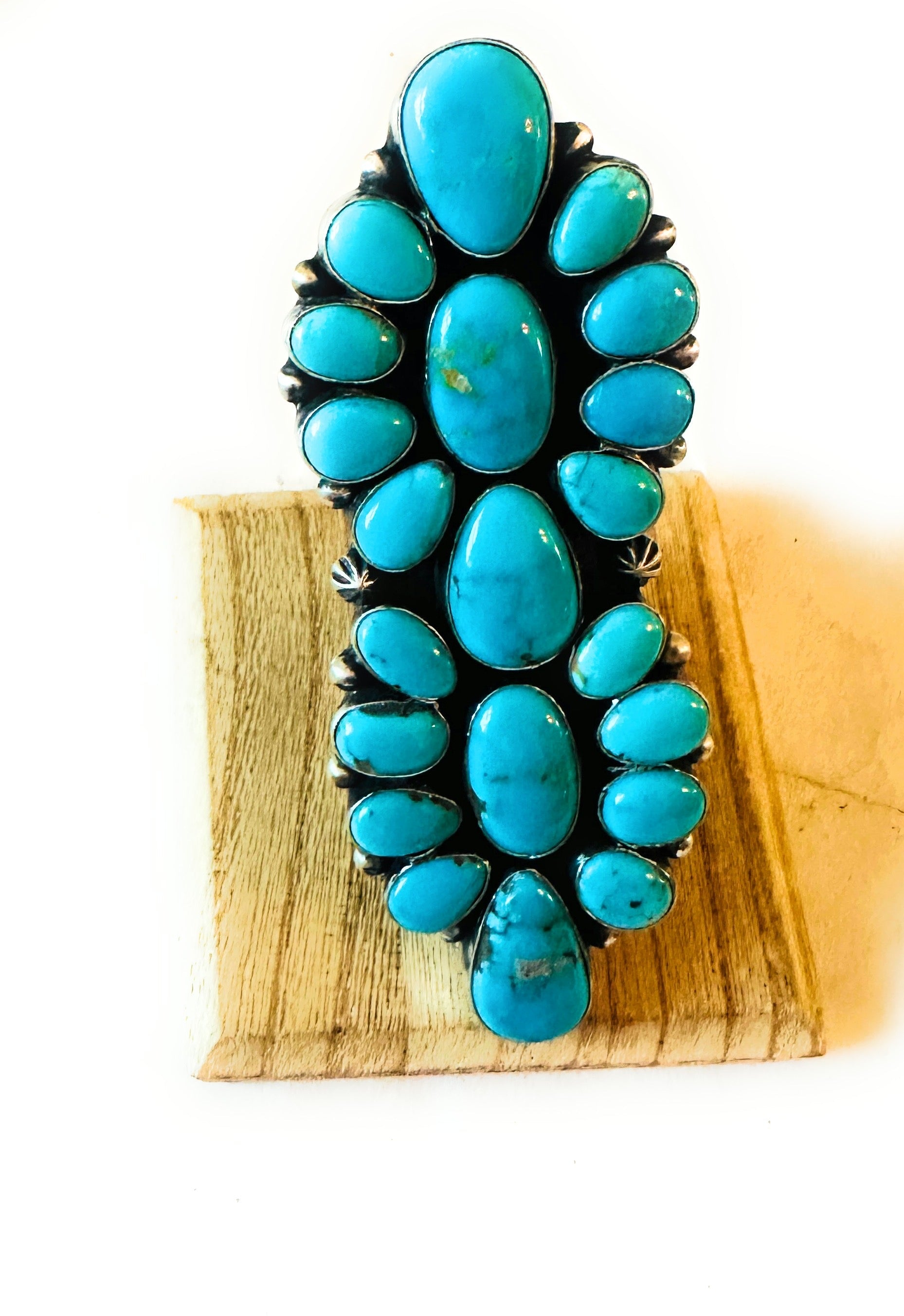 Navajo Sterling Silver and Kingman Turquoise Cluster Statement Ring. Size 10. Such amazing craftsmanship! Stamped Sterling and signed by the artist. Ring face measures 3 3/4 inches long and 1 3/8 inches wide.