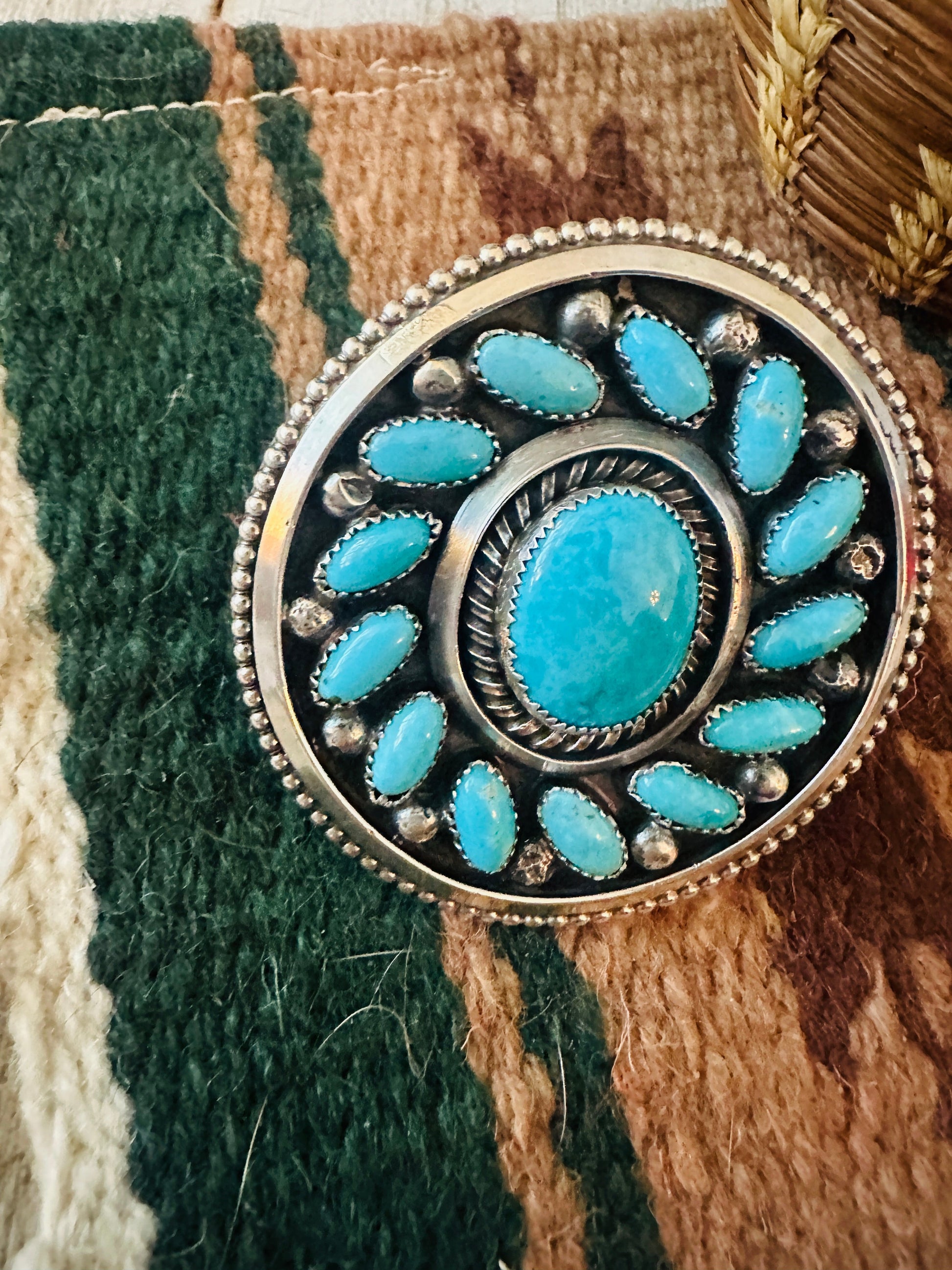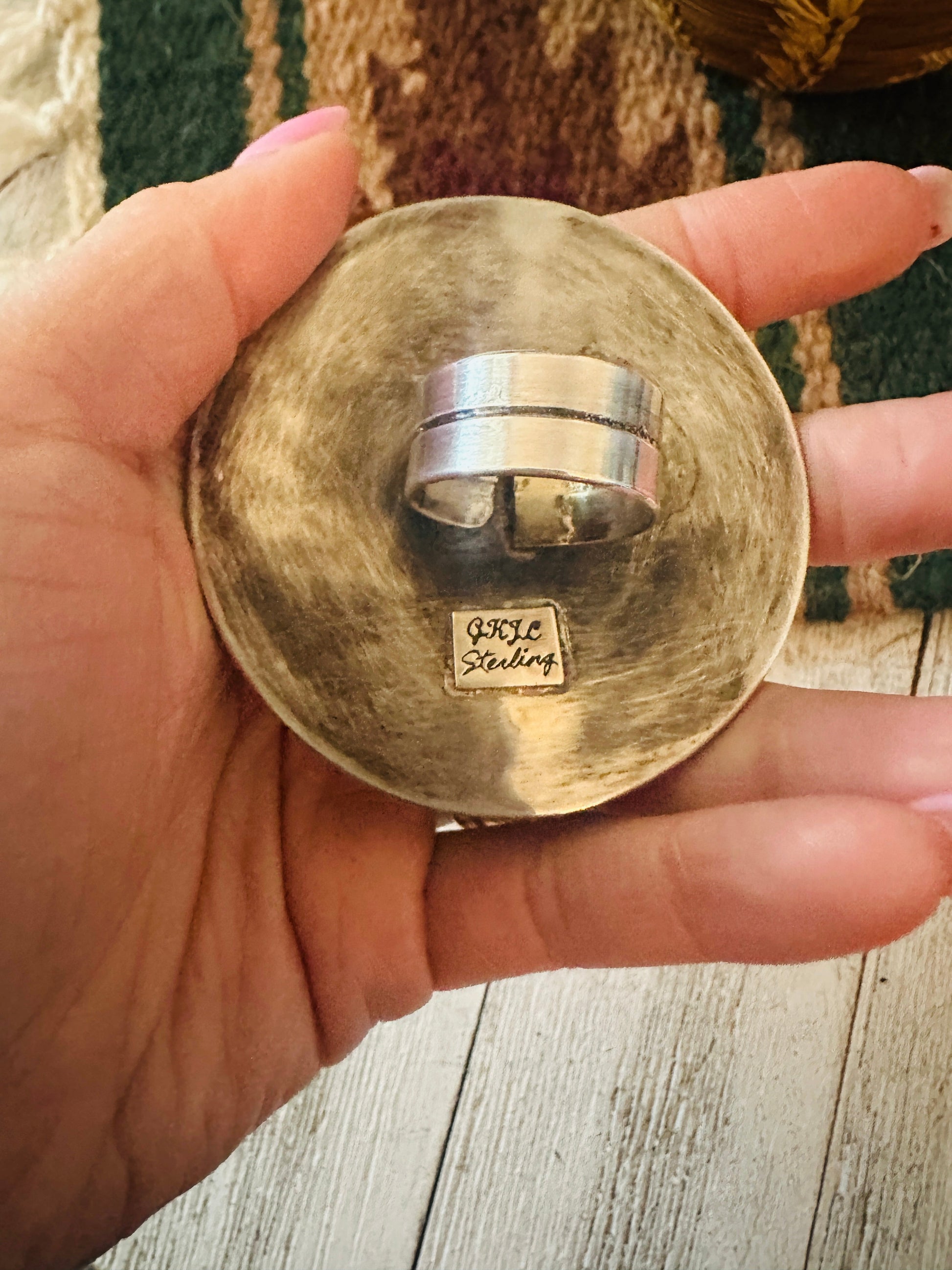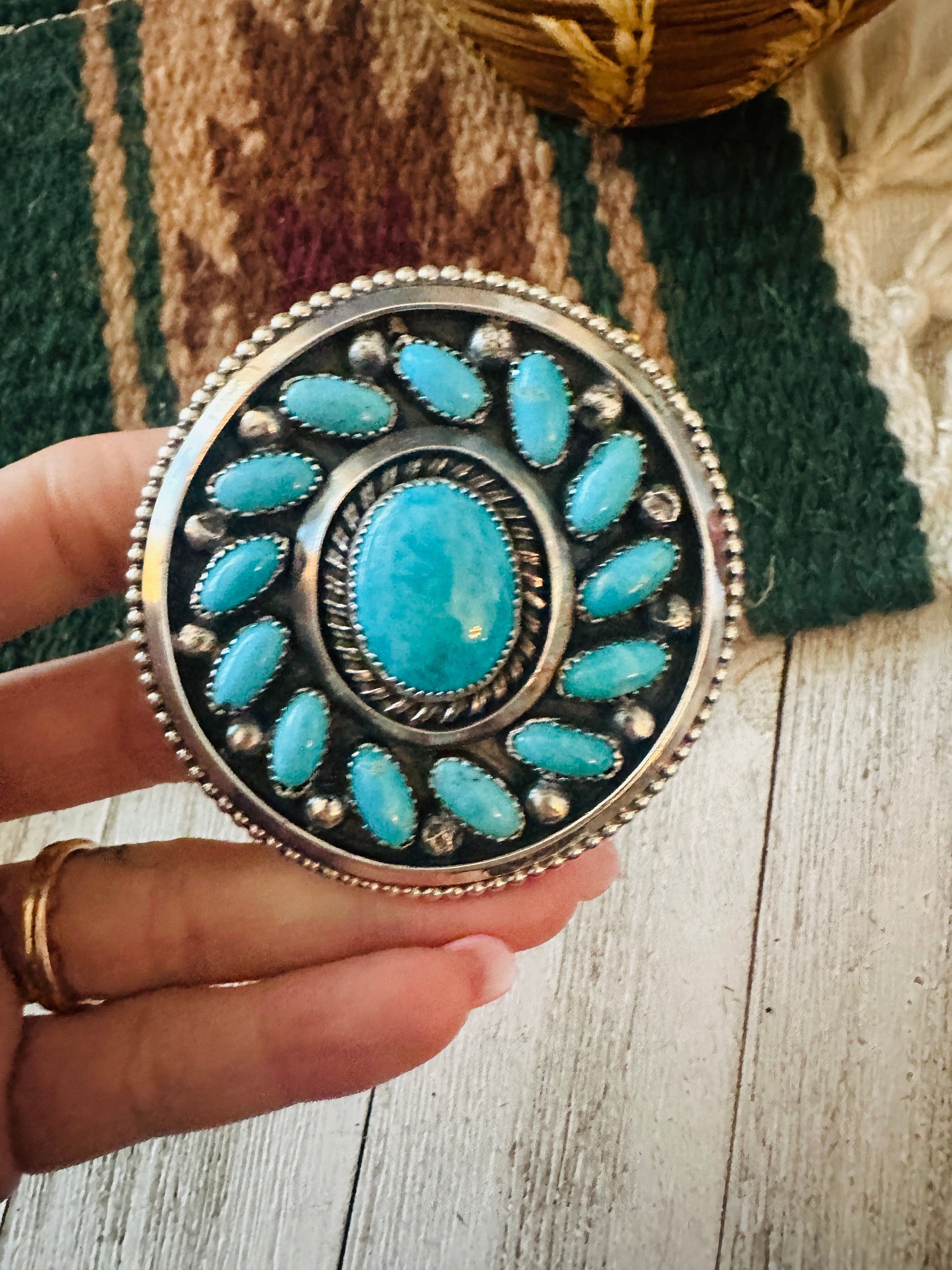 Navajo Sterling Silver and Kingman Turquoise Ring. Size is adjustable. Such amazing craftsmanship! Stamped Sterling and signed by the artist. Ring face measures 2 1/2 inches wide.