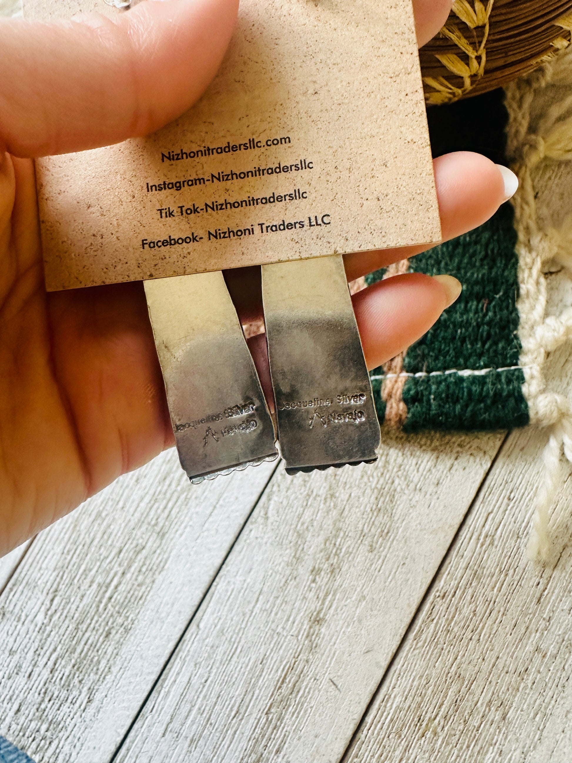 Beautiful Navajo Pink Dream Mojave and Sterling Silver Slab Dangle Earrings. These beauties measure 3 3/8 inches long and 5/8 of an inch wide. Signed by the artist Jacqueline Silver and stamped Sterling. So gorgeous!
