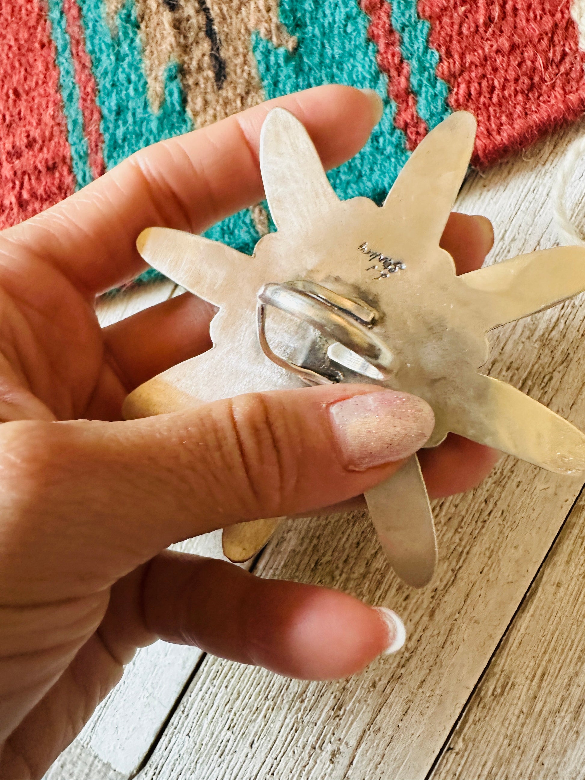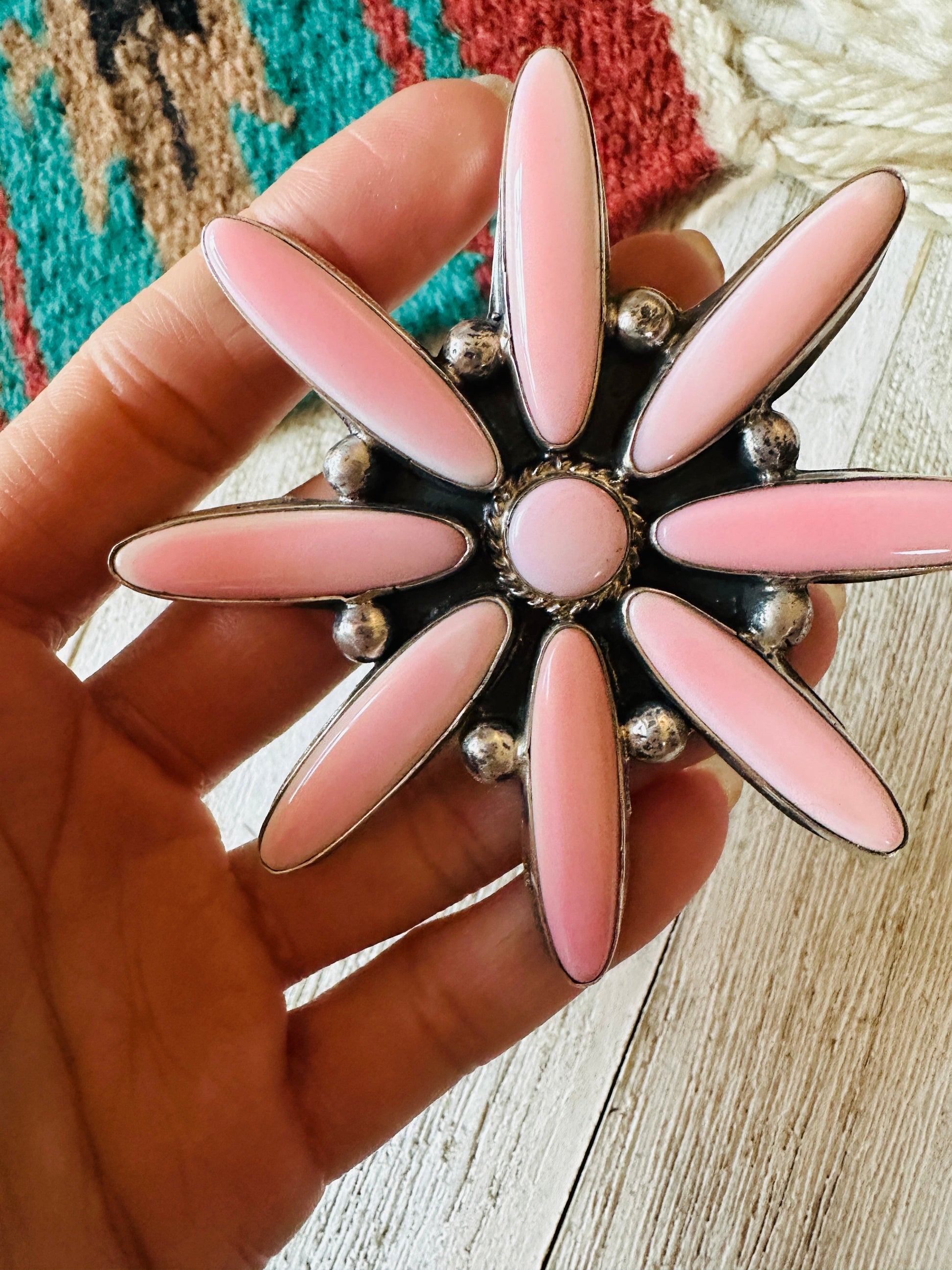 Beautiful Navajo Queen Pink Conch Shell and Sterling Silver Adjustable Flower Ring. Such a pretty craftsmanship on this ring! Ring face measures 3 3/8 inches wide. Stamped Sterling and signed by the artist.