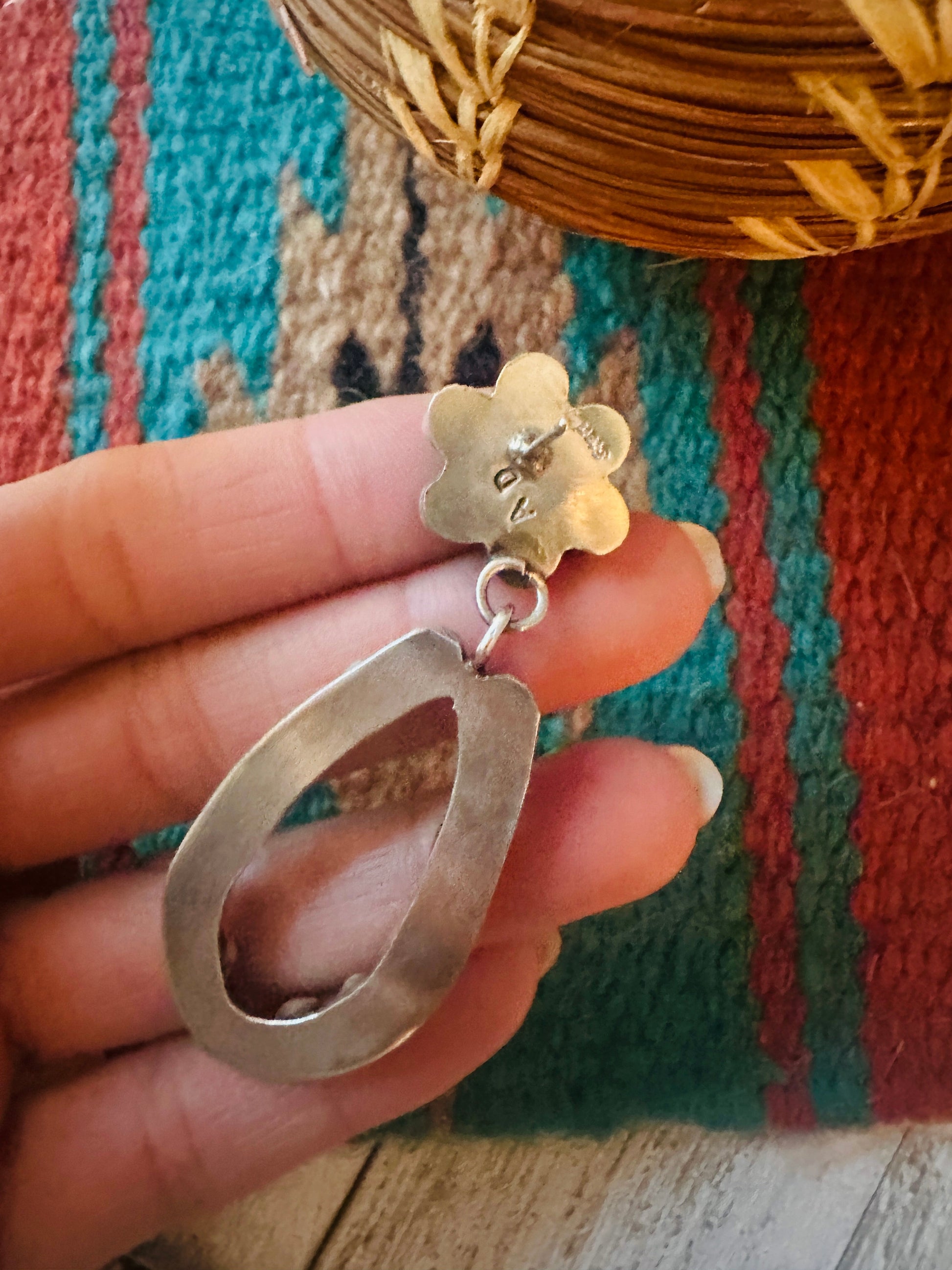 These are a beautiful pair of Navajo Sterling Silver and Queen Pink Conch Shell cluster dangle earrings. These measure 2 1/2 inches long and 1 inch wide. Beautiful pink stones! Stamped Sterling and signed by the artist. Stones are natural and will vary.