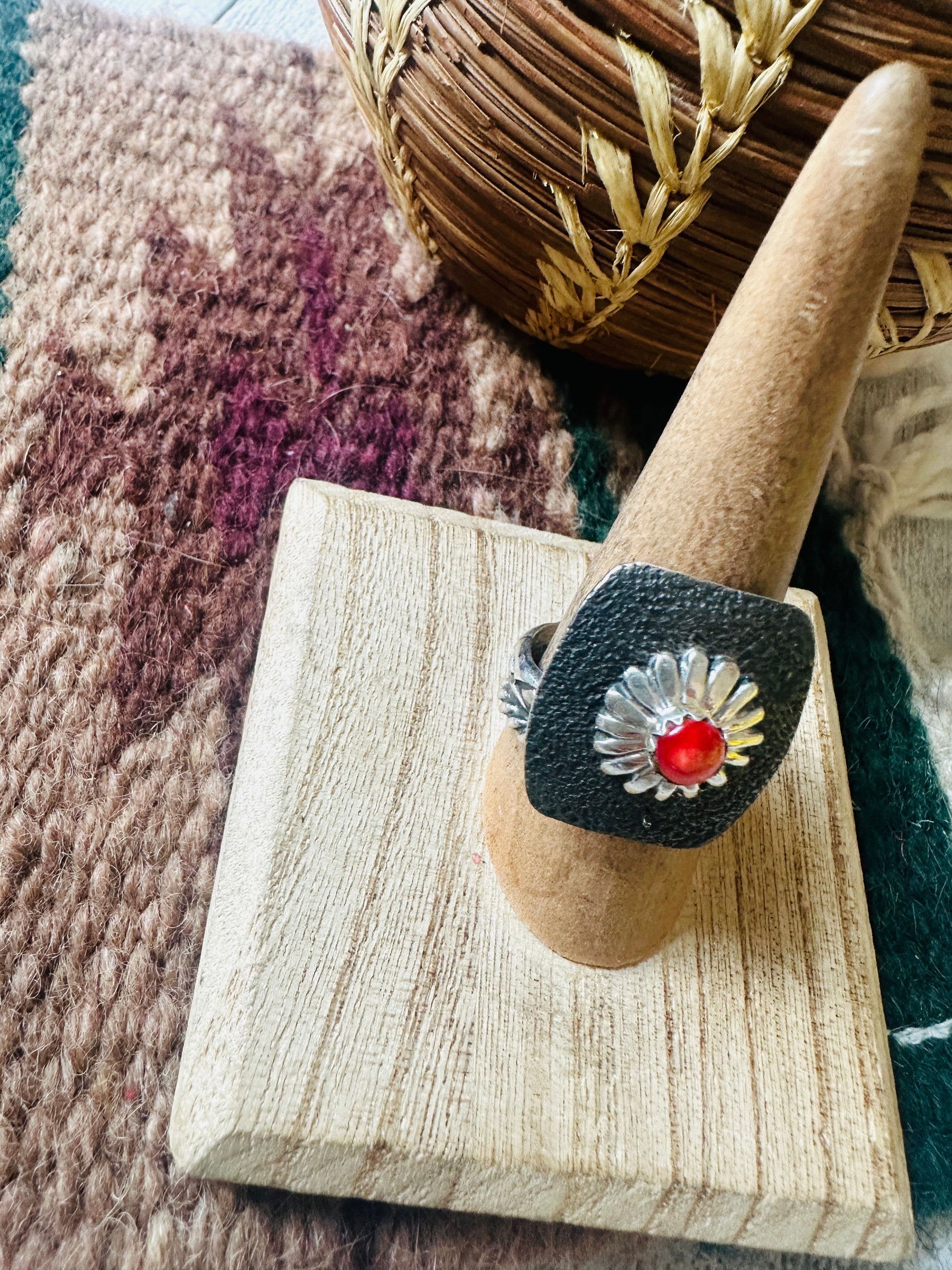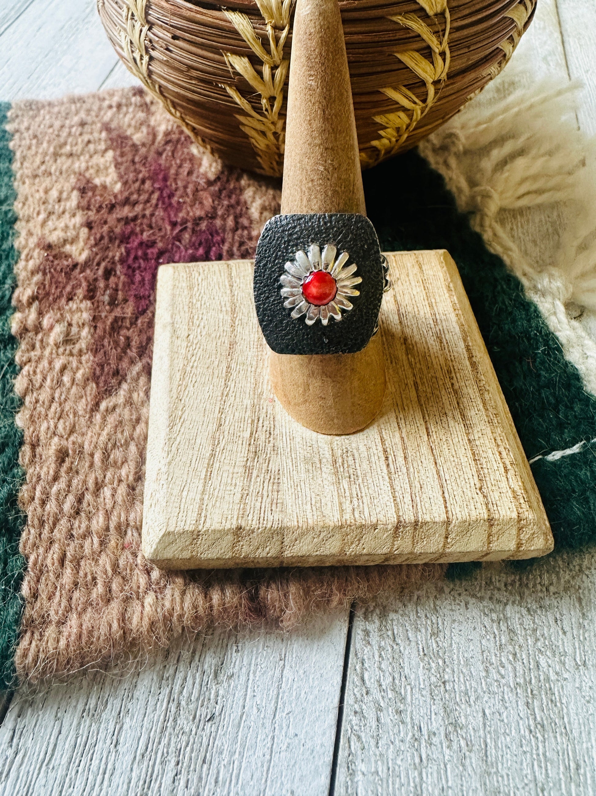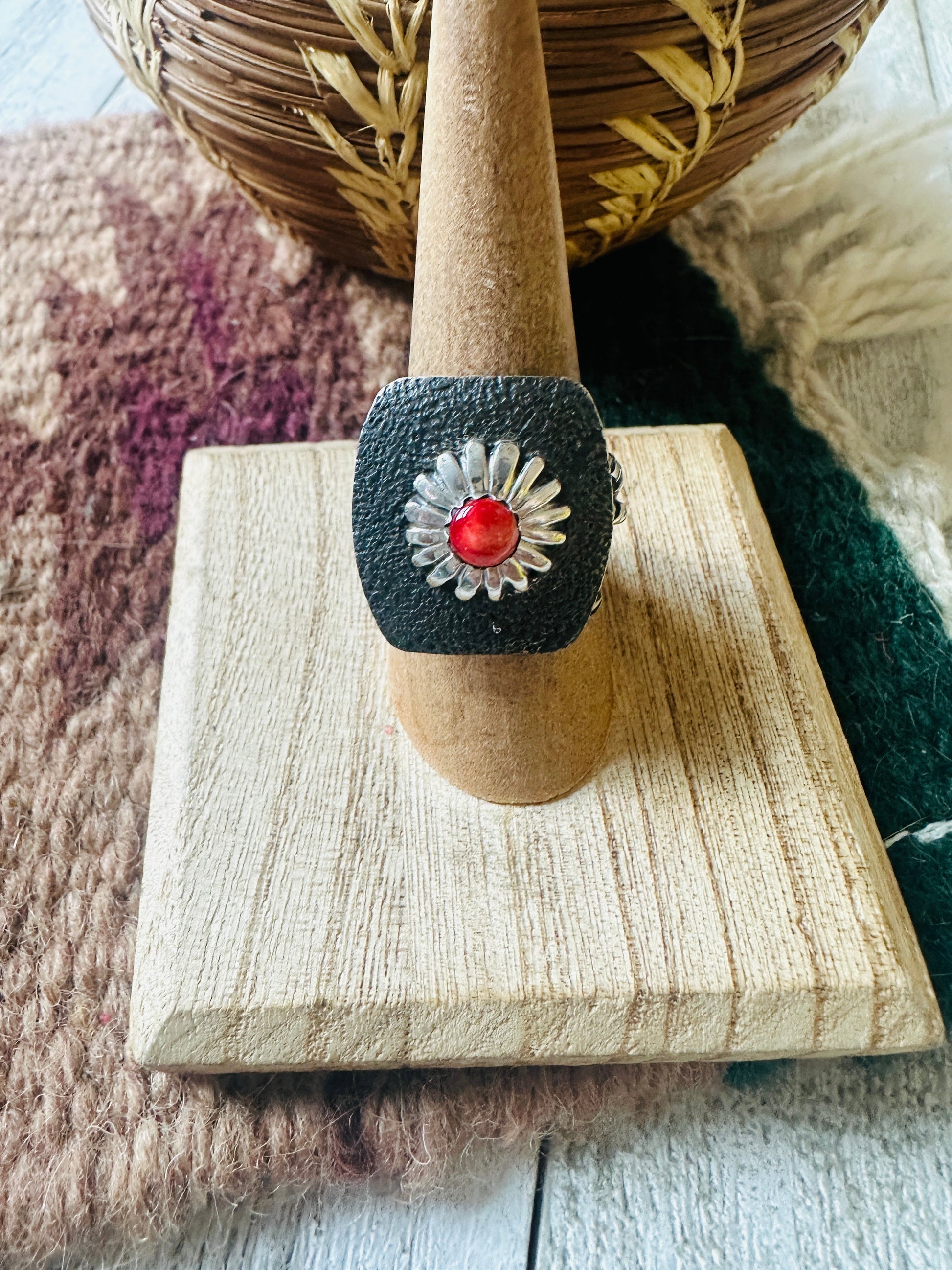 Navajo Sterling Silver & Red Spiny Concho Adjustable Ring