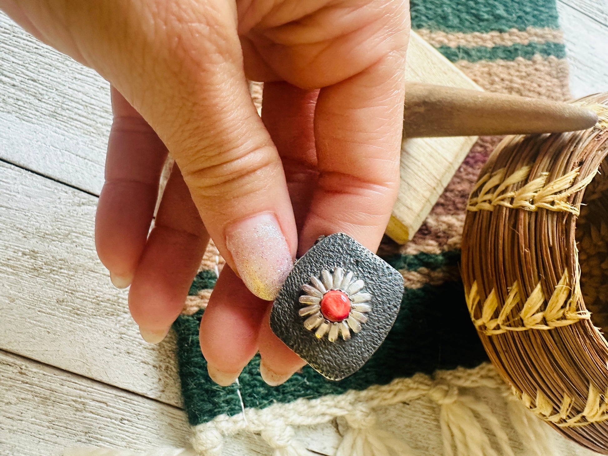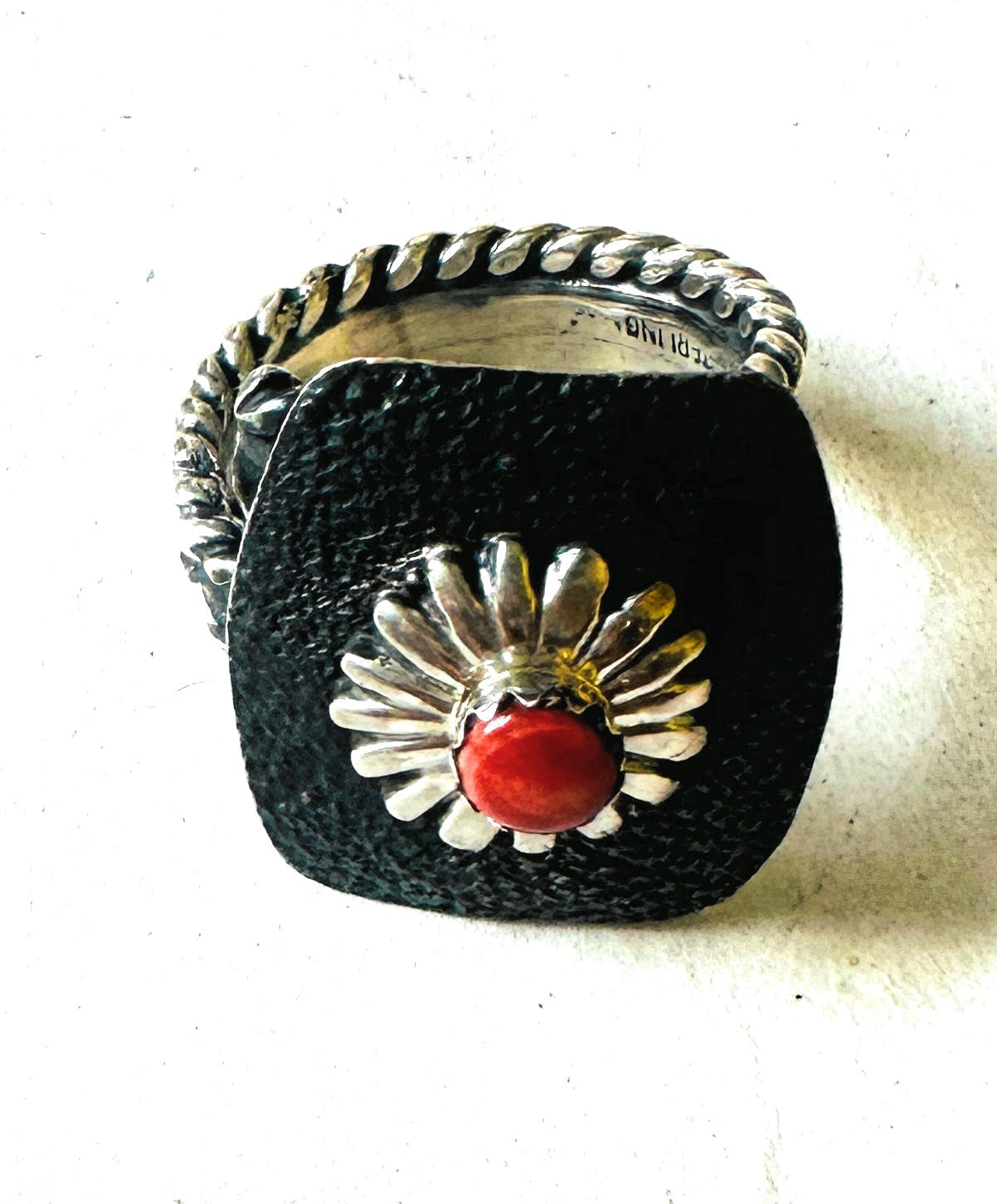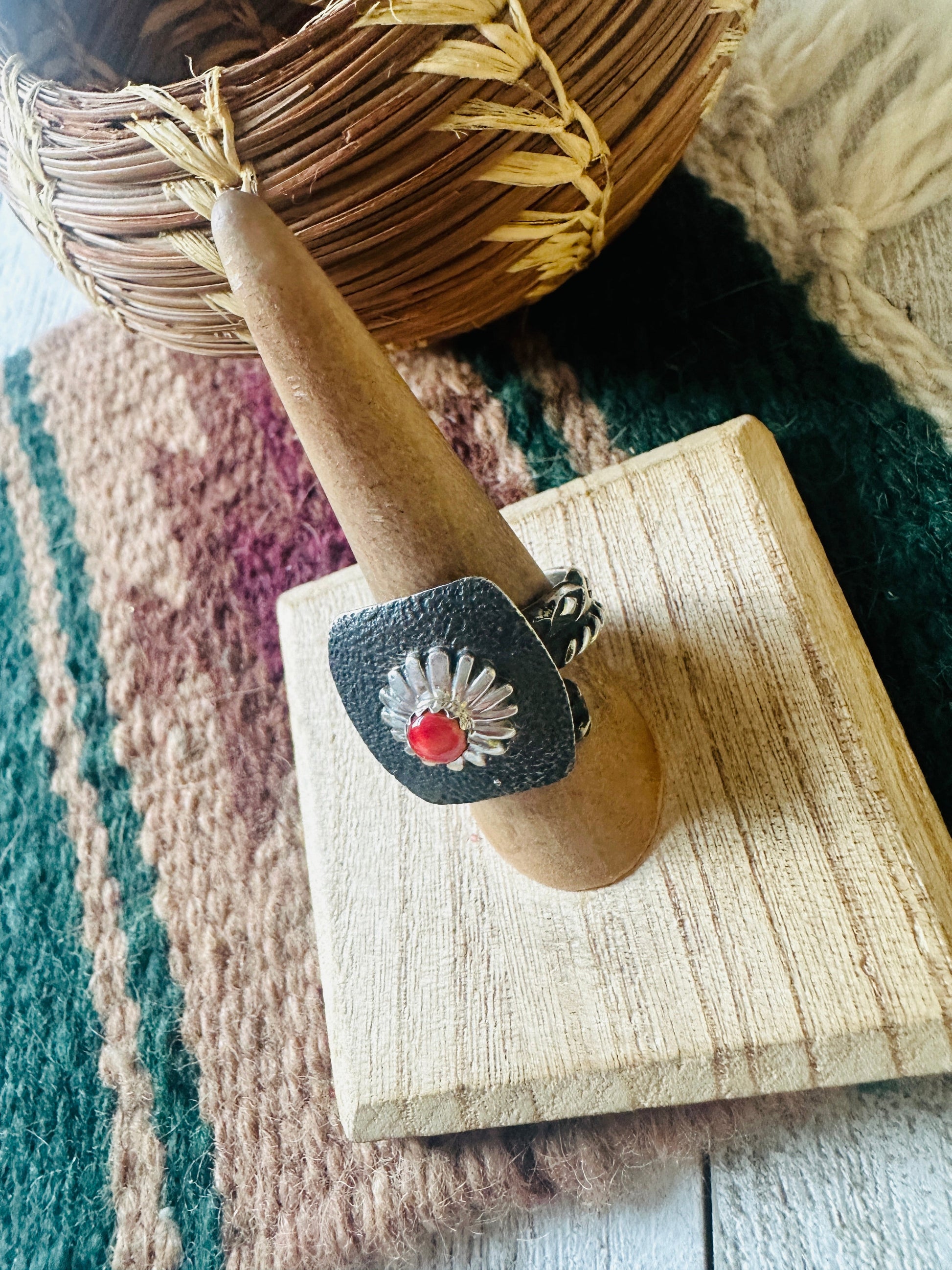 Gorgeous Navajo Sterling Silver and Red Spiny Oyster Shell Concho Ring. Adjustable in size to wear on any finger. Beautiful hand stamped design. Measuring 1 inch long and 7/8 of an inch wide. Signed by the artist and stamped Sterling.
