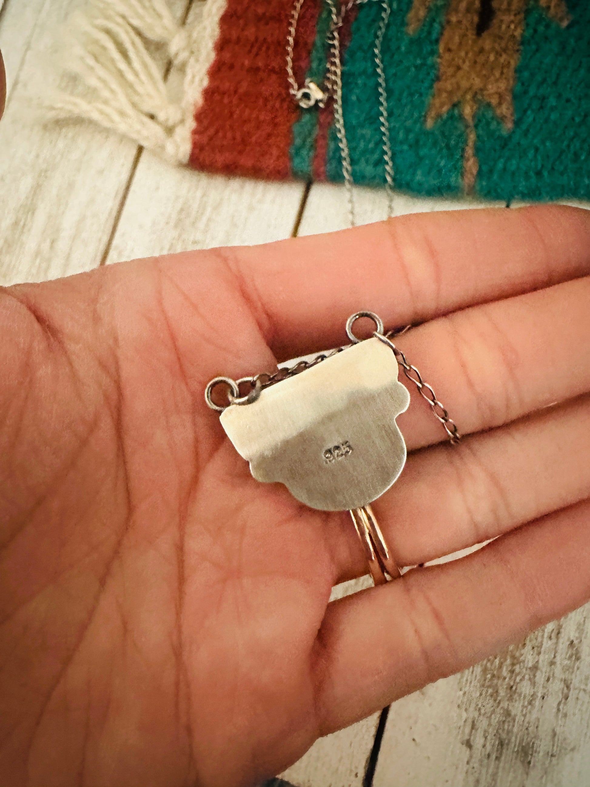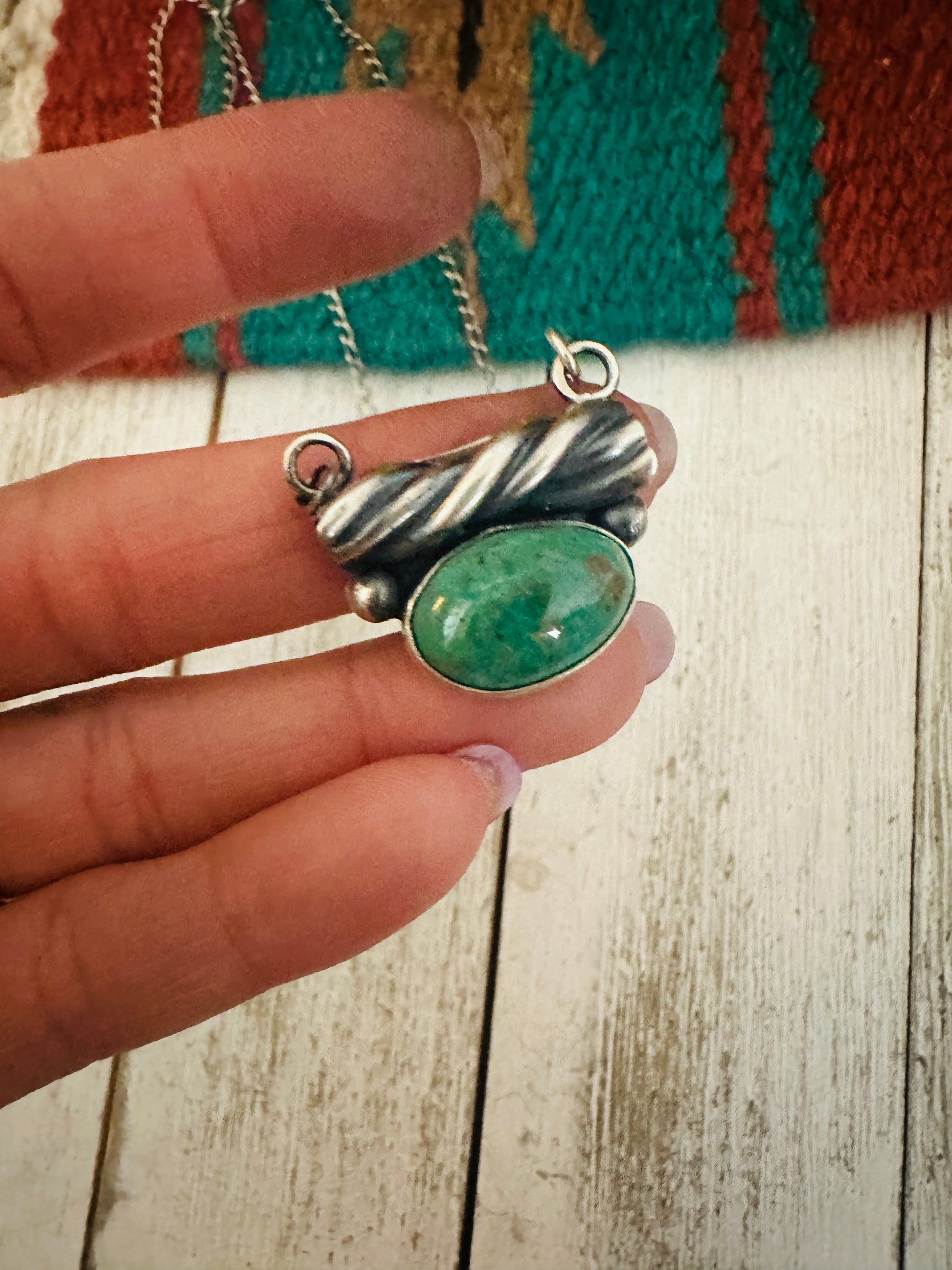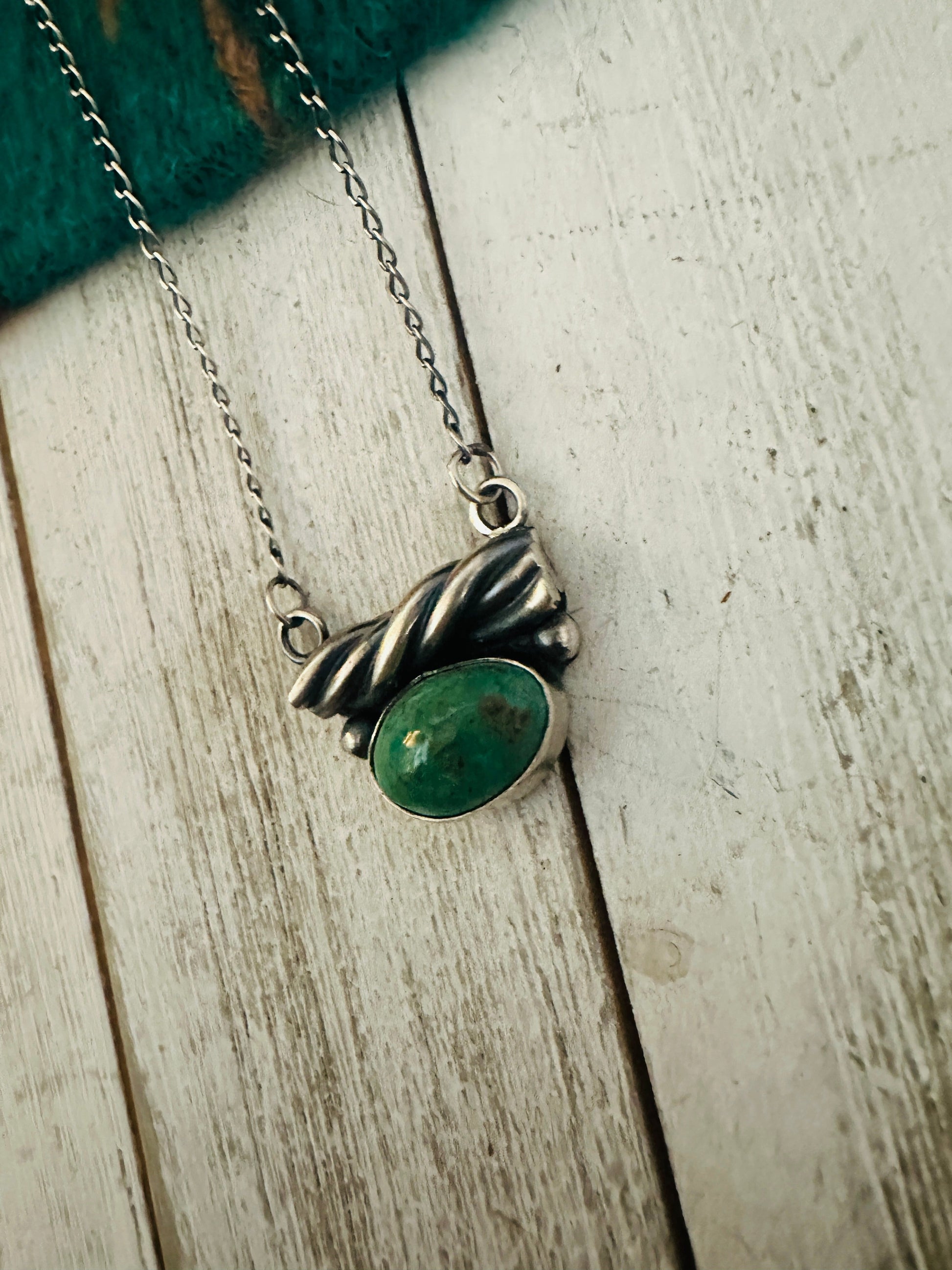 Gorgeous Navajo Royston Turquoise & Sterling Silver Necklace. Sterling chain measures 18 inches long. Pendant measures 7/8 of an inch long and 1 inch wide. Stamped Sterling.