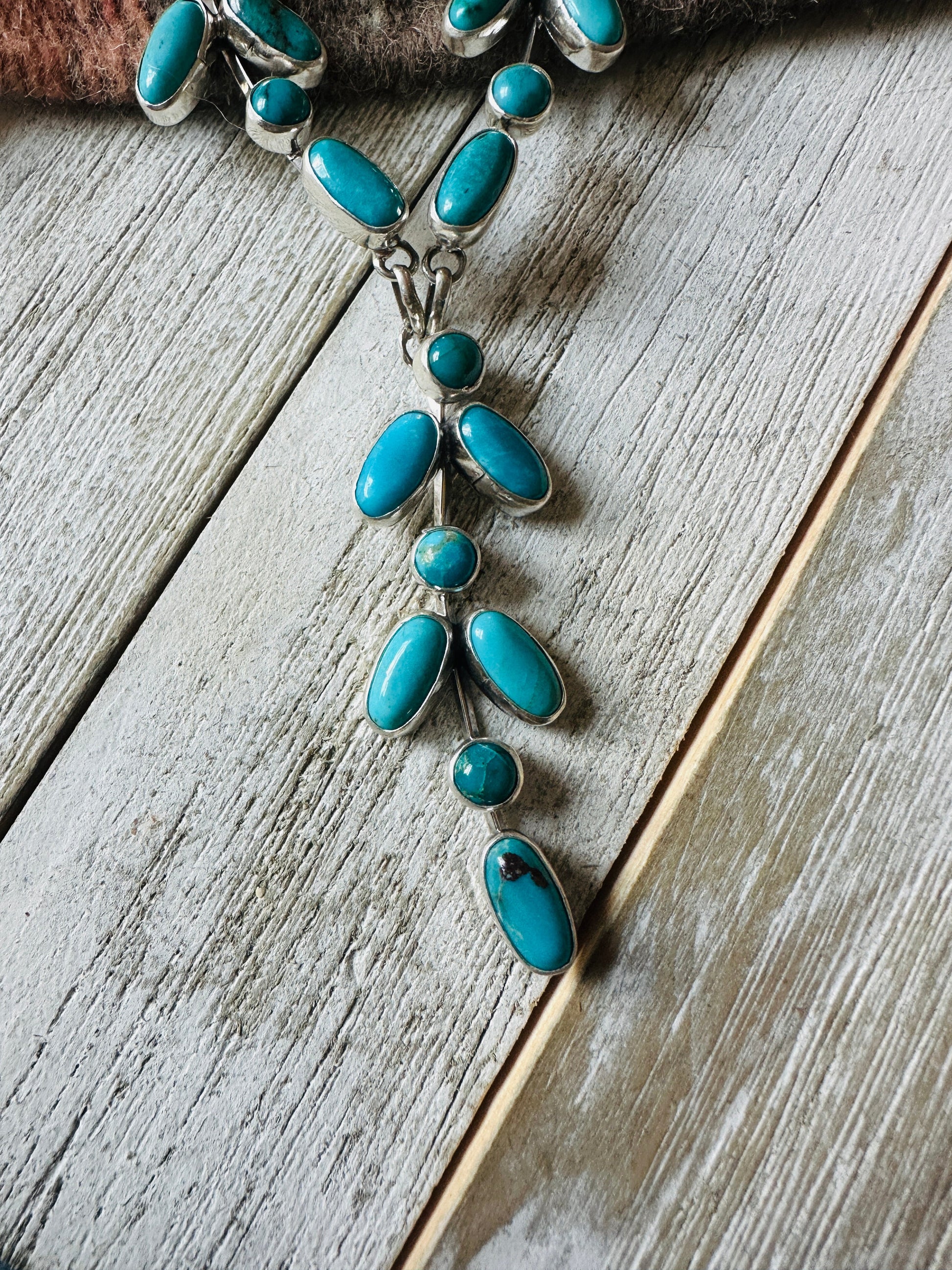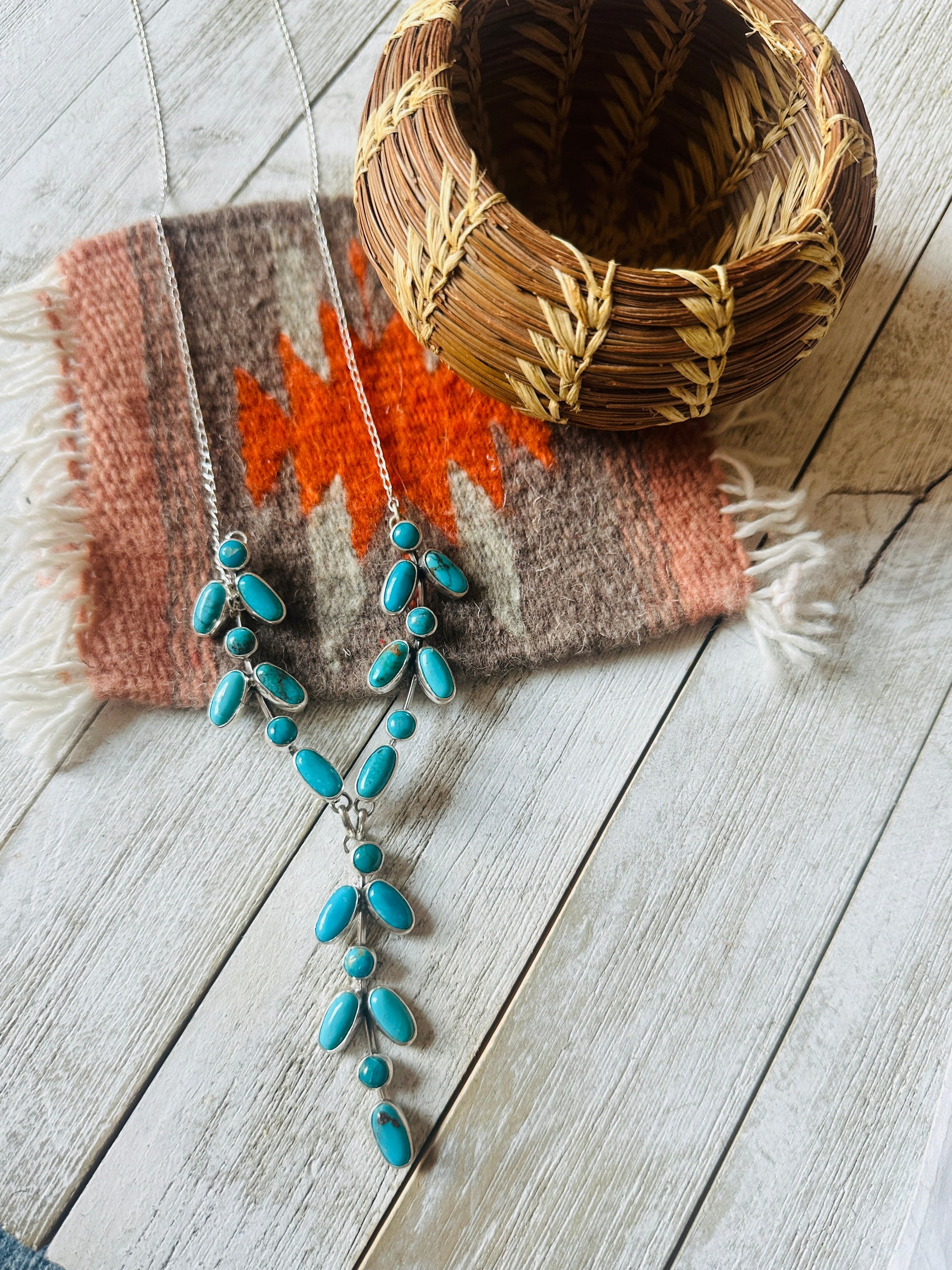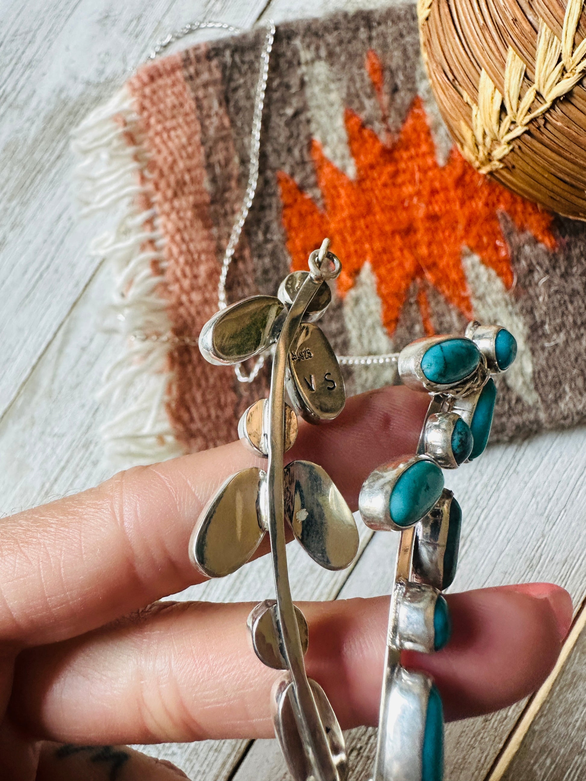 Beautiful Navajo Turquoise & Sterling Silver Vine Necklace. Sterling chain measures 24 inches long. Central pendant measures 2 3/4 inches long. Signed by the artist and stamped Sterling. So gorgeous!