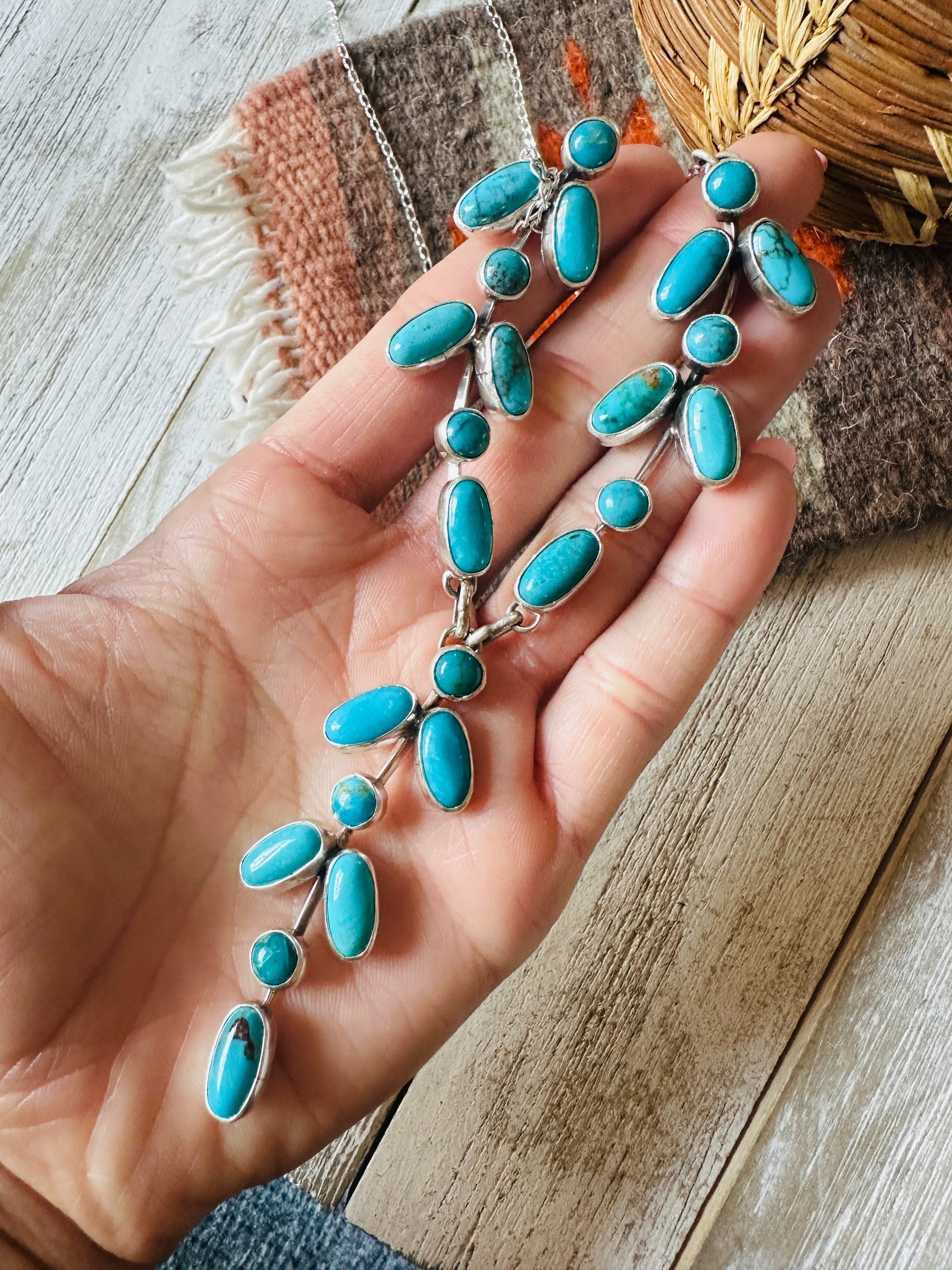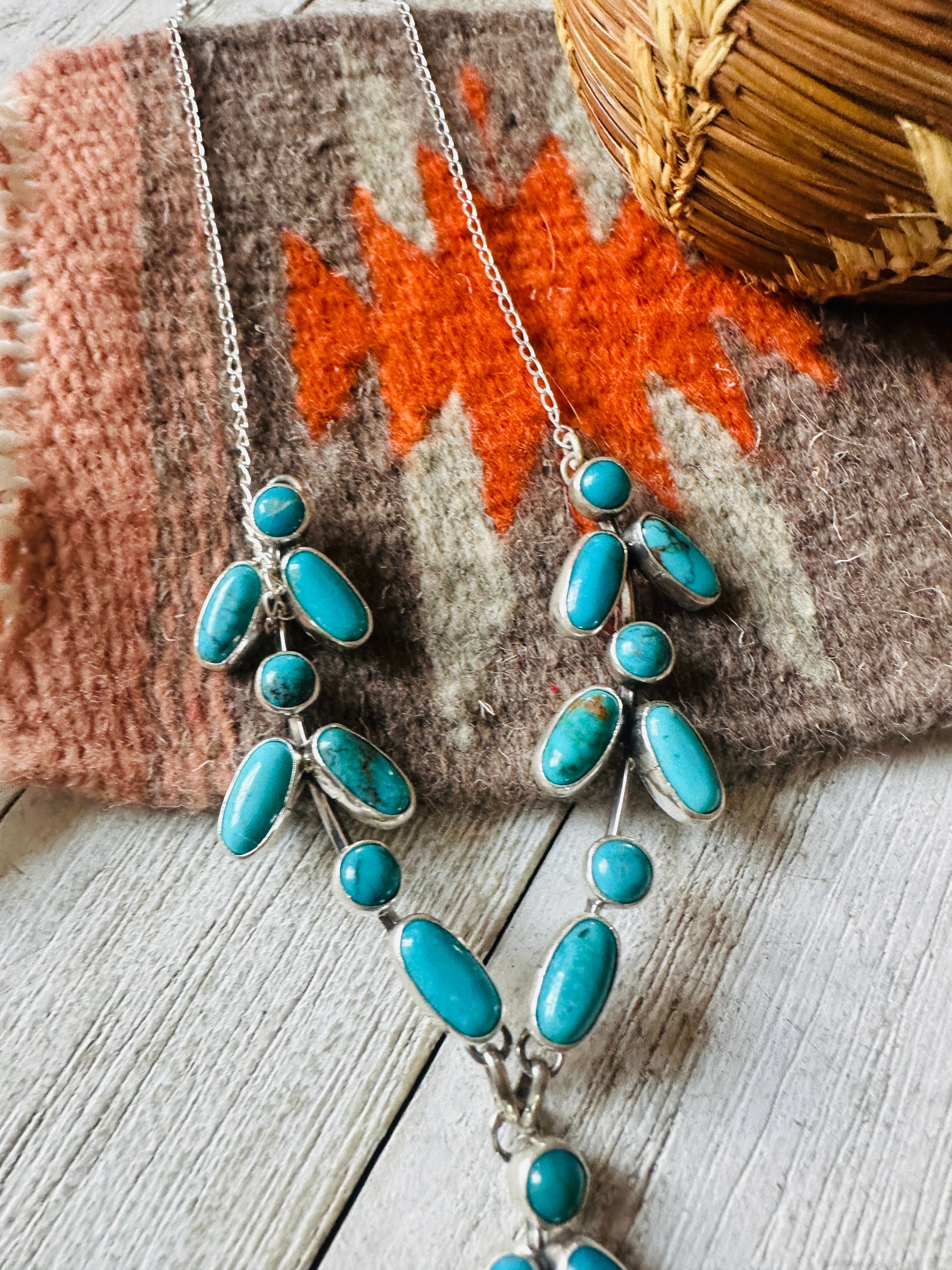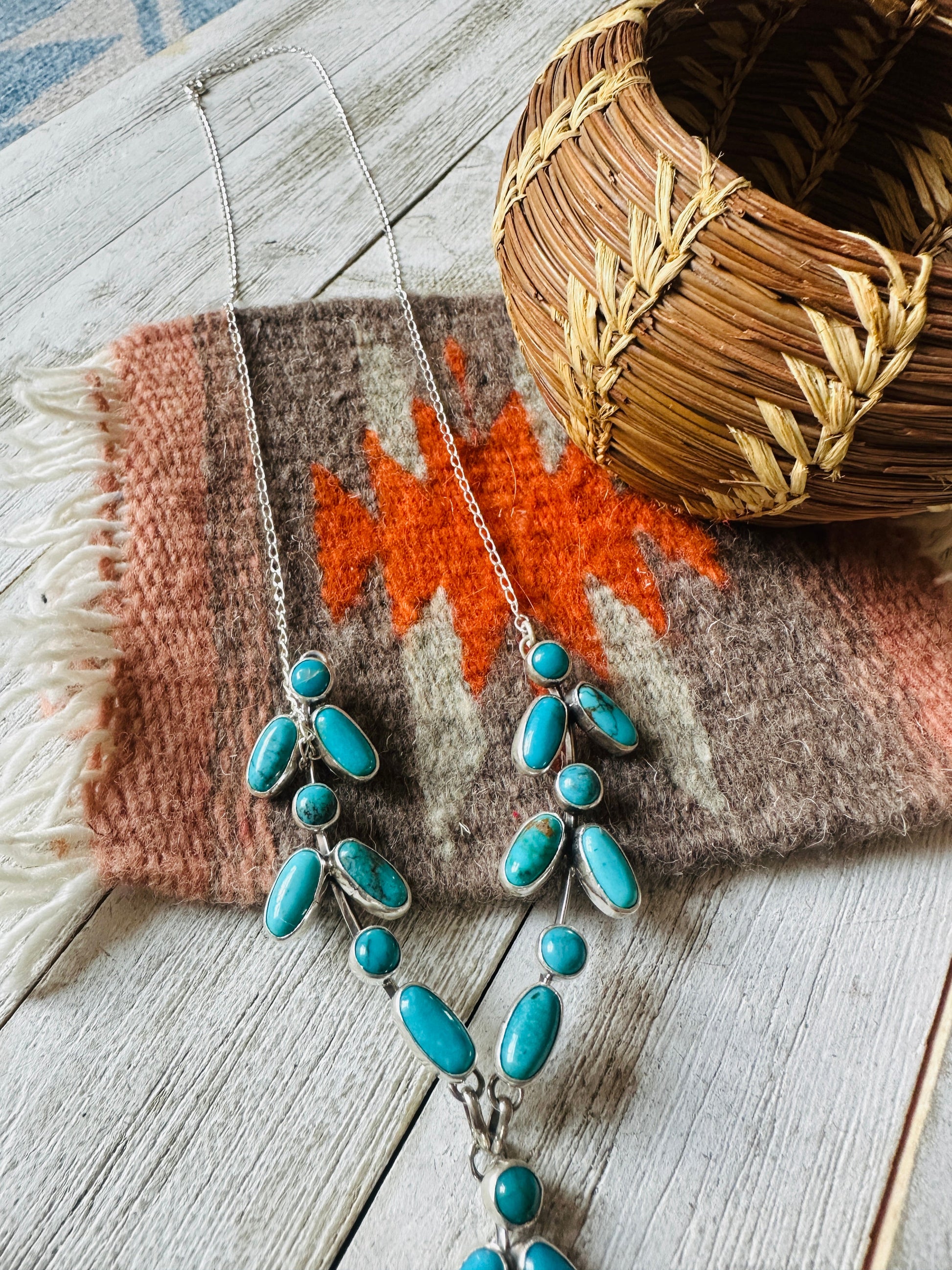 Beautiful Navajo Turquoise & Sterling Silver Vine Necklace. Sterling chain measures 24 inches long. Central pendant measures 2 3/4 inches long. Signed by the artist and stamped Sterling. So gorgeous!