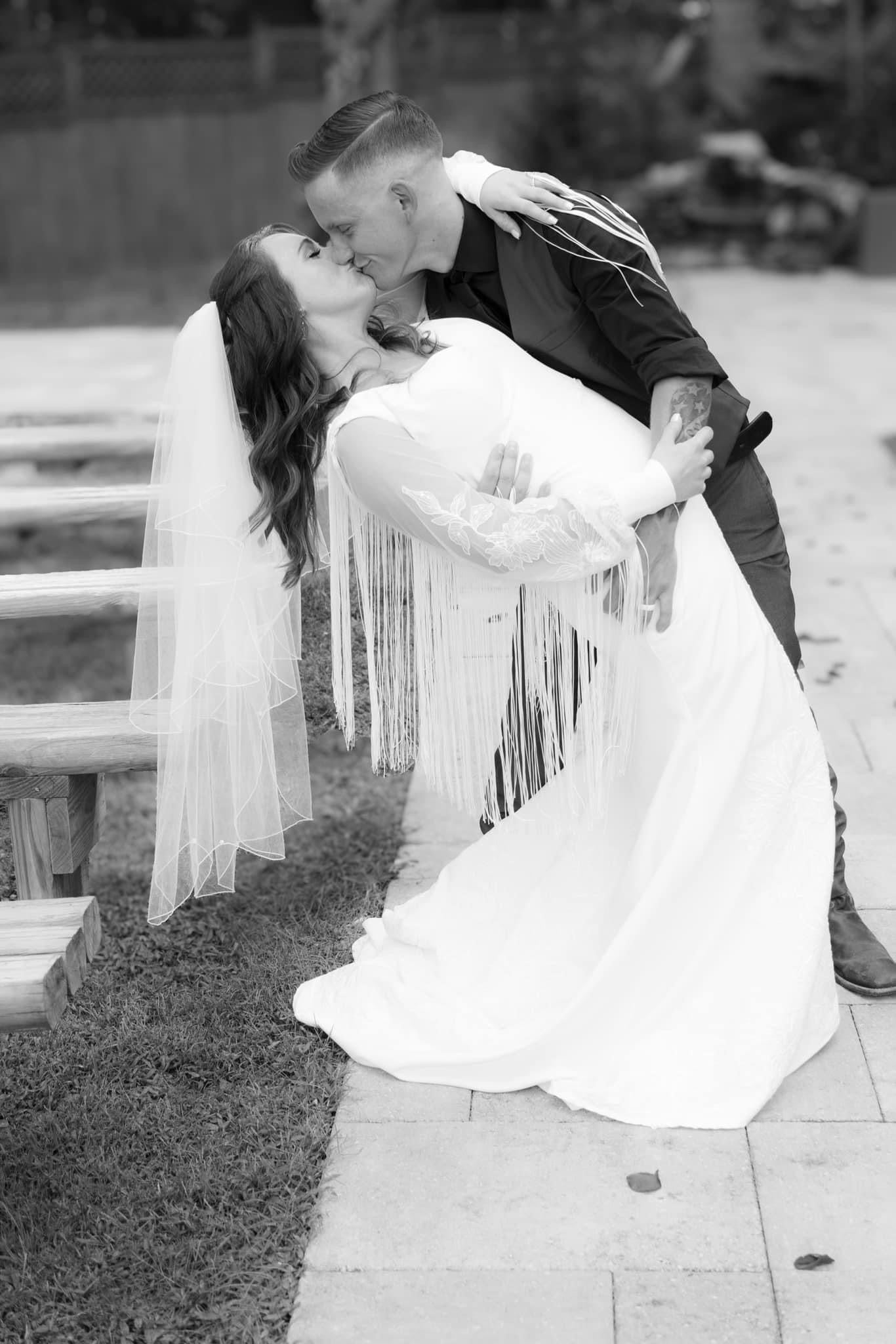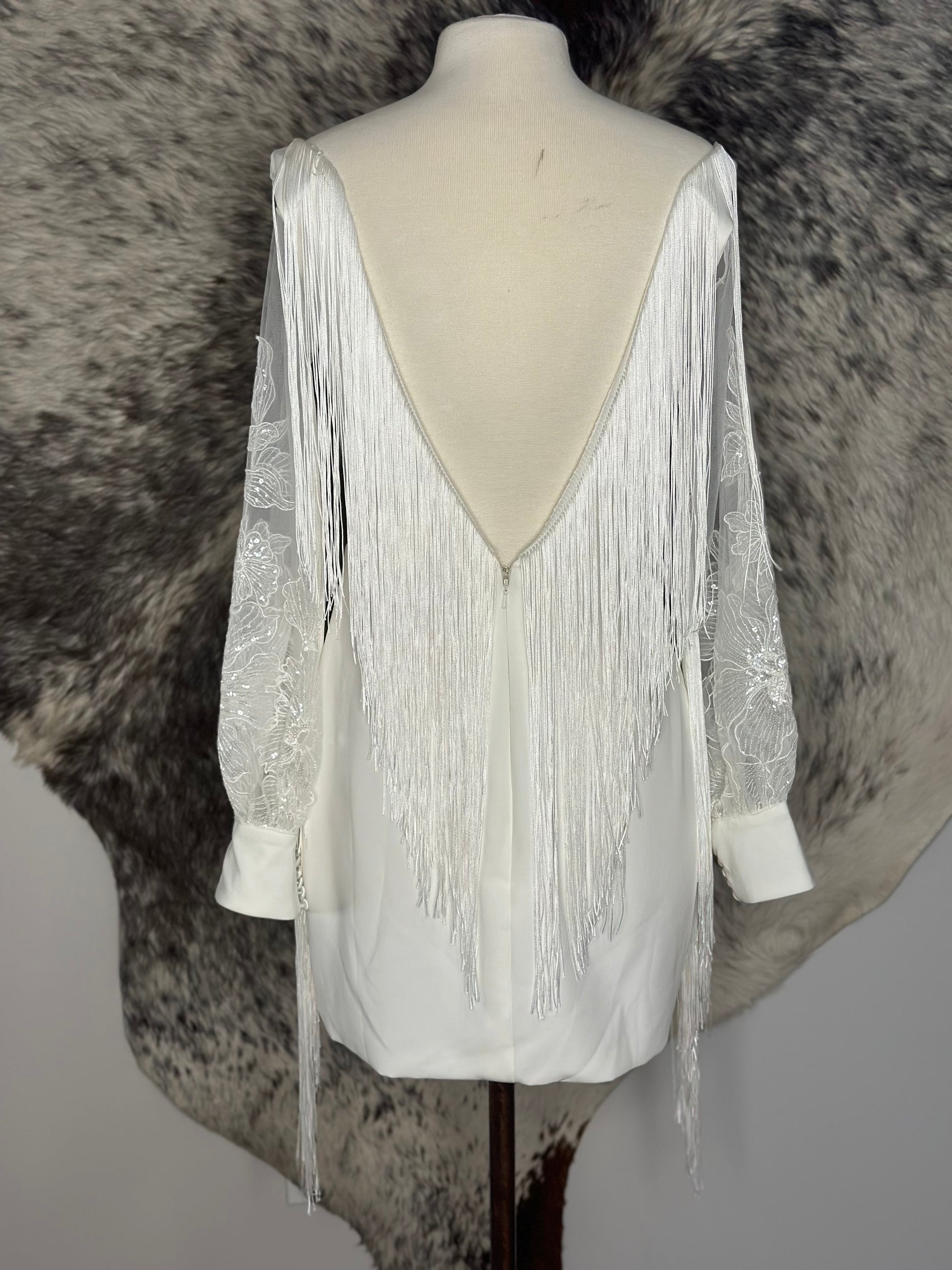 This gown comes with a mini gown that can be worn during your reception, anniversary photos etc. Detachable sleeves with lace appliques and fringe, and a long train overskirt with slit and buttons. This gown can be customized any way you'd like. Our mini dress only is available in our "All Dressed in White" collection.