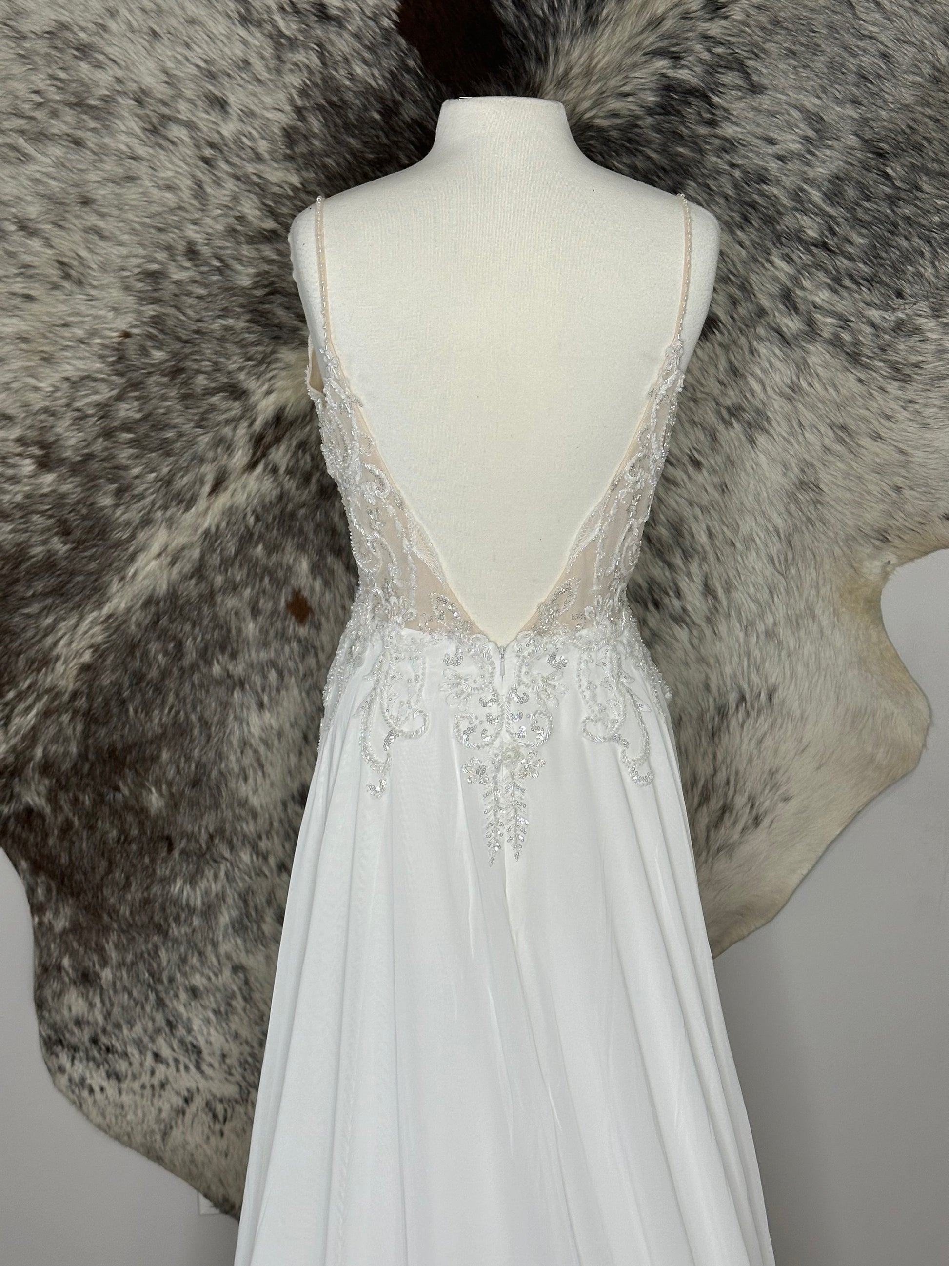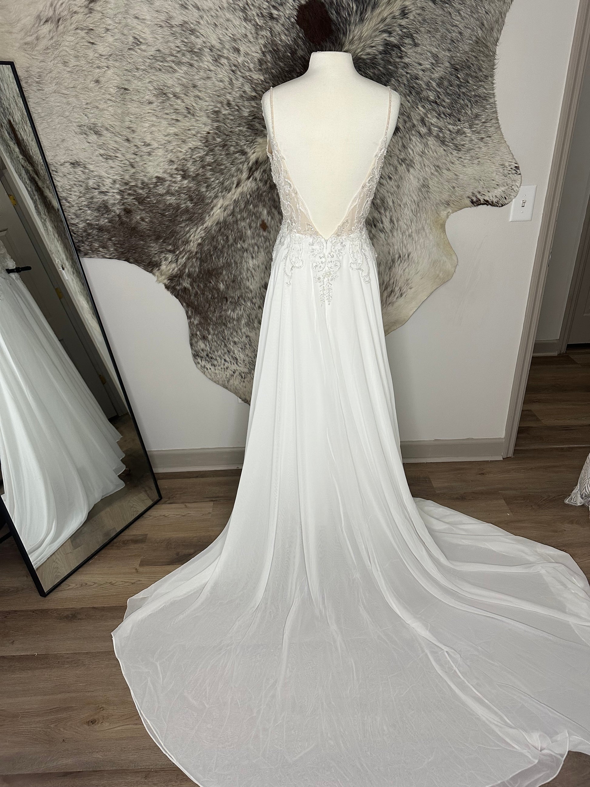 This gown can be ordered in white, ivory, or black and is available in sizes 2-30