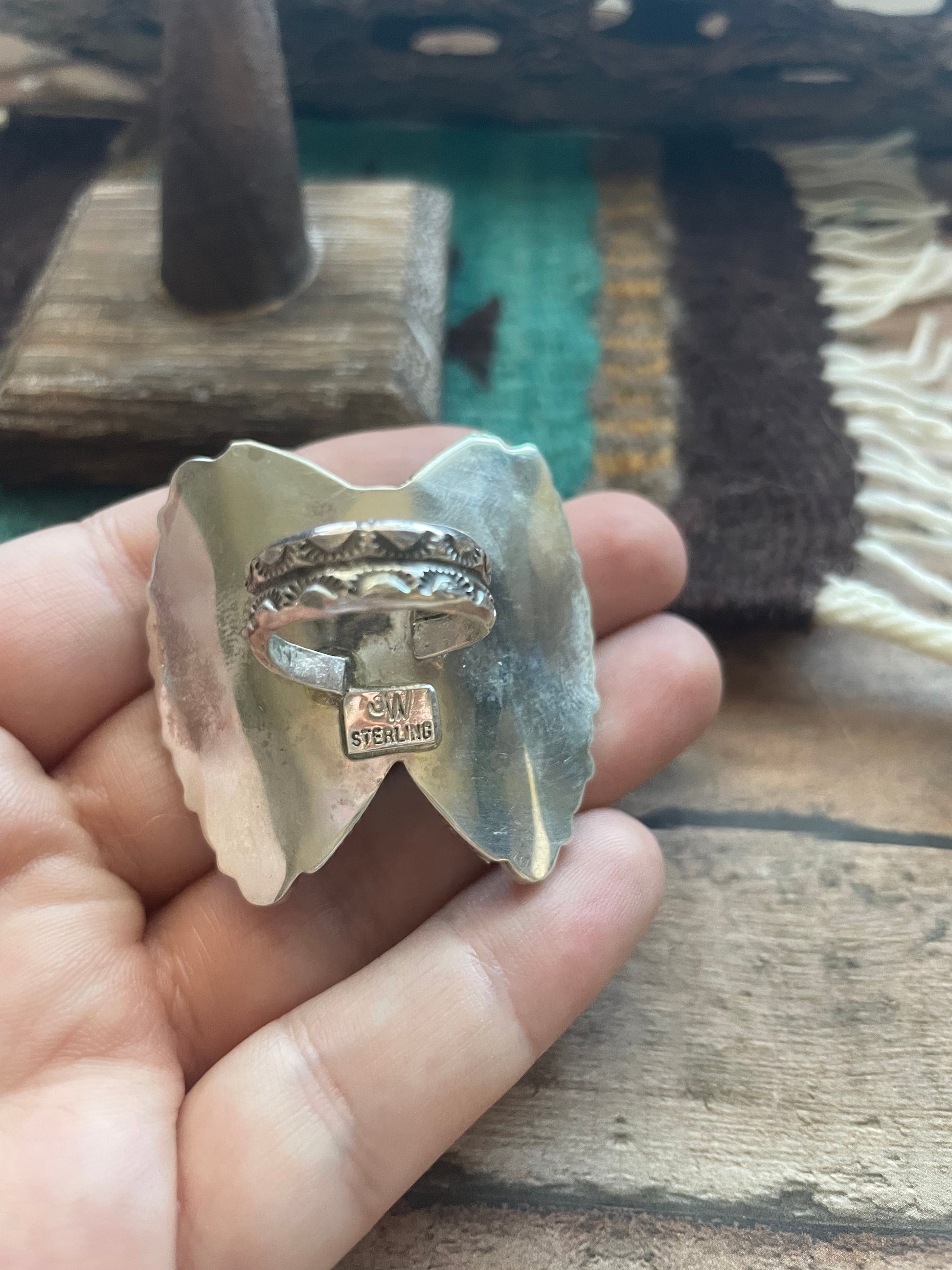 How amazing is this Navajo Coral Sterling Silver Adjustable Butterfly Ring Signed JW. These will vary. They are signed by the artist JW and stamped Sterling. They have beautiful detail on the band. The size is adjustable. This beauty measures 1 3/4 inch in length and 1 3/4 inch wide. Beautiful statement ring!