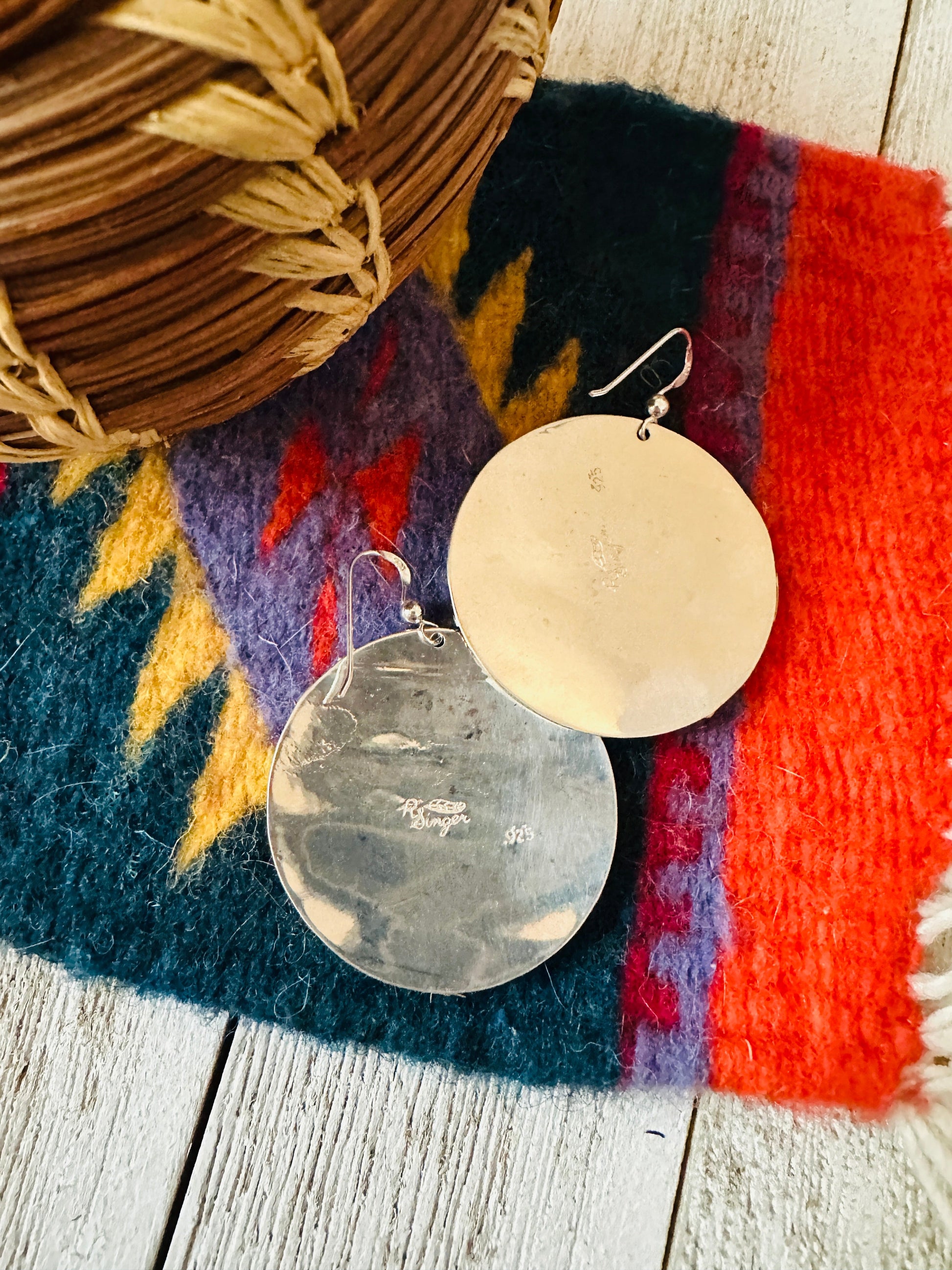 These are a beautiful pair of Navajo Hand Stamped Sterling Silver and Copper Overlay Dangle Earrings. These measure 2 1/8 inches long and 1 1/2 inches wide. Such amazing craftsmanship on these earrings! Stamped Sterling and signed by the artist Richard Singer