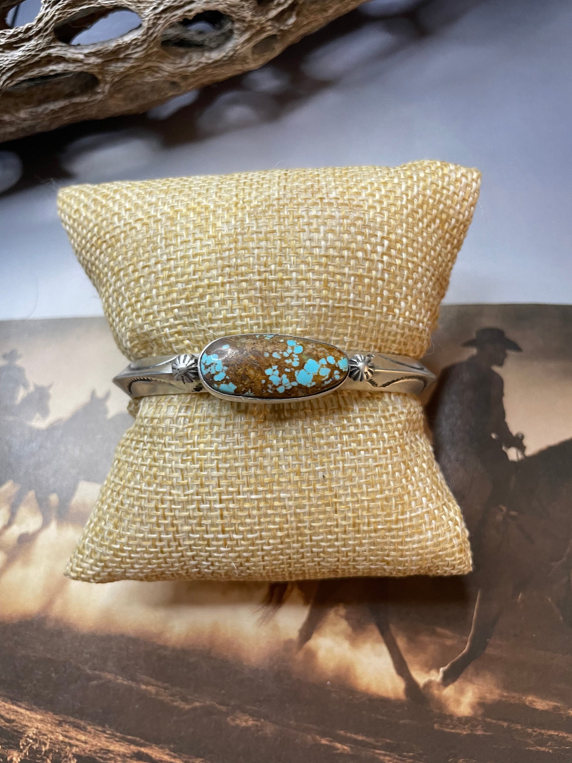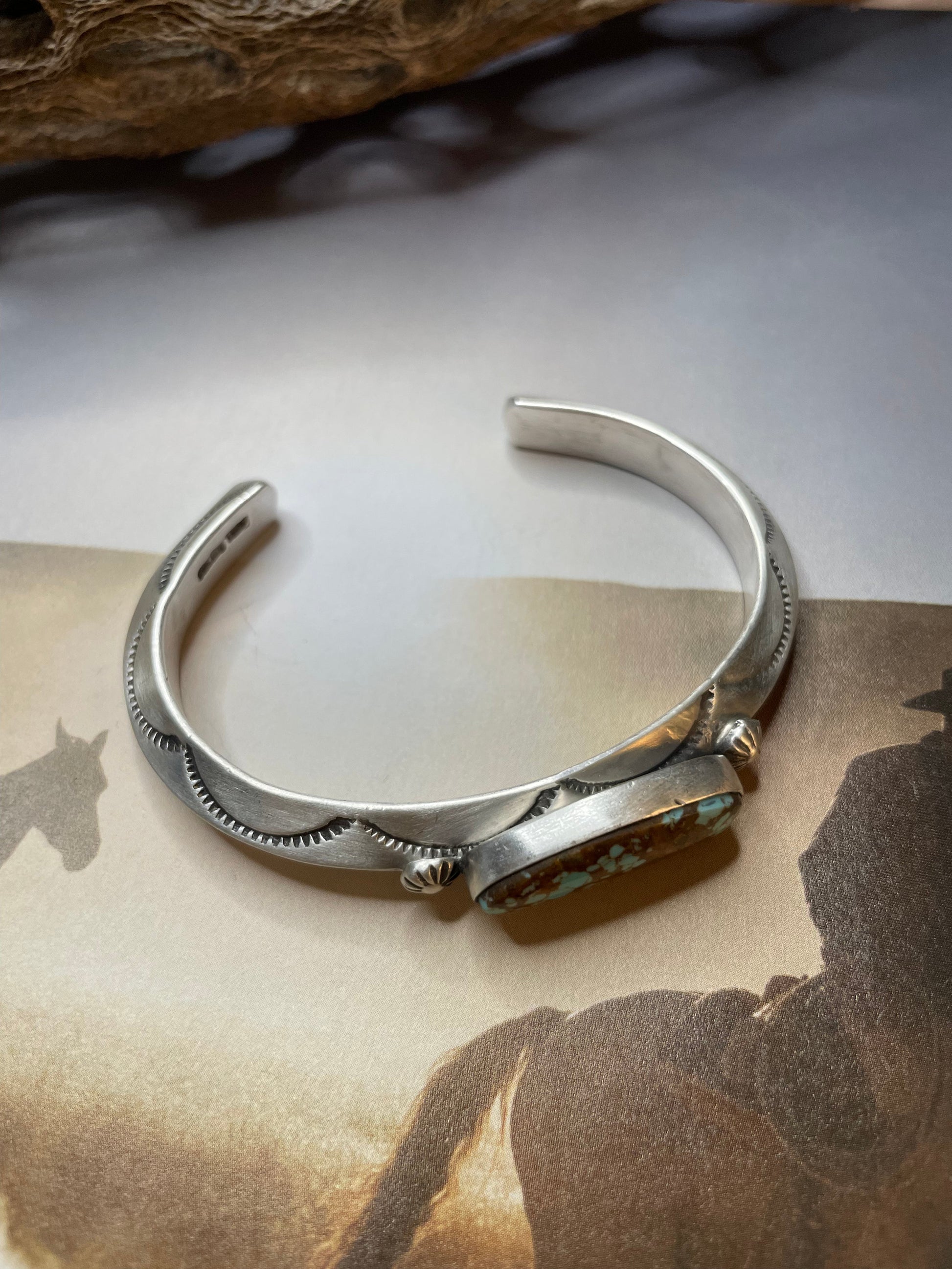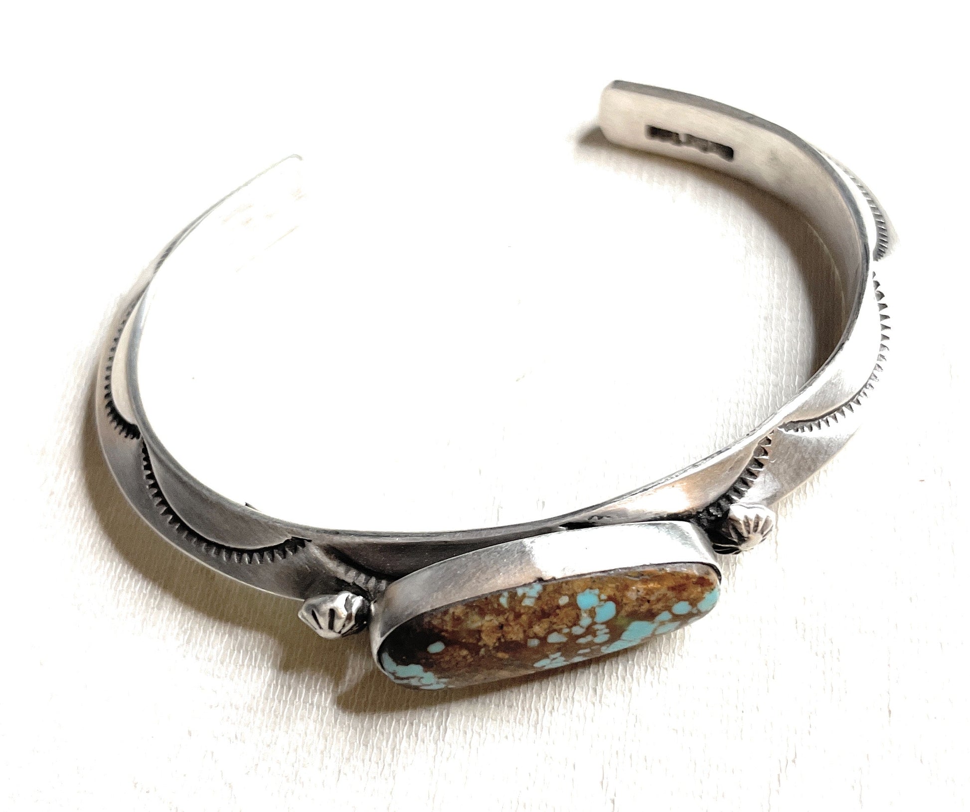 Navajo Hand Stamped Sterling Silver & Turquoise Cuff Bracelet Signed