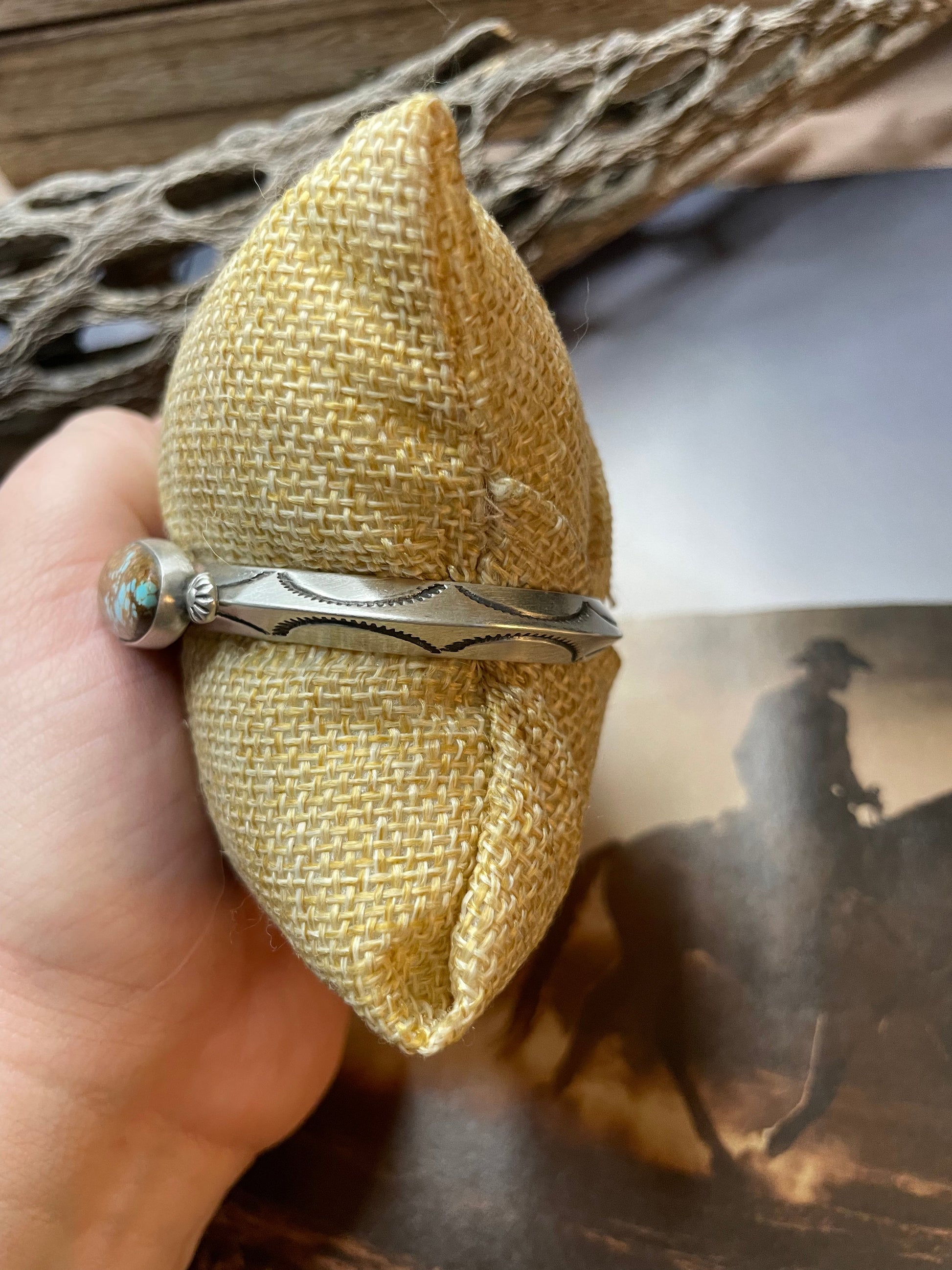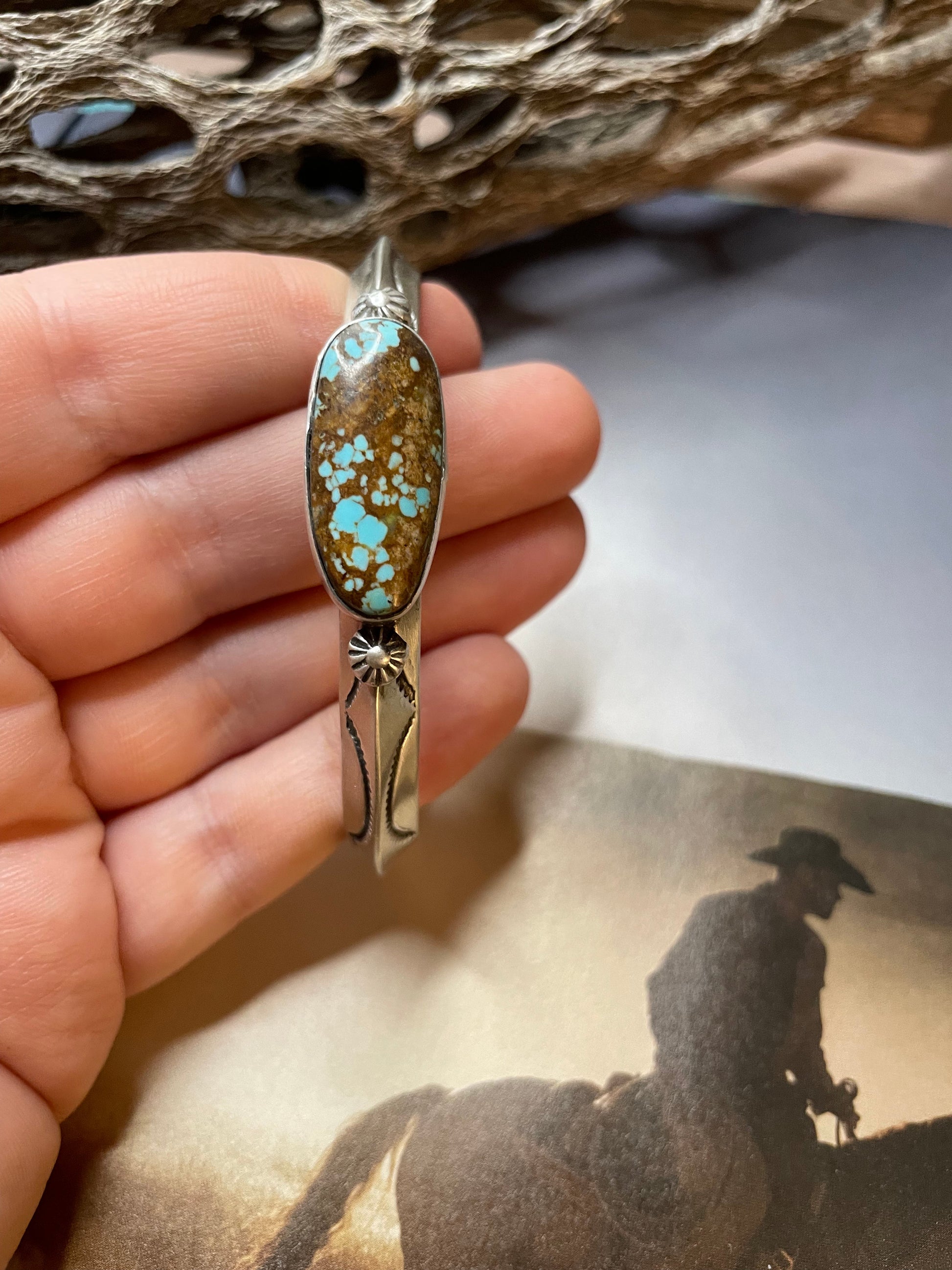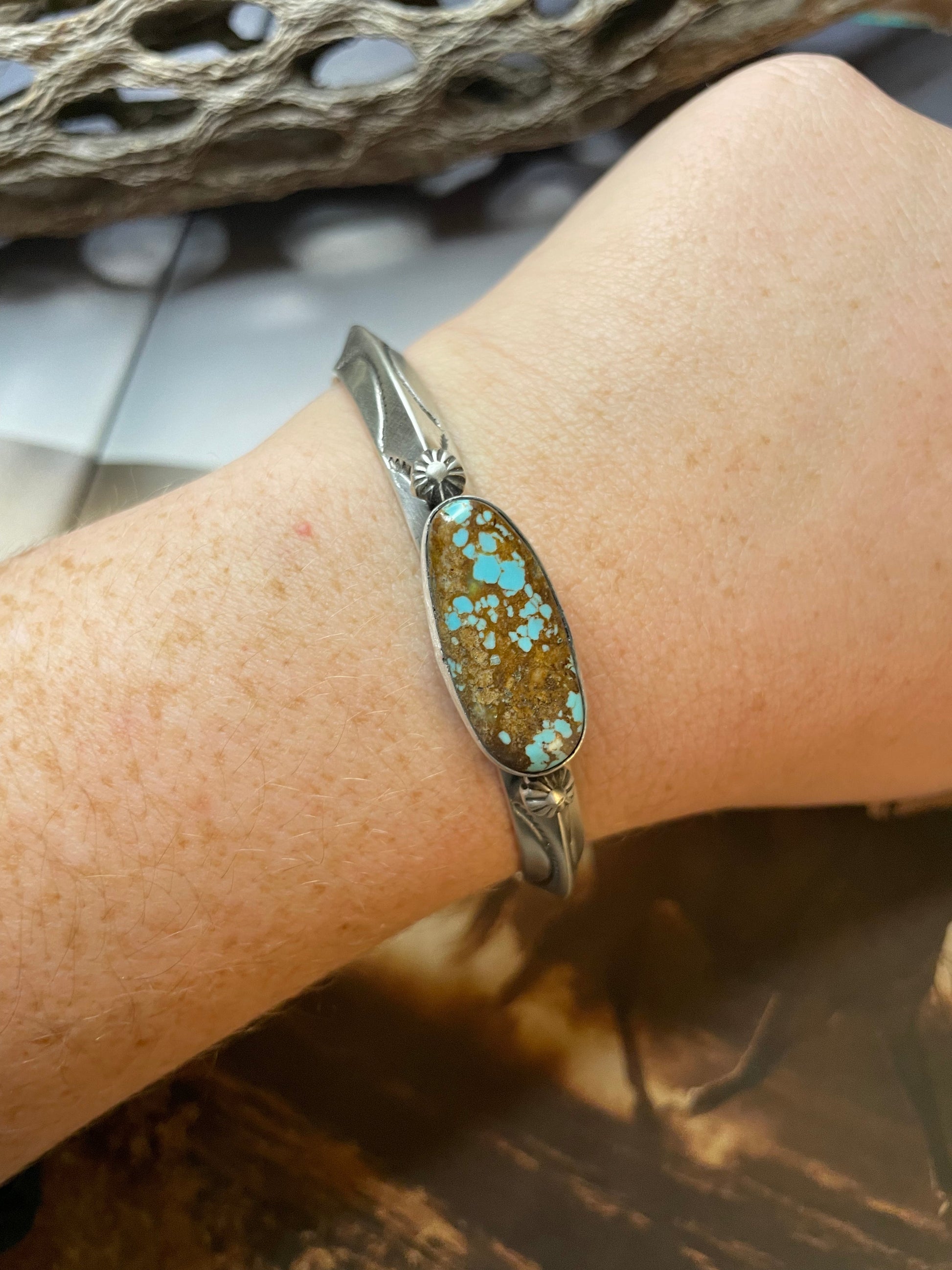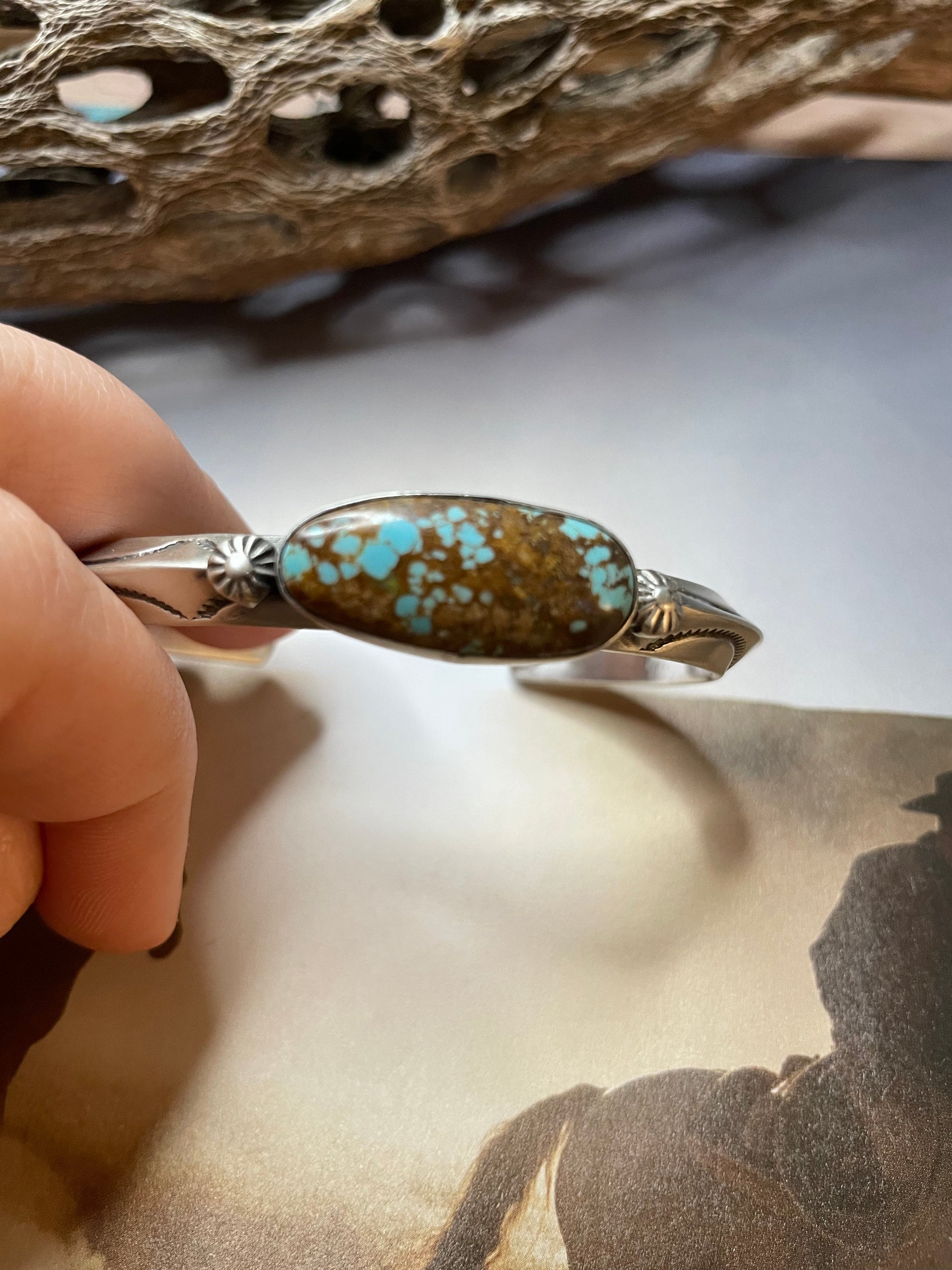 Navajo Hand Stamped Sterling Silver & Turquoise Cuff Bracelet Signed