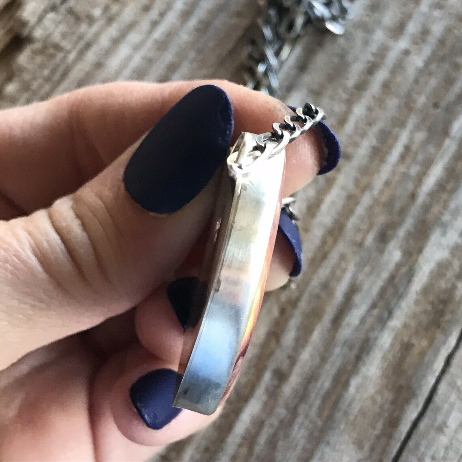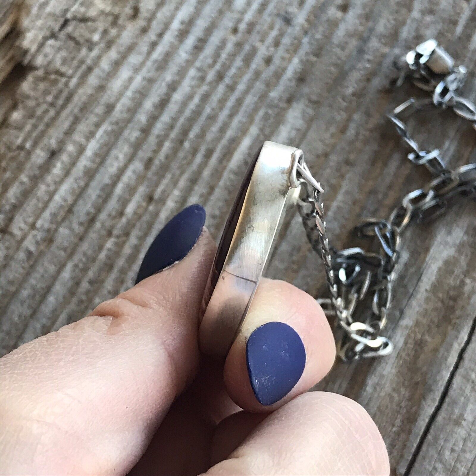 Be still my HEART! This is a Navajo Purple Spiny And Sterling Silver Necklace. This necklace is 18 inches long and the pendant measures 1 1/4 inches long and just over 1 1/2 inches wide. Signed by Artist and stamped Sterling. This is a wonderful piece that would make any collection great!!!