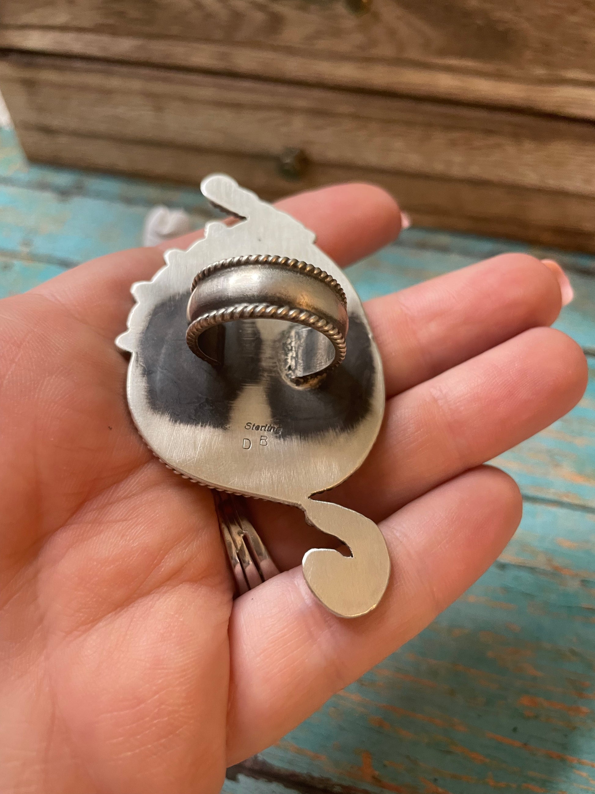 Lovely Navajo Handmade Sterling Silver and Orange Spiny Oyster Ring Size 8. Such a pretty stone in this ring! Stamped Sterling and signed by the artist DB. Ring measures 3 inches in length and 1 1/2 inches wide.