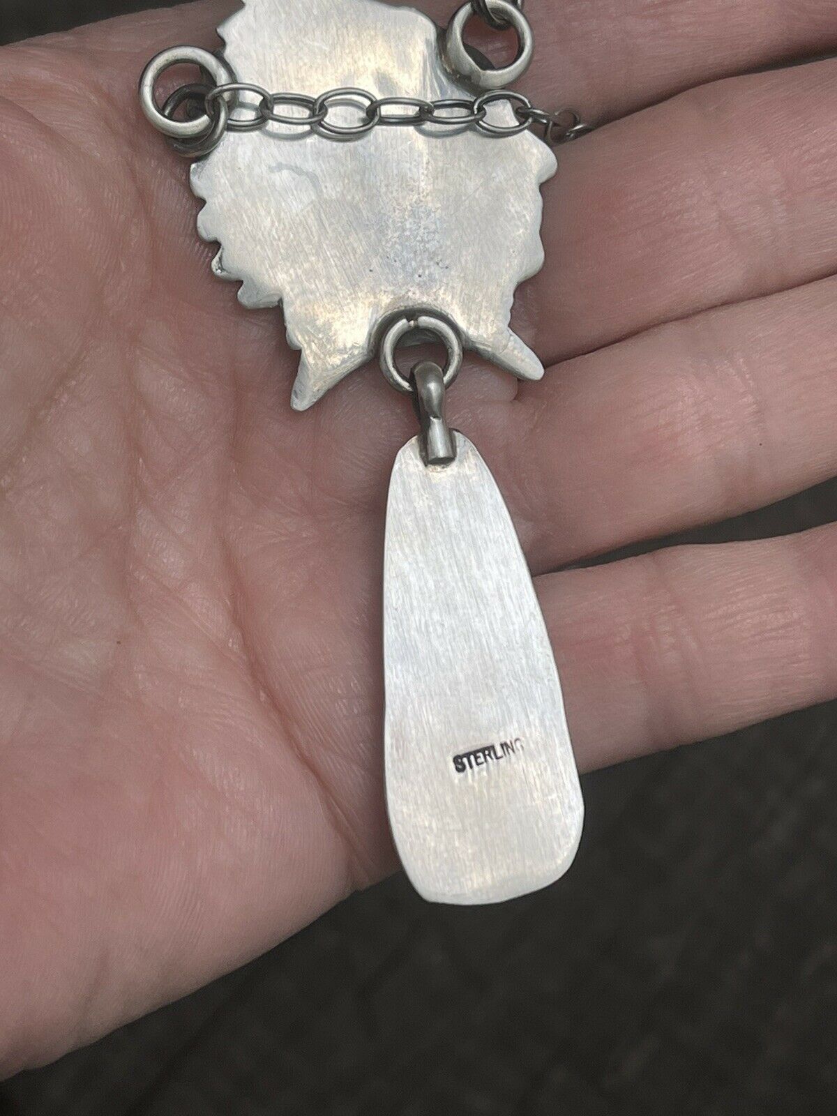 Navajo Sterling Silver Turquoise Necklace. Absolutely stunning! Has Native American Chief Image. Perfect by itself or for layering. Stamped Sterling. Measuring chain is 18 inches long and drop pendant is 2 3/4 inches long and 1 1/4 inch wide. Due to the item being handmade stones will vary.