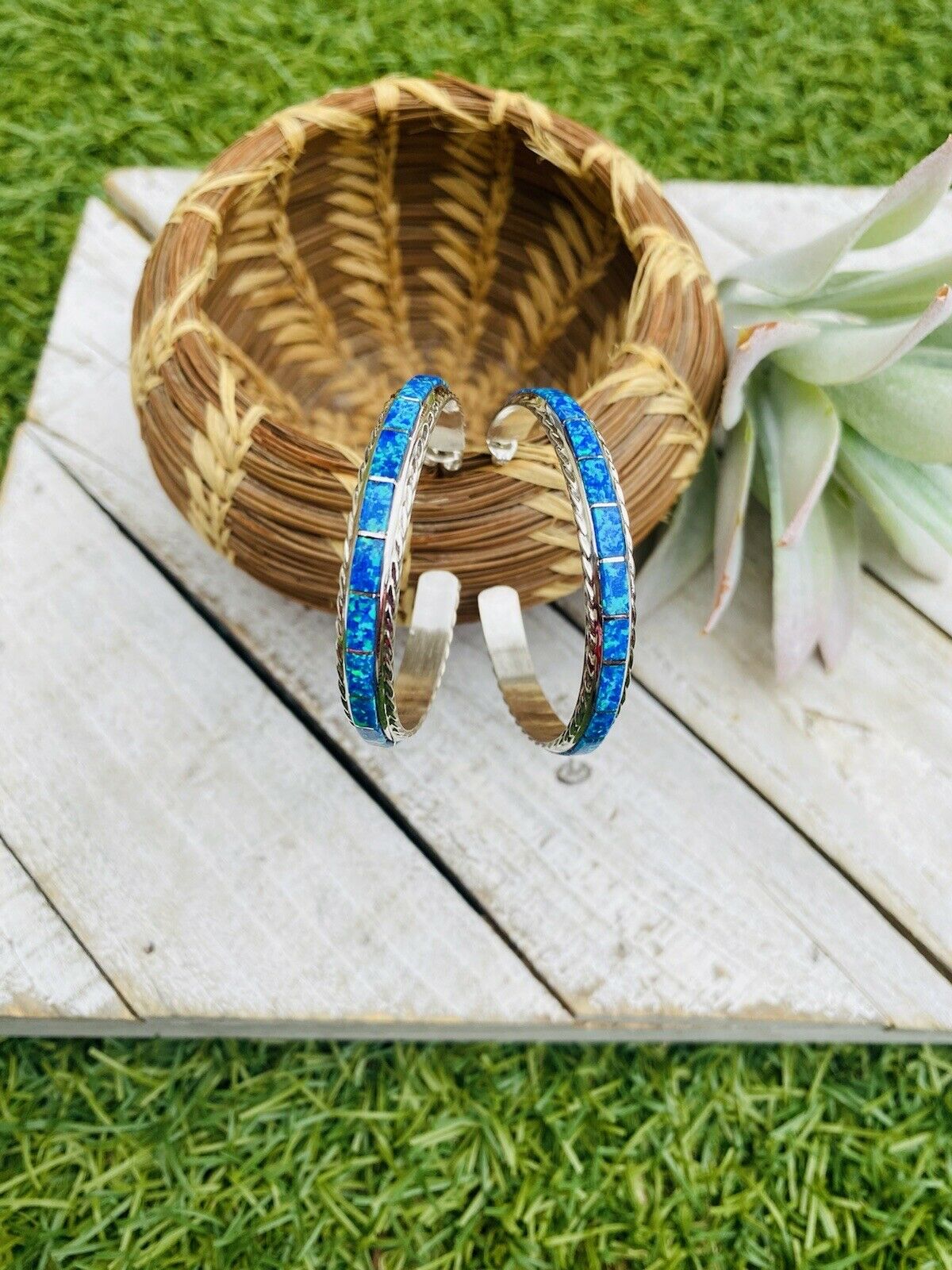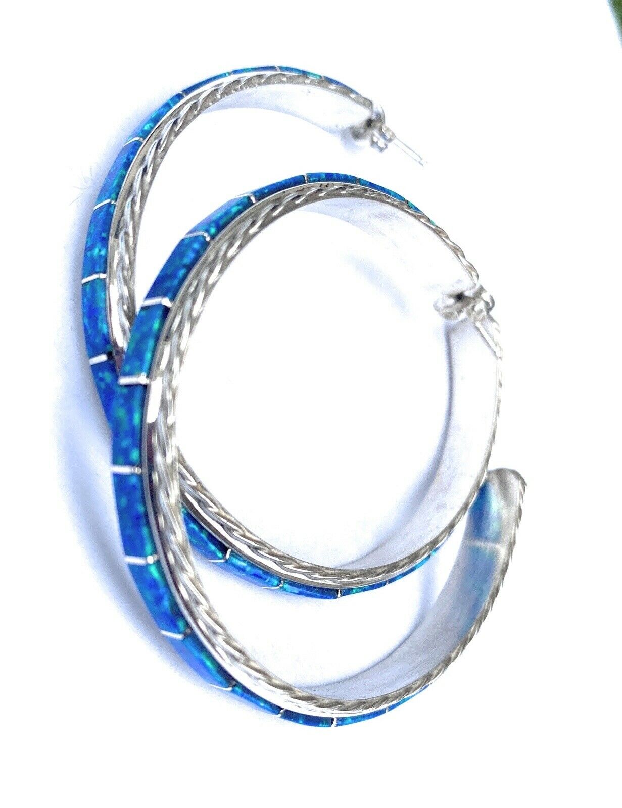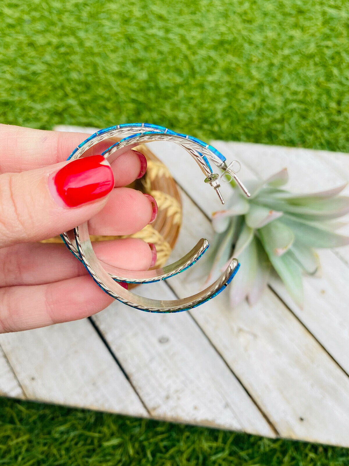 These are a pair of Navajo Sterling Silver and Inlayed Blue Opal Inlay Hoop Earrings. These earrings measure 1 3/4 inches long and just over 1/4 of an inch wide. Signed by the artist. Such a beautiful pair!