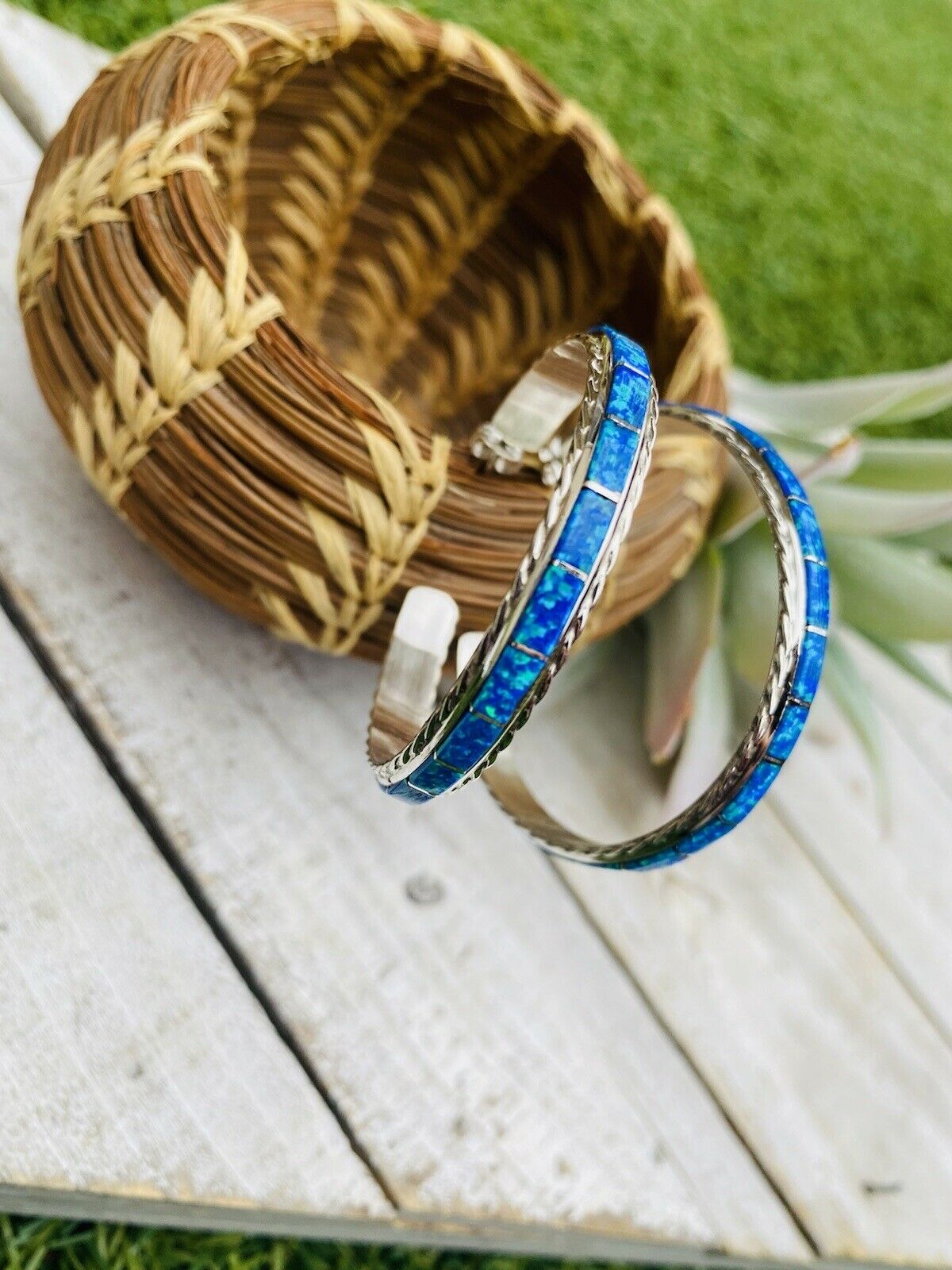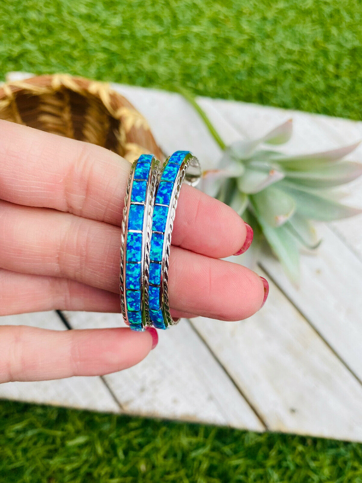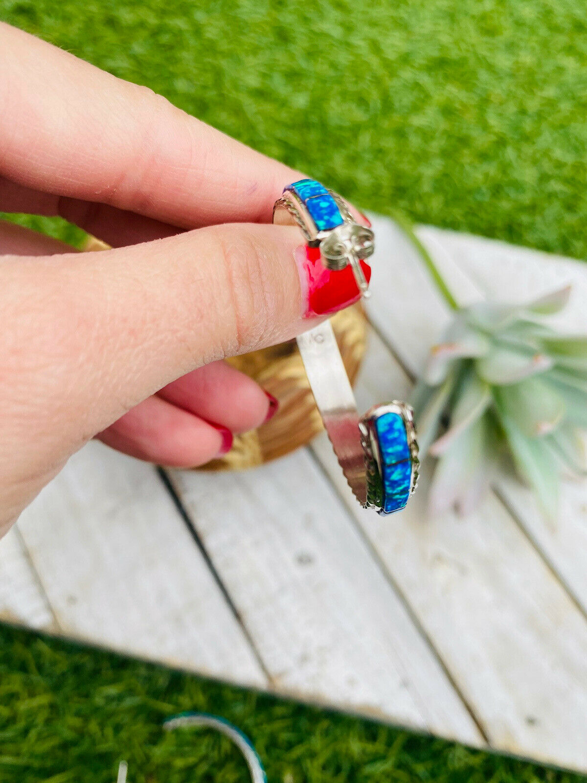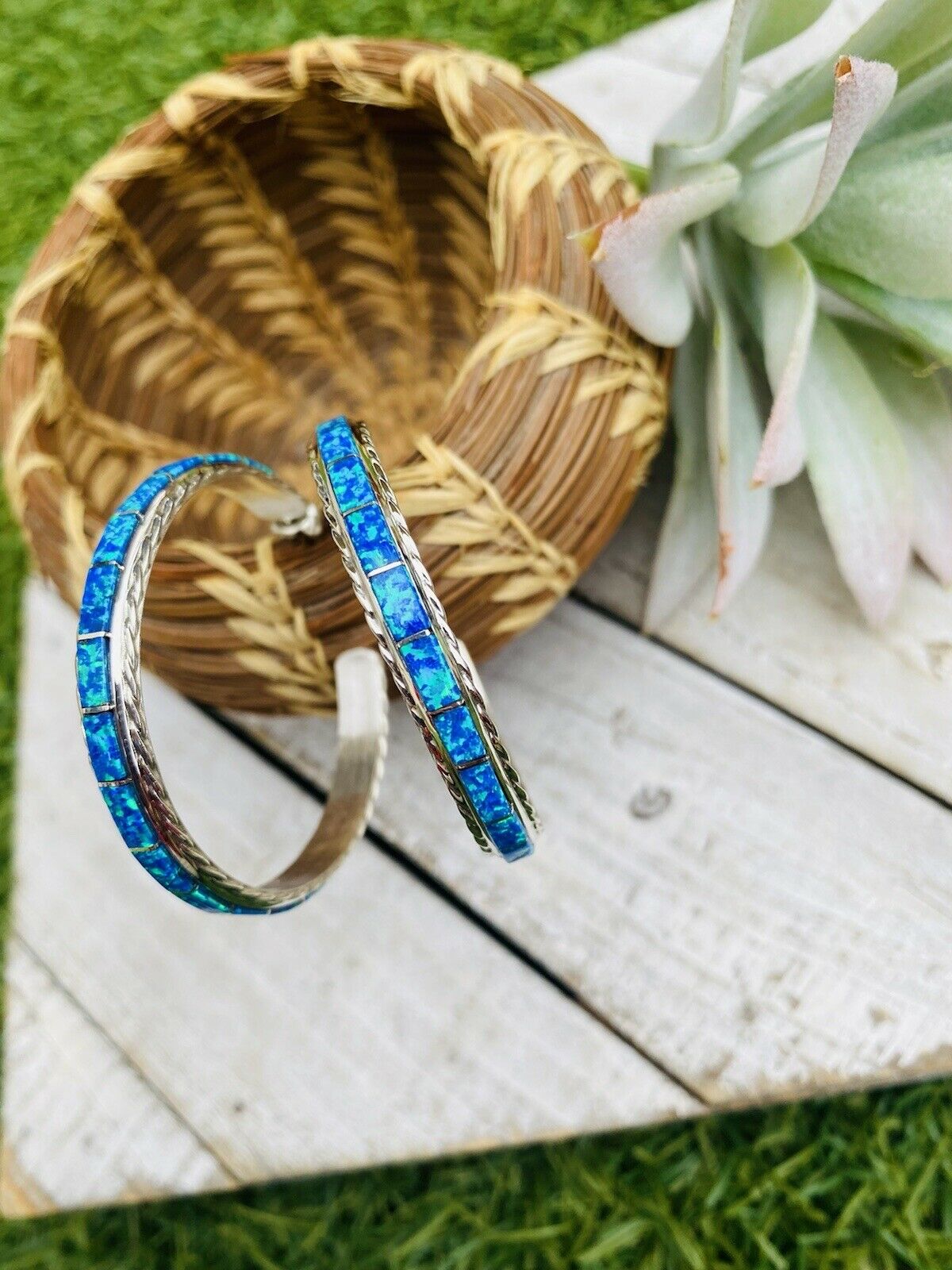 These are a pair of Navajo Sterling Silver and Inlayed Blue Opal Inlay Hoop Earrings. These earrings measure 1 3/4 inches long and just over 1/4 of an inch wide. Signed by the artist. Such a beautiful pair!