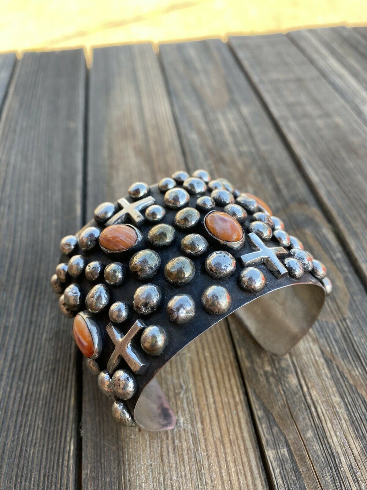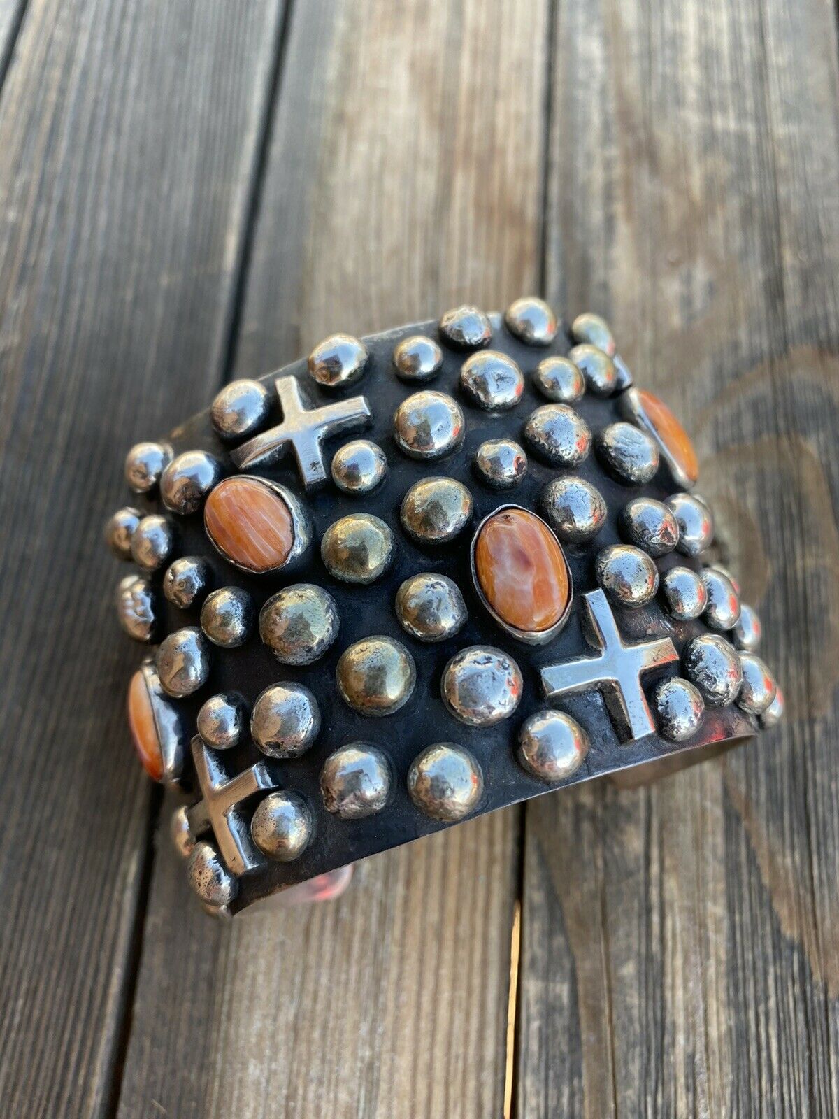 Chimney Butte Sterling Silver & Orange Spiny Ball Cross Cuff. Check out this great Cross Southwest Design. Definitely a signature style by Chimney Butte. Sterling Silver. Cuff has a 5 inch circumference and a 1 1/2 inch gap. Width is 2 inches. A solid timeless beauty. Signed by Artist and stamped Sterling.