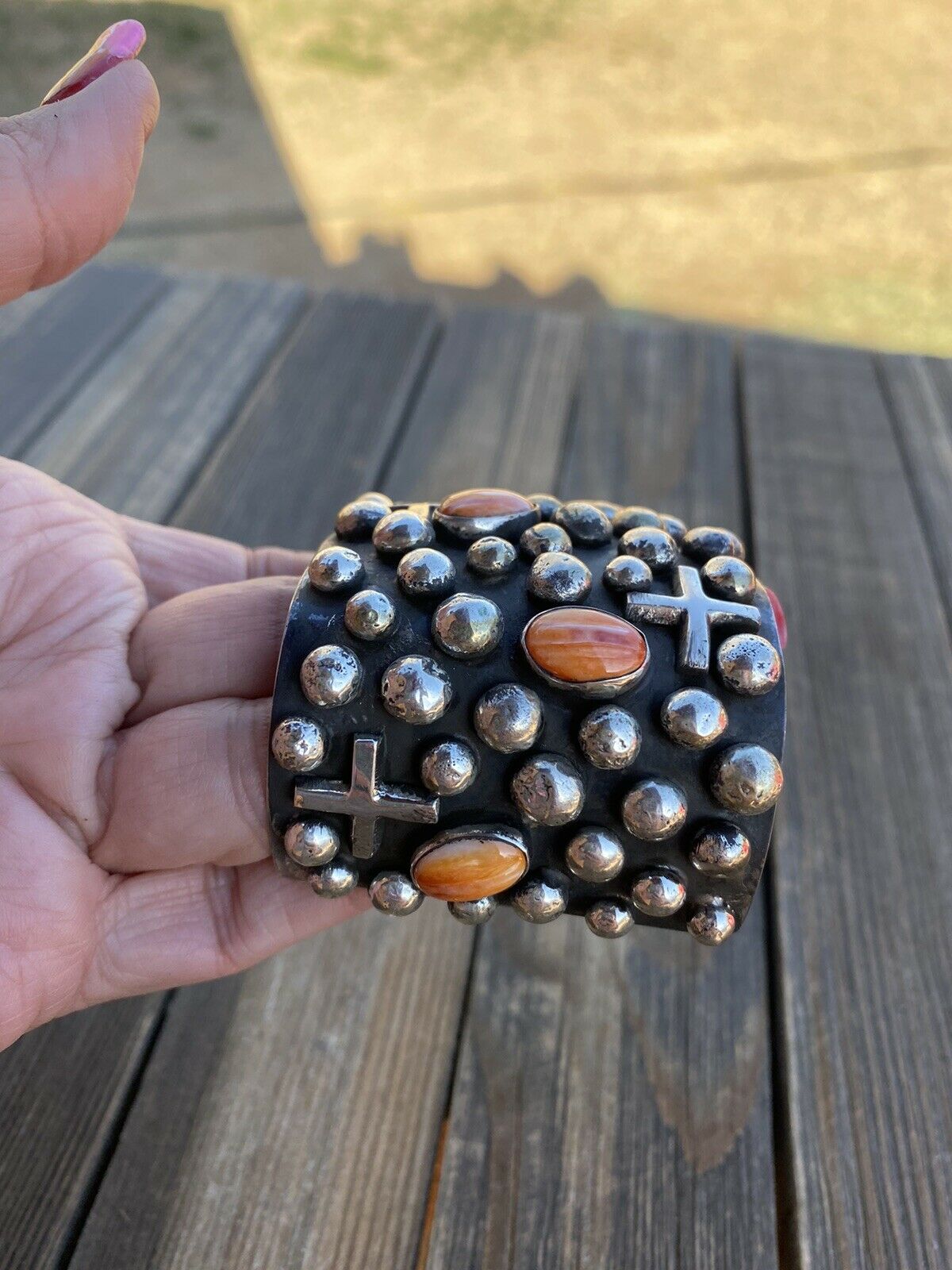 Navajo Sterling Silver & Orange Spiny Cross Bracelet By Chimney Butte Signed