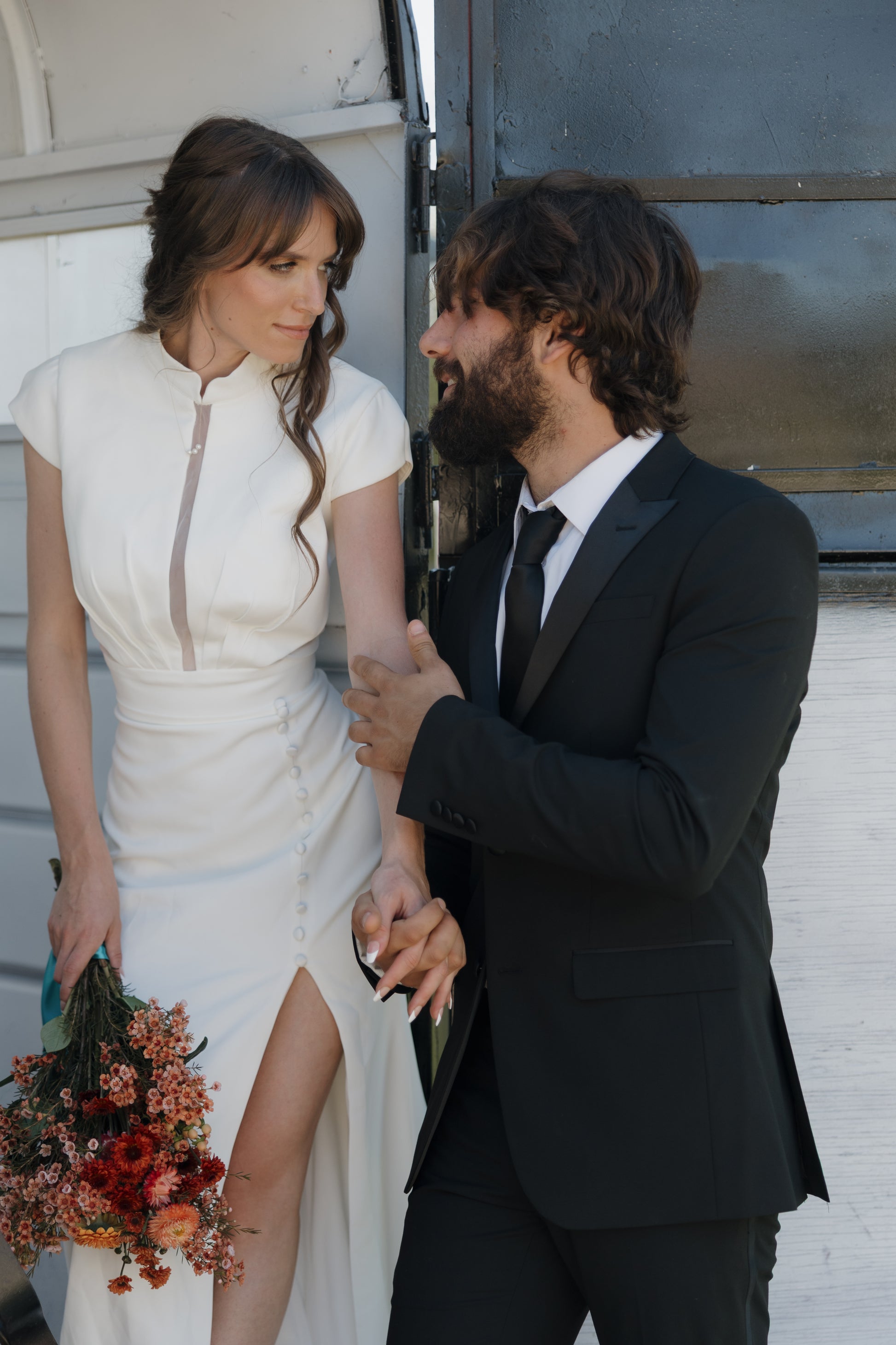 Modern elegance meets timeless sophistication in The Sandra Gown. Crafted from smooth, figure-hugging crepe, this gown features a high neckline with a sheer plunging accent, cap sleeves for a touch of coverage, and a daring front slit with button detailing. The sheer side panels add a hint of allure, while the keyhole back brings a bold, unforgettable finish. Perfect for contemporary brides seeking a clean, minimalist silhouette with just the right amount of drama.