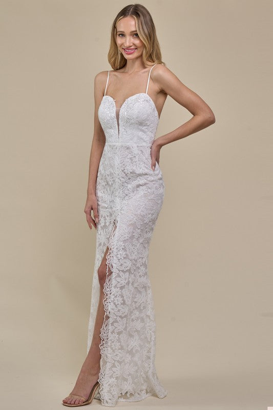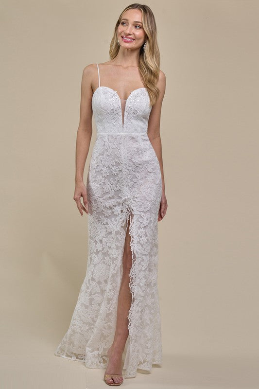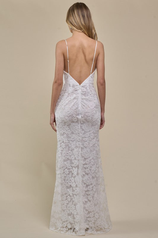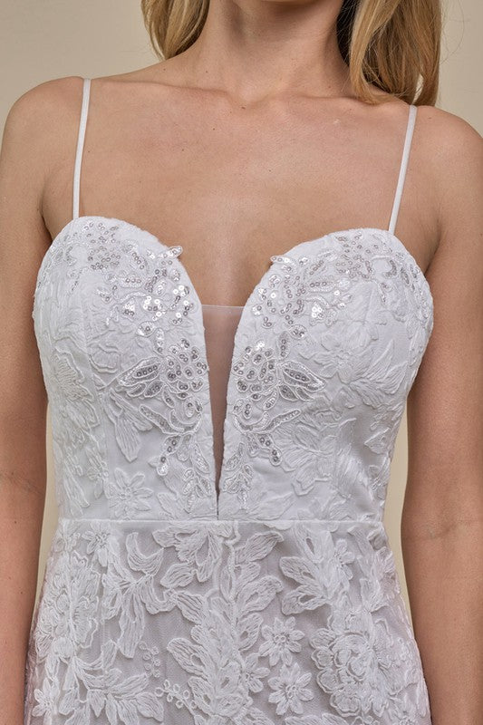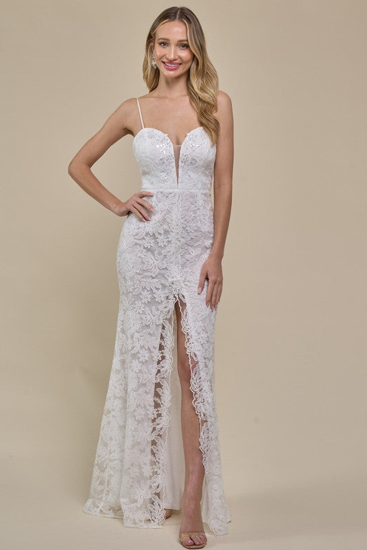 This wedding season, make a bold statement with the Clara! This stunning design stretches the boundaries of fashion and features crochet lace, a front slit, open back, and deep v-neck for maximum impact. The dress is made from 100% polyester and embellished with sequins for an extra touch of glamour. Get ready to shine!