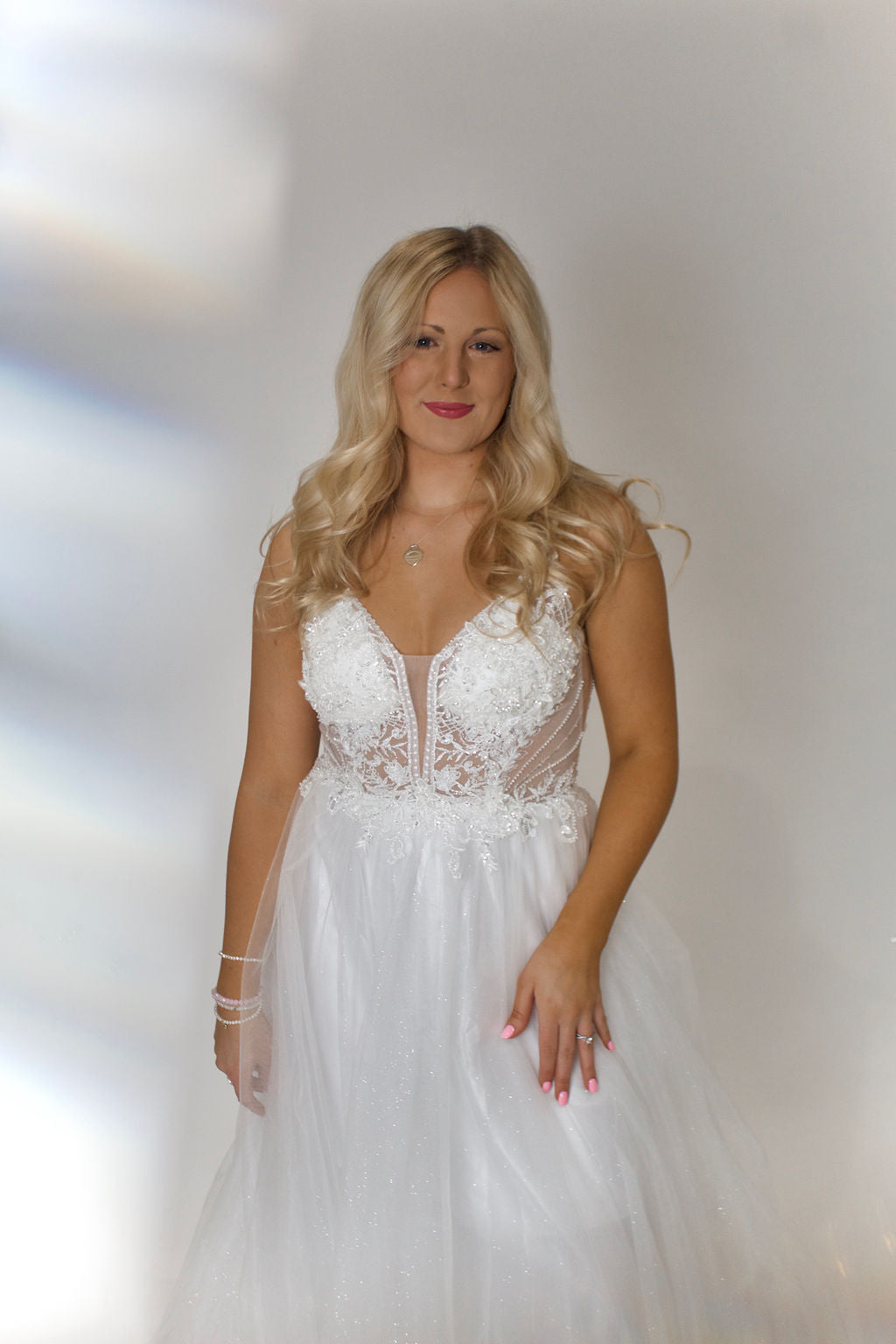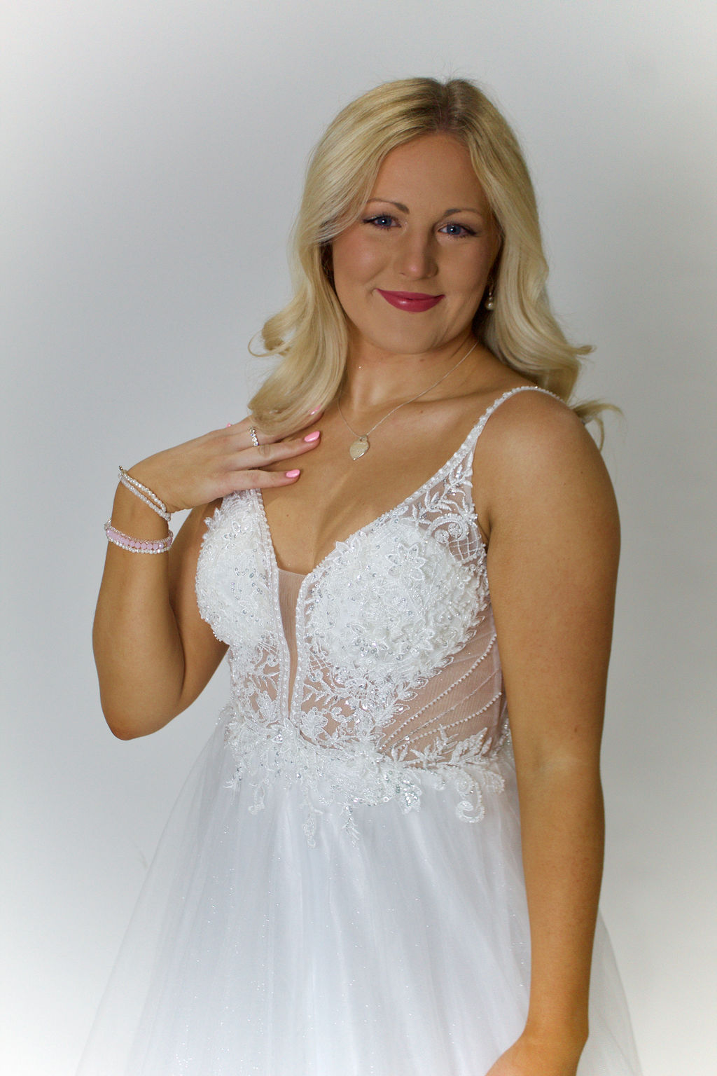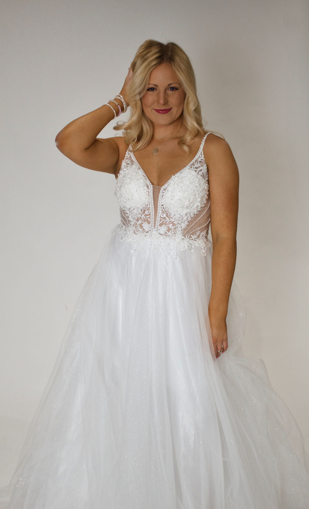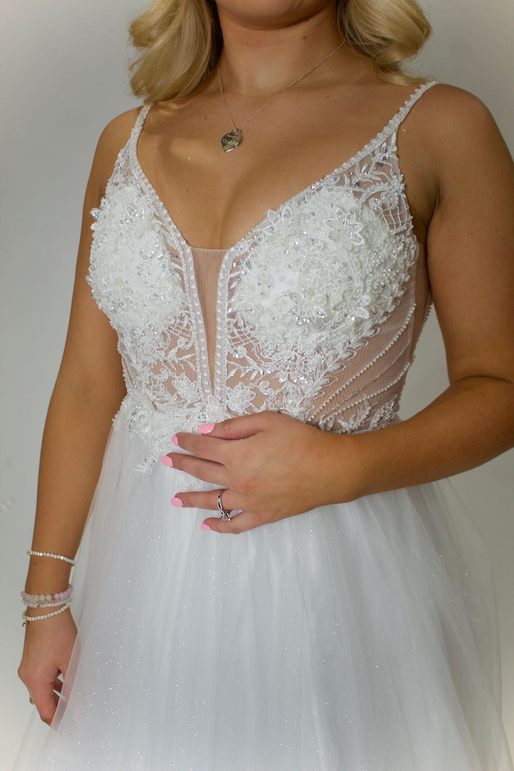 Brimming with femininity, this dress is rendered in soft tulle and features a sculpting bodice embellished with floral lace, delicate beading, and shimmering rhinestone accents that show whispers of skin. The plunging sweetheart neckline is seamlessly suspended from narrow straps that descend into a deep “V” at the back. Illusion side panels have a cinching effect at the waist and give way to a floor-length skirt cut from alternating layers of solid and glittered tulle with a train that sweeps the floor.