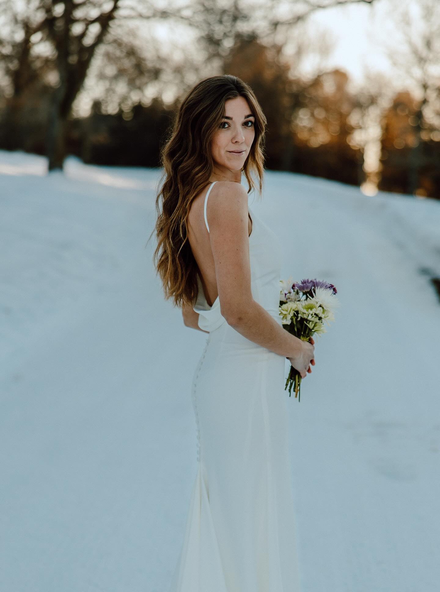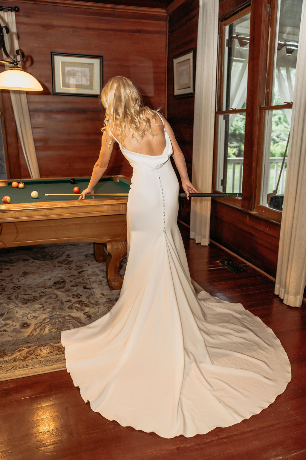 Crepe gown with V neckline, thin straps, cowl low back and buttons down the zipper.