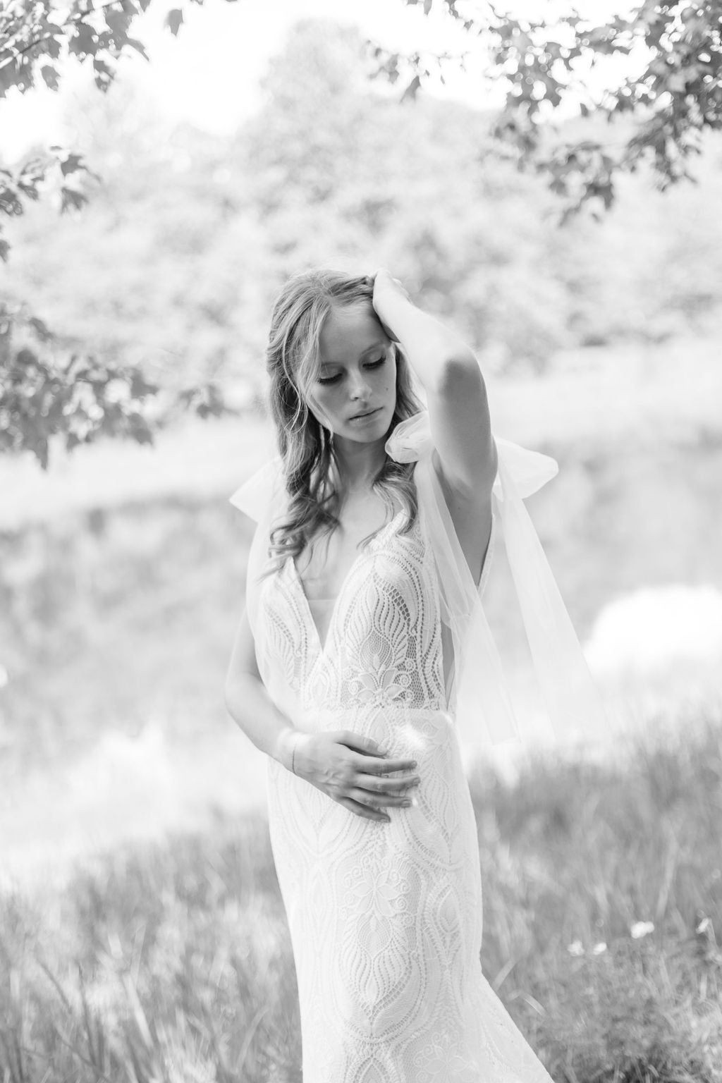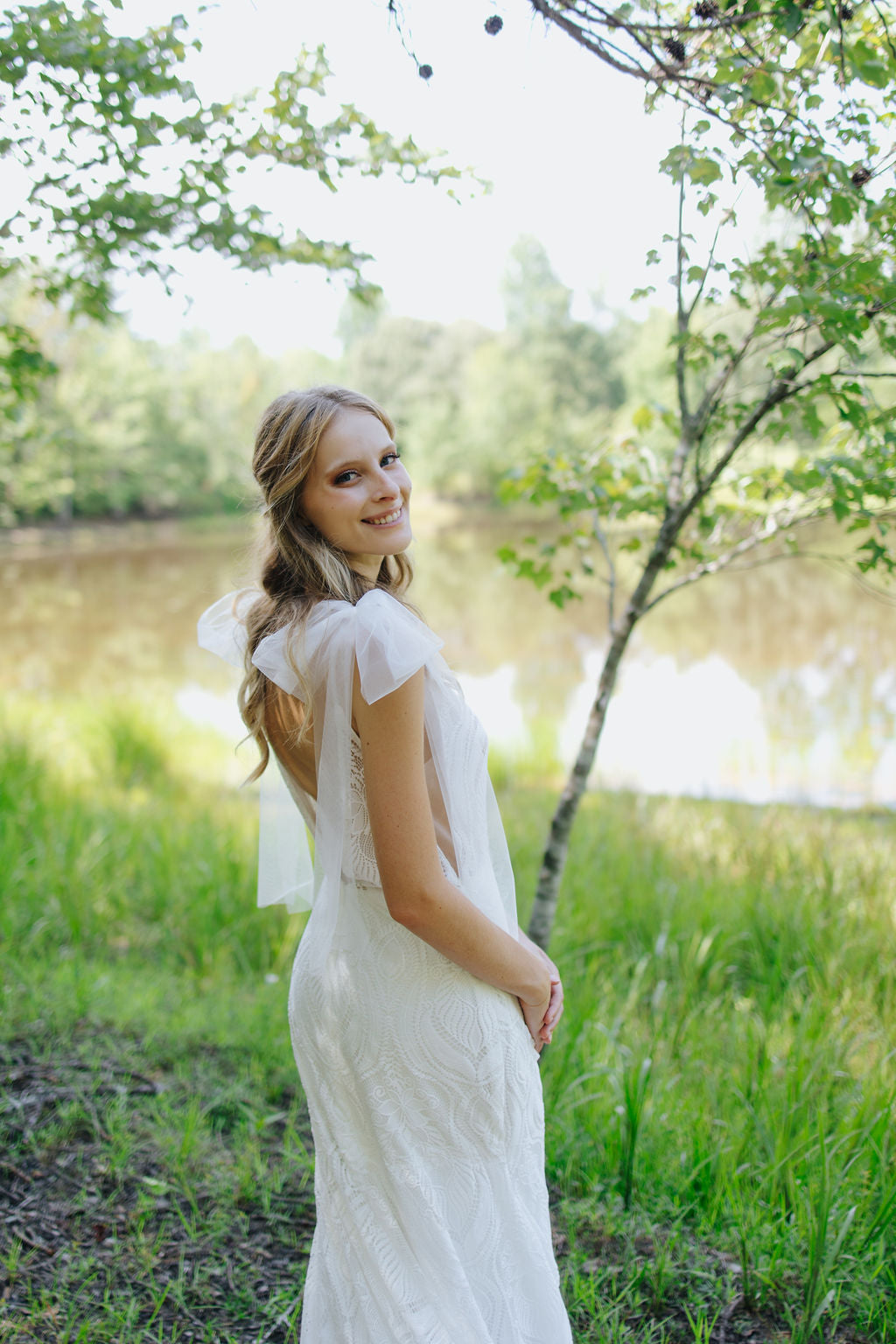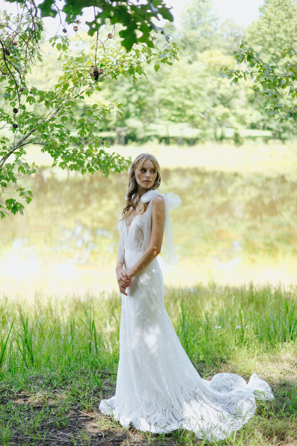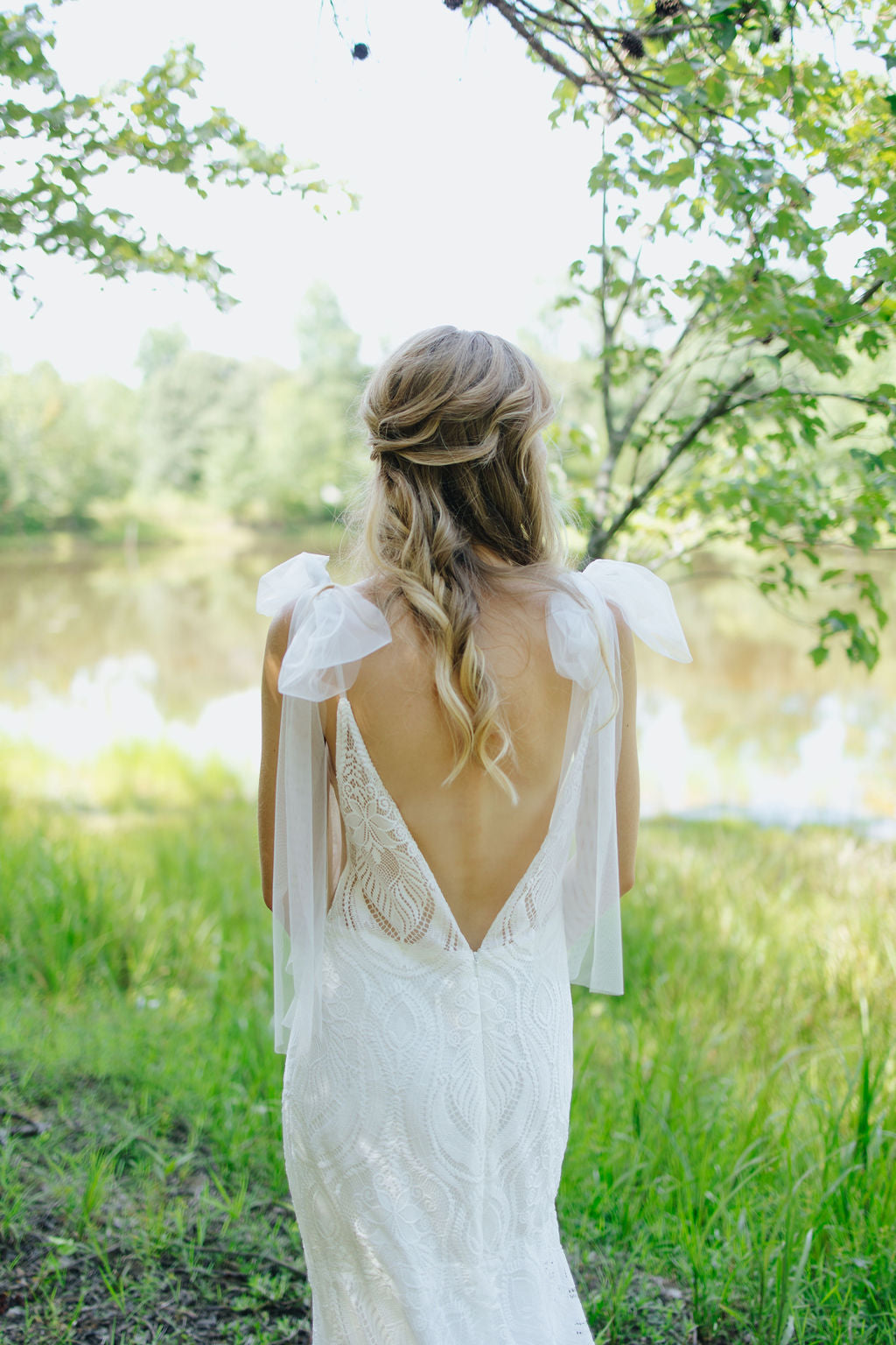 A crepe princess seam gown with the modified keyhole open back, thin straps, and buttons all the way down the train. The bows are detachable allowing for a simple outfit change between your ceremony and reception. The top can be lined upon request.