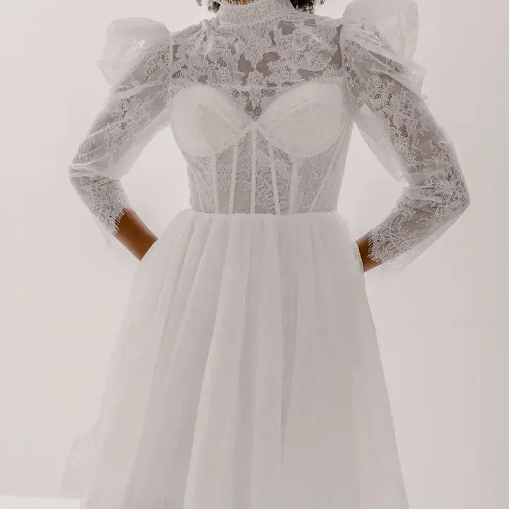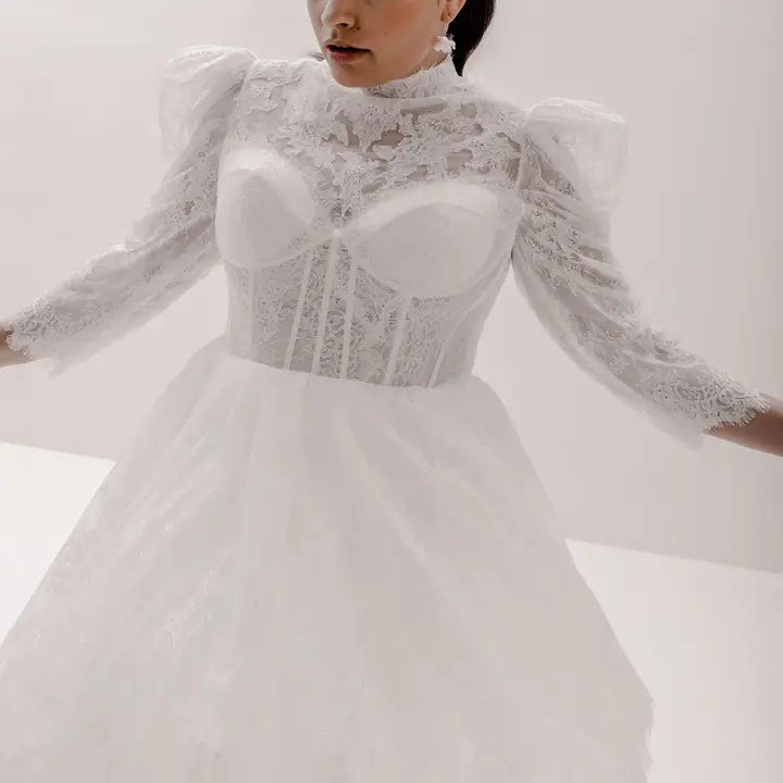 A timeless marvel of delicate Chantilly lace. With exposed boning on the bodice and a high neckline, this dress effortlessly combines classic beauty and modern style.
