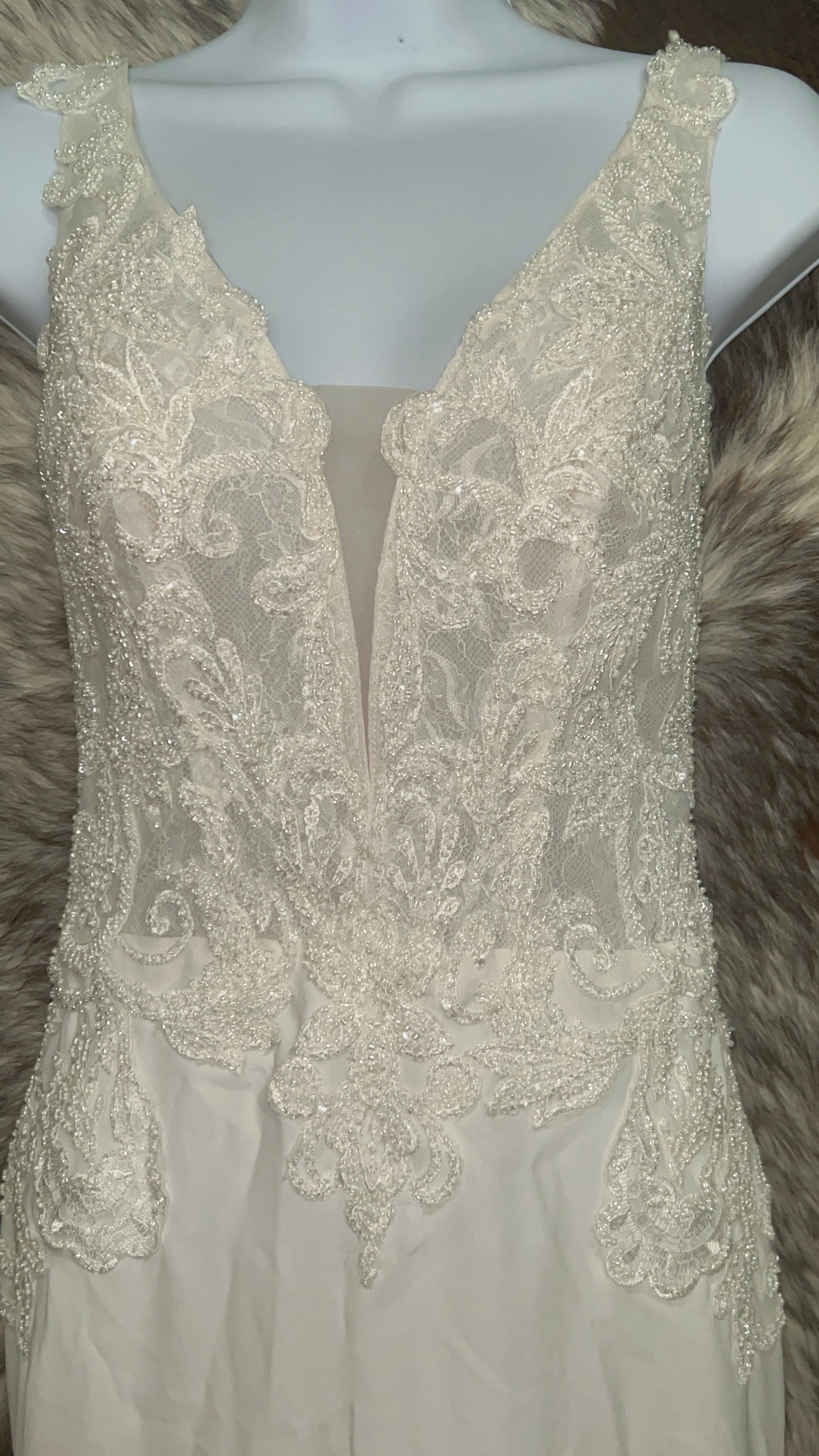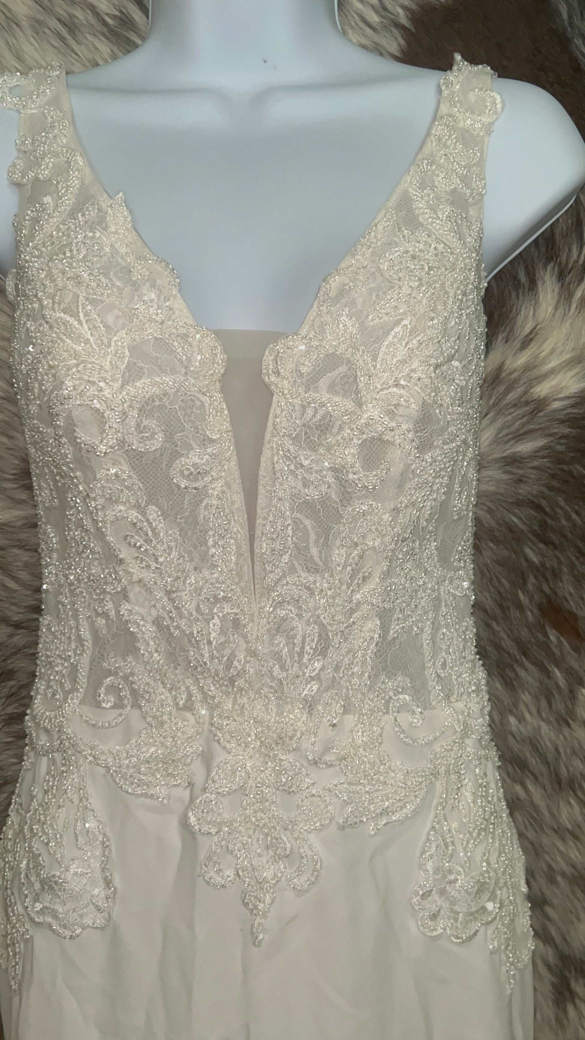 This gown can be ordered in white, ivory, or black and is available in sizes 2-30