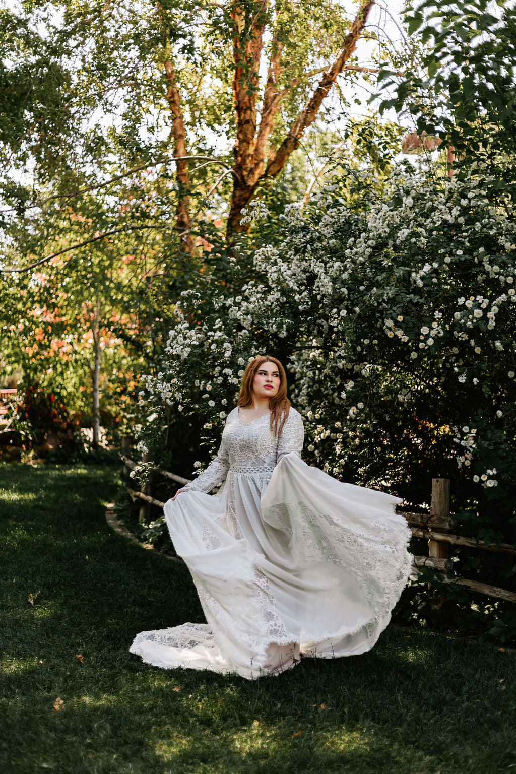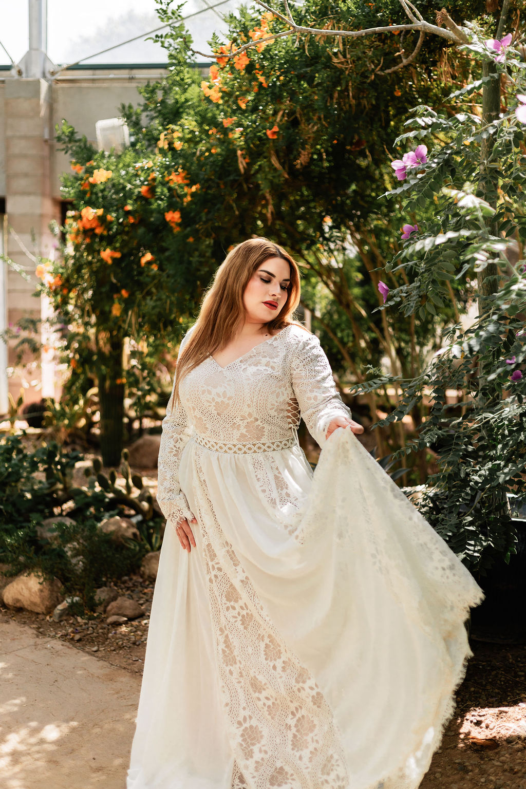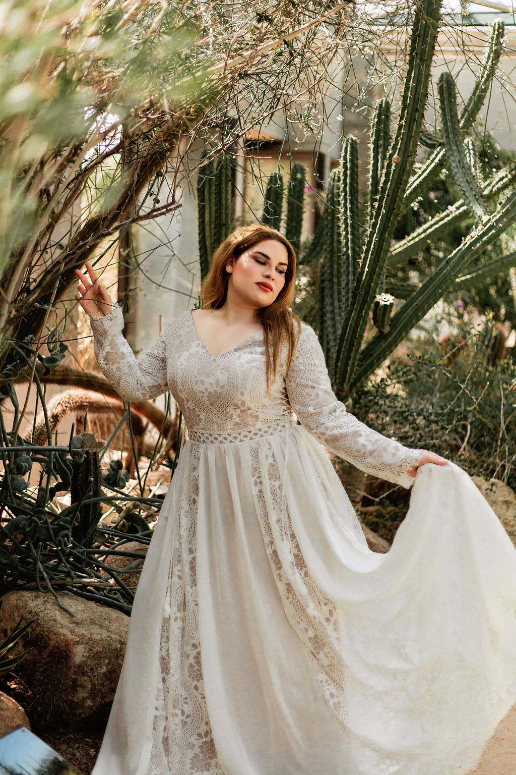 This Boho A Line Long Sleeve Floral Pattern Lace Wedding Dress is perfect for the bride who wants to embrace her Bohemian side. The Rustic, Long Sleeve Lace top adds a touch of vintage charm, while the Flowy Chiffon skirt gives the dress a natural and effortless look. The combination of Lace and Chiffon creates a dreamy, romantic look that is perfect for an outdoor, Rustic or Boho-themed wedding. Whether you're exchanging vows in a garden or on a beach, this Bohemian, Rustic, Long Sleeve Lace and Chiffon Wedding Dress is sure to make you feel like a true Bohemian goddess.