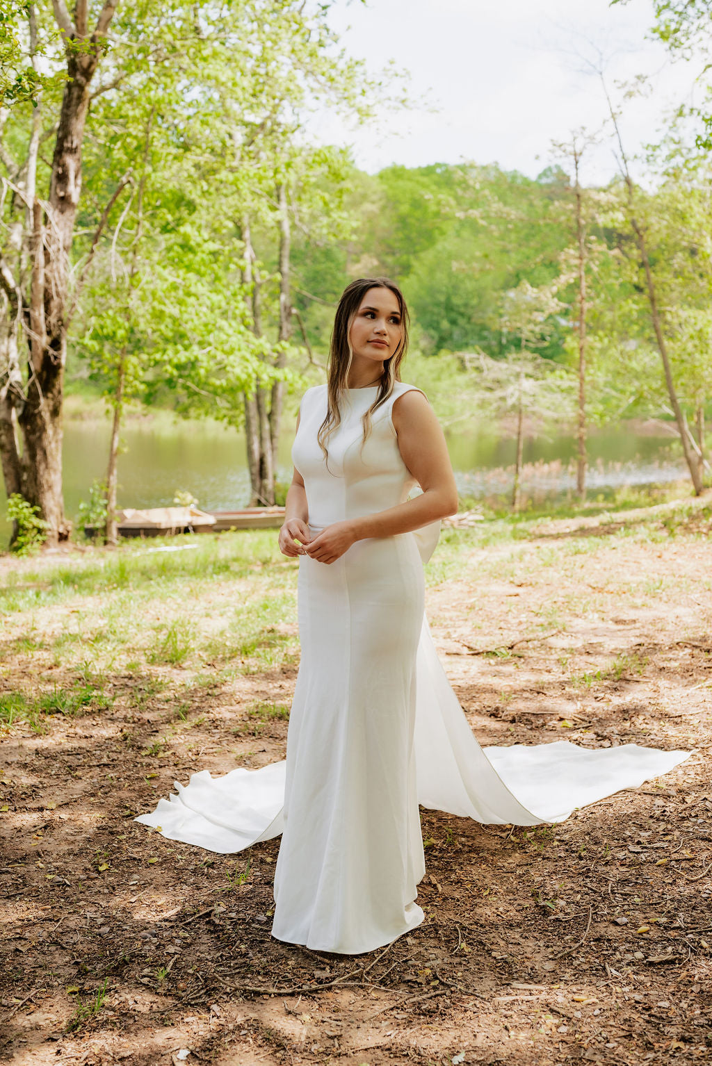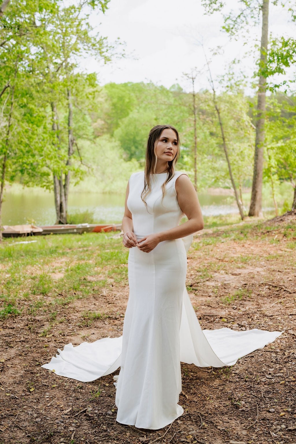Crepe high neck fit and flair with square low back and nude sheer side panels. The sheer panels can be filled upon request.