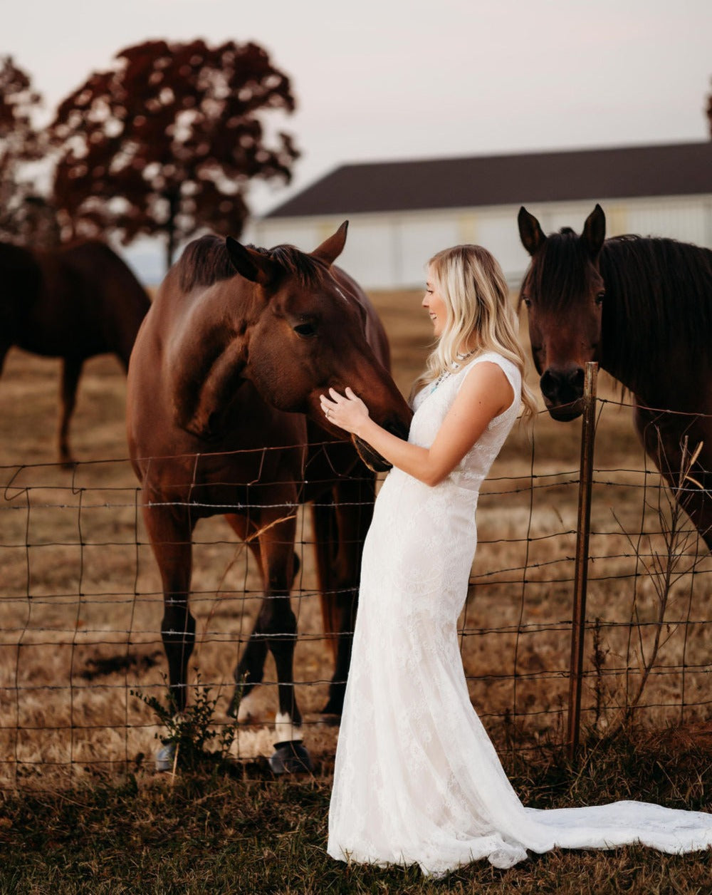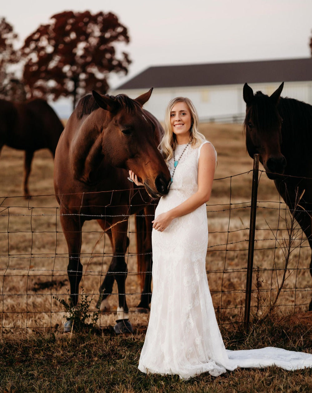 This gown can be ordered in white, ivory, or black and is available in sizes 2-30