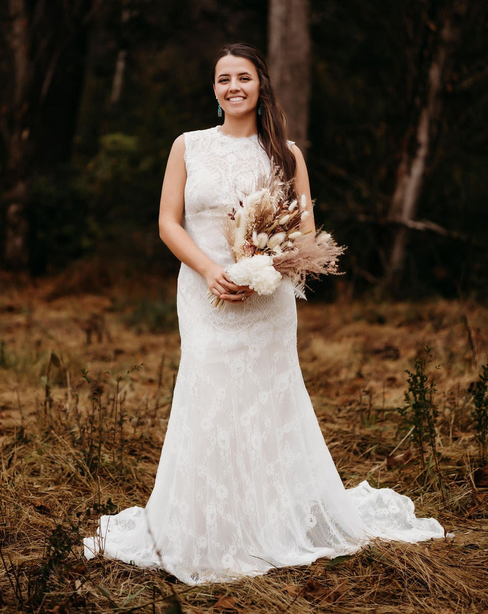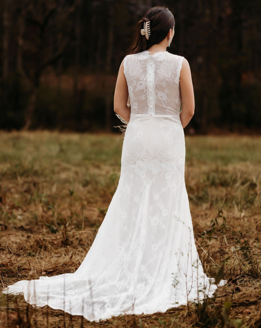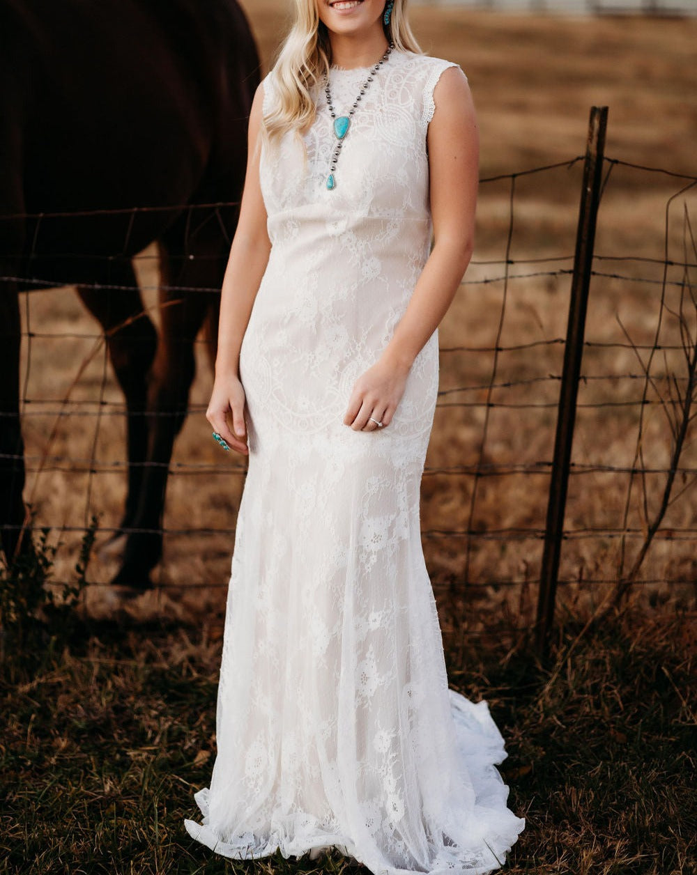 All over Chantilly lace with high neckline and full lace illusion back. Zipper closer with pearl buttons